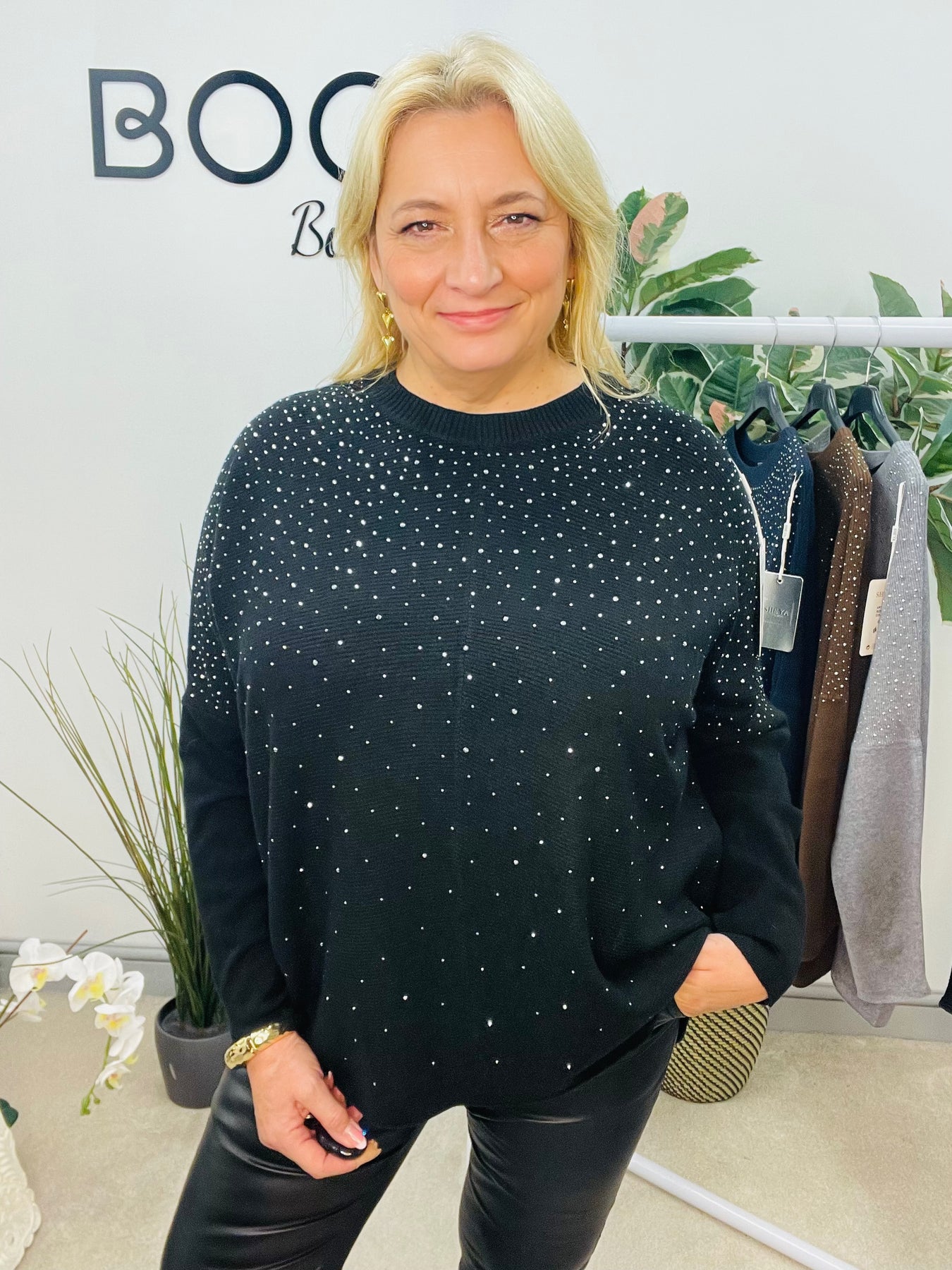 LADIES LOOSE FIT DIAMANTE OVERSIZE JUMPER - BLACK, GREY, NAVY, BROWN