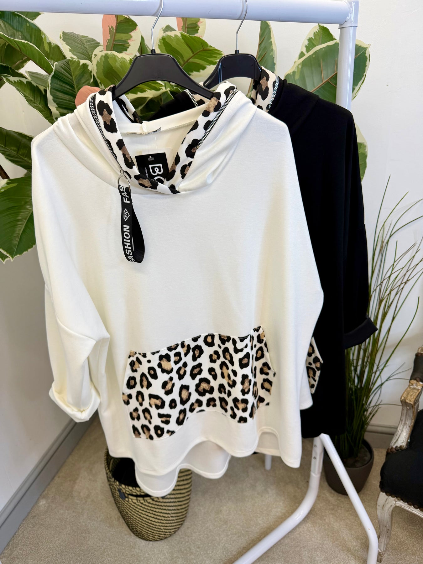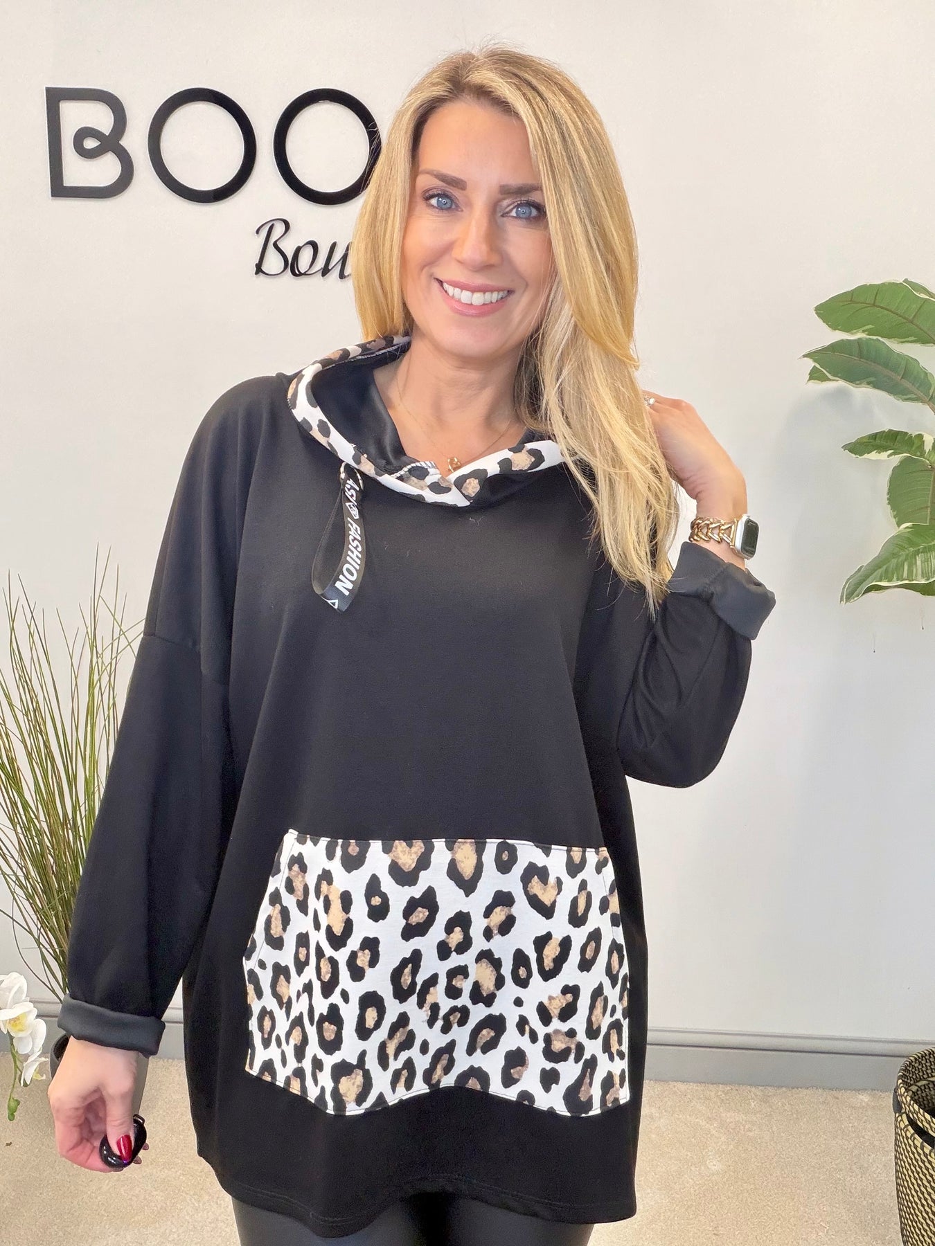 Elevate your style with the CALEY top in soft scuba fabric. The loose fit sweatshirt style is perfect for everyday wear, while the leopard print edge hood and kangaroo pouch pocket add a touch of wildness. Available in two versatile colours and one size that fits sizes 10 to 18