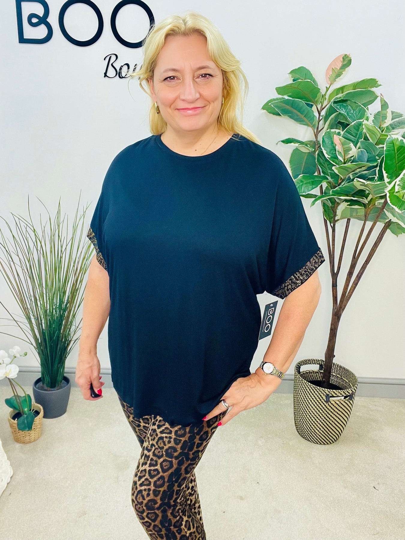 "The PIPPA black top is a stylish and comfortable jersey t-shirt with a loose fit. The leopard diamanté edging on the sleeves adds a touch of elegance to this versatile piece. Perfect for any occasion, this top is a must-have in your wardrobe."