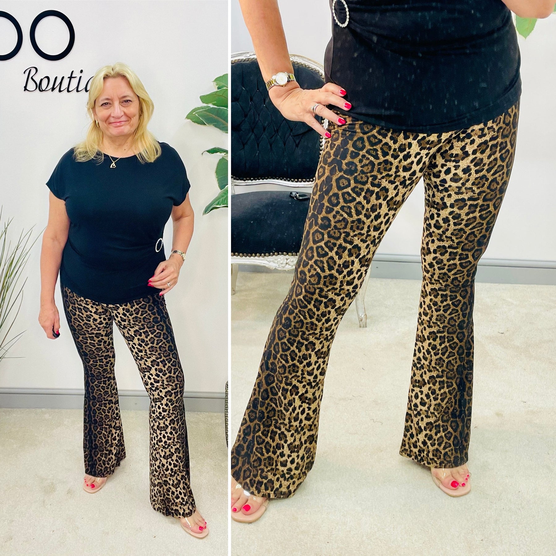 Effortlessly elevate your wardrobe with The WILD leopard print flare trousers. Made with a stretch fabric, these flared leggings provide both style and comfort. Embrace the animal print trend with a flattering fit and ultimate comfort. Perfect for any occasion, these trousers are a must-have for any fashion-forward individual.