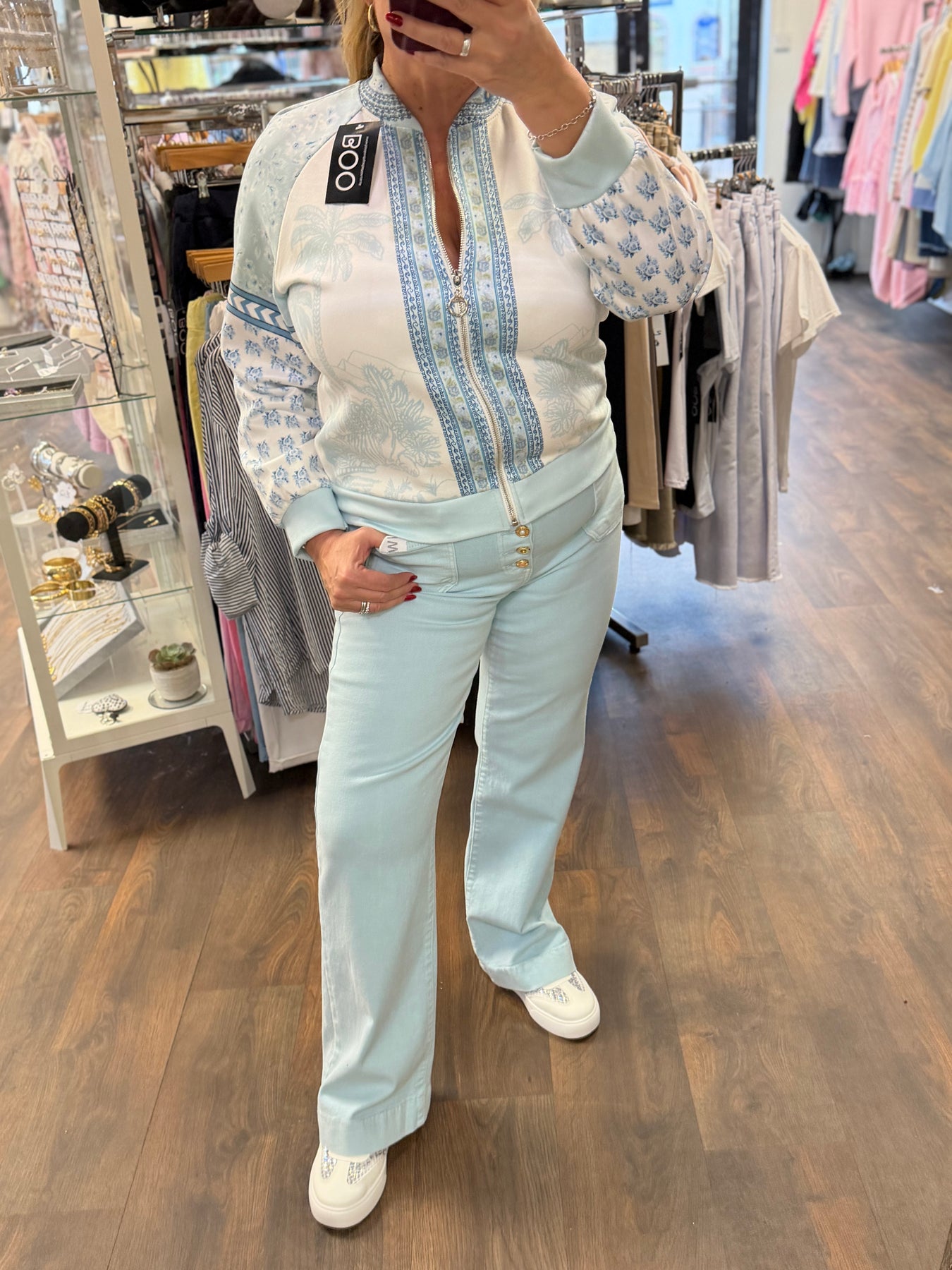 Ladies Palm Print Bomber Fashion Jacket - mint and blue