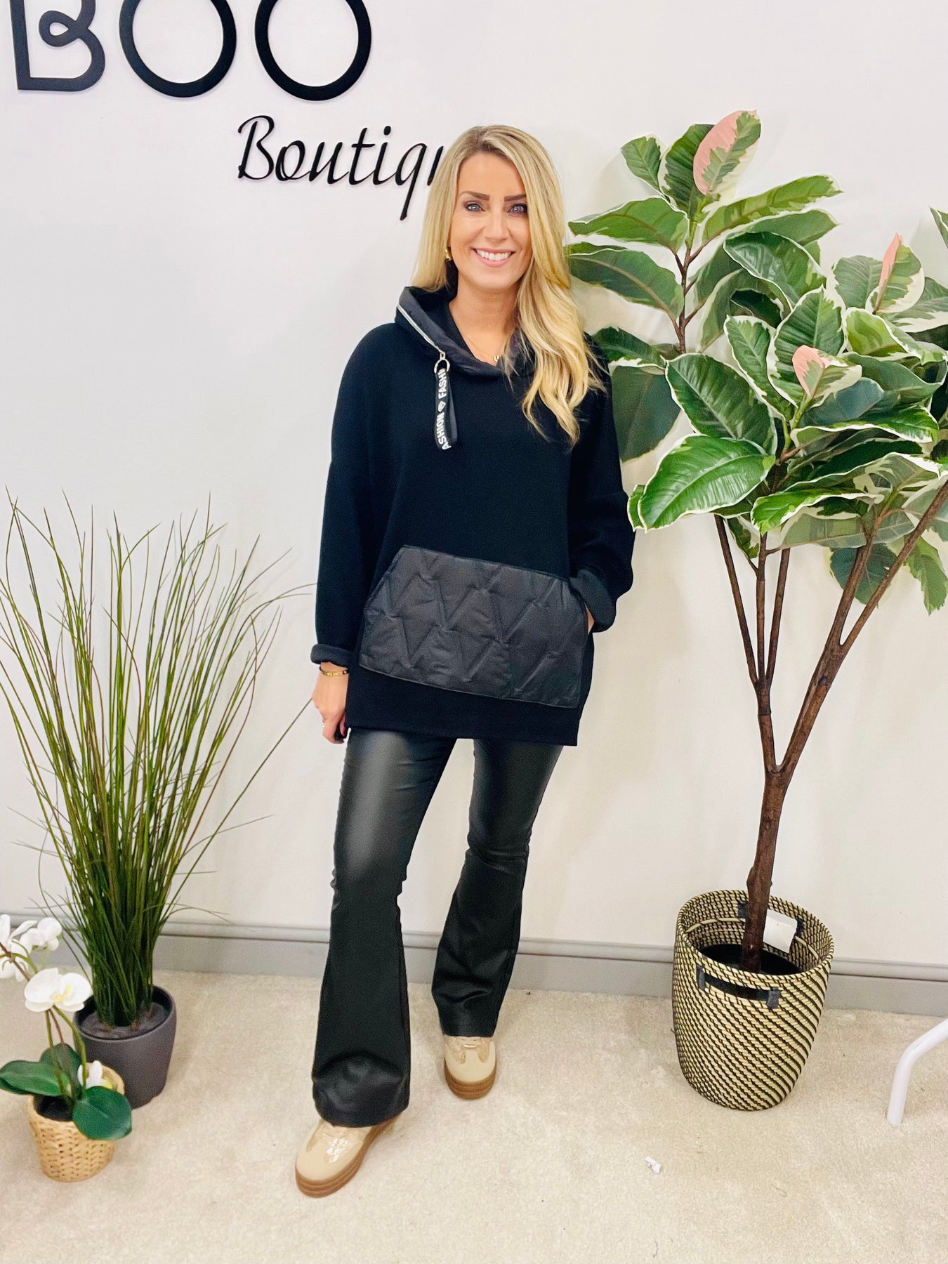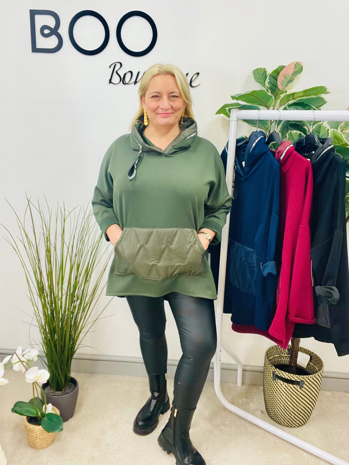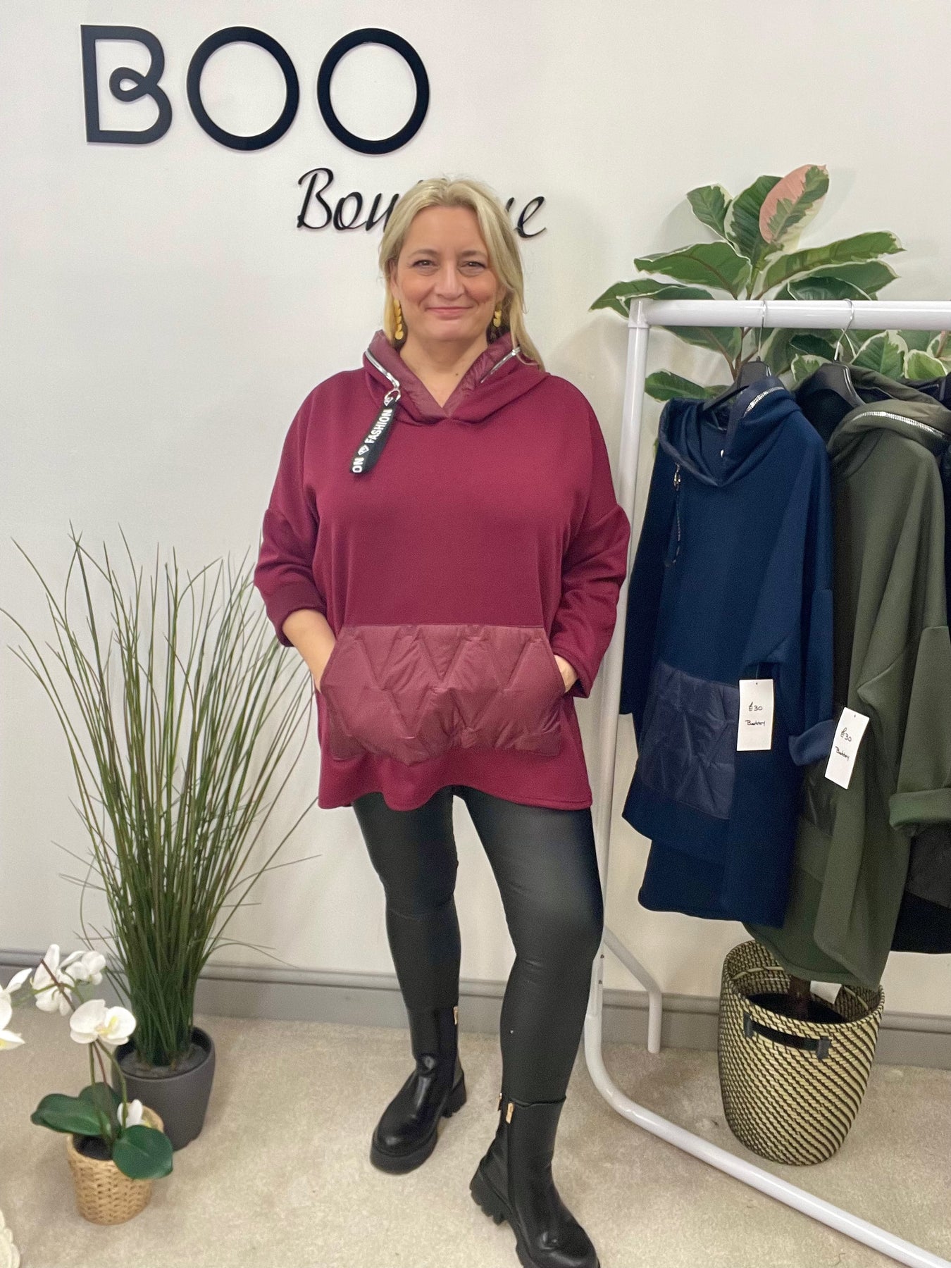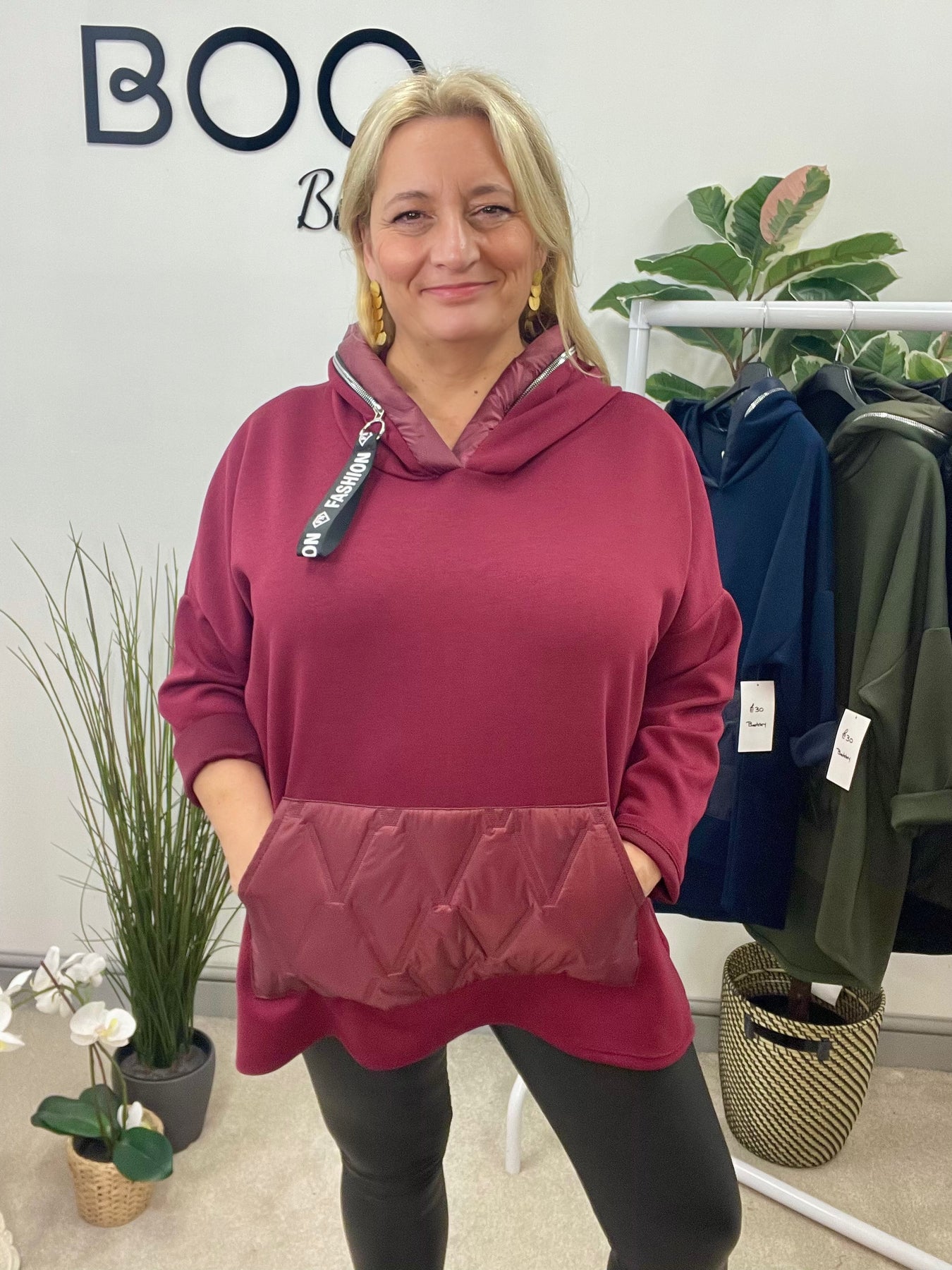 The BETTY top offers a casual yet stylish look with its scuba sweatshirt design and quilted kangaroo pocket. Available in 4 different colours, this top is perfect for sizes 8 to 18. Stay comfortable and fashionable with this versatile piece.