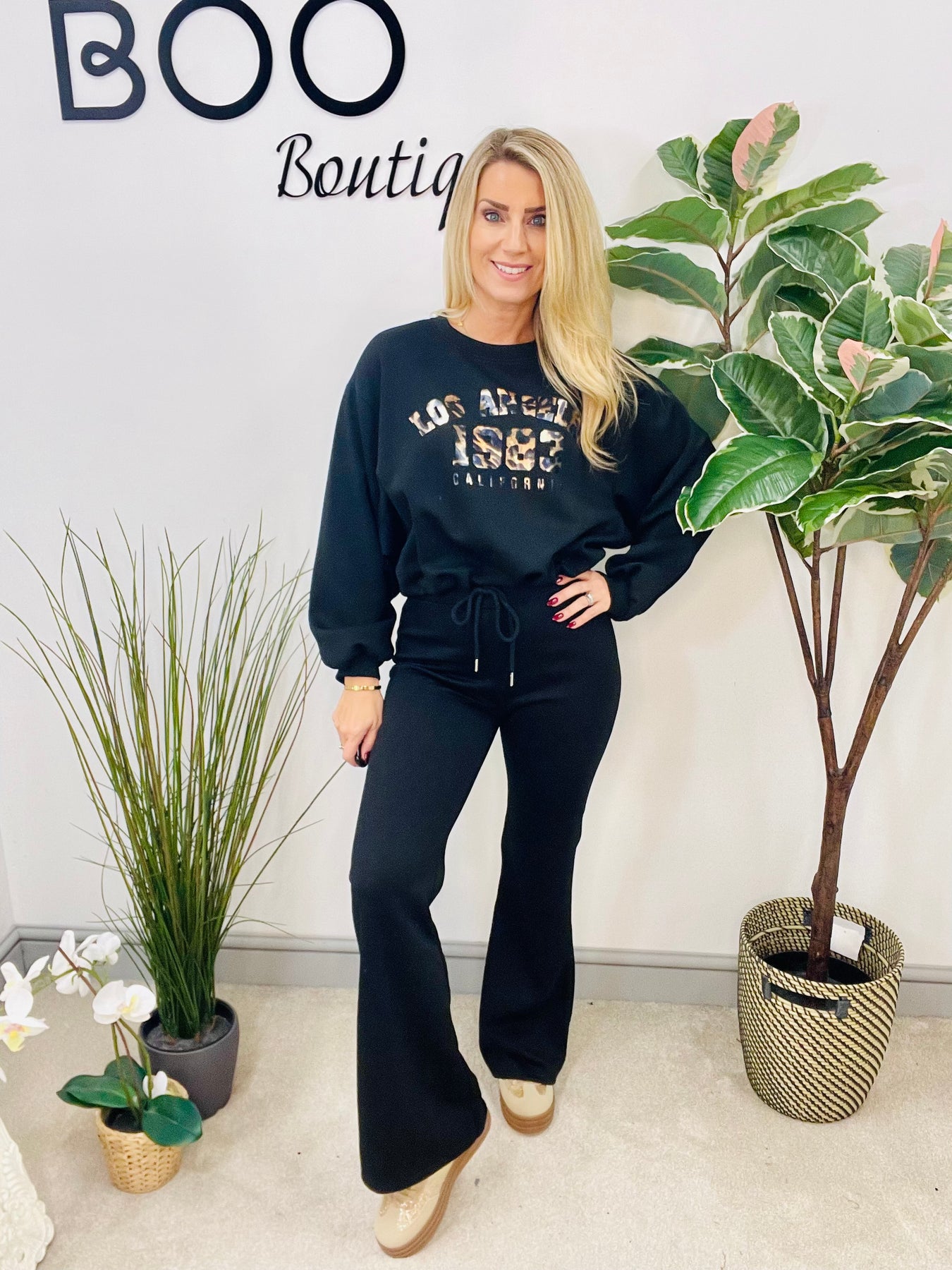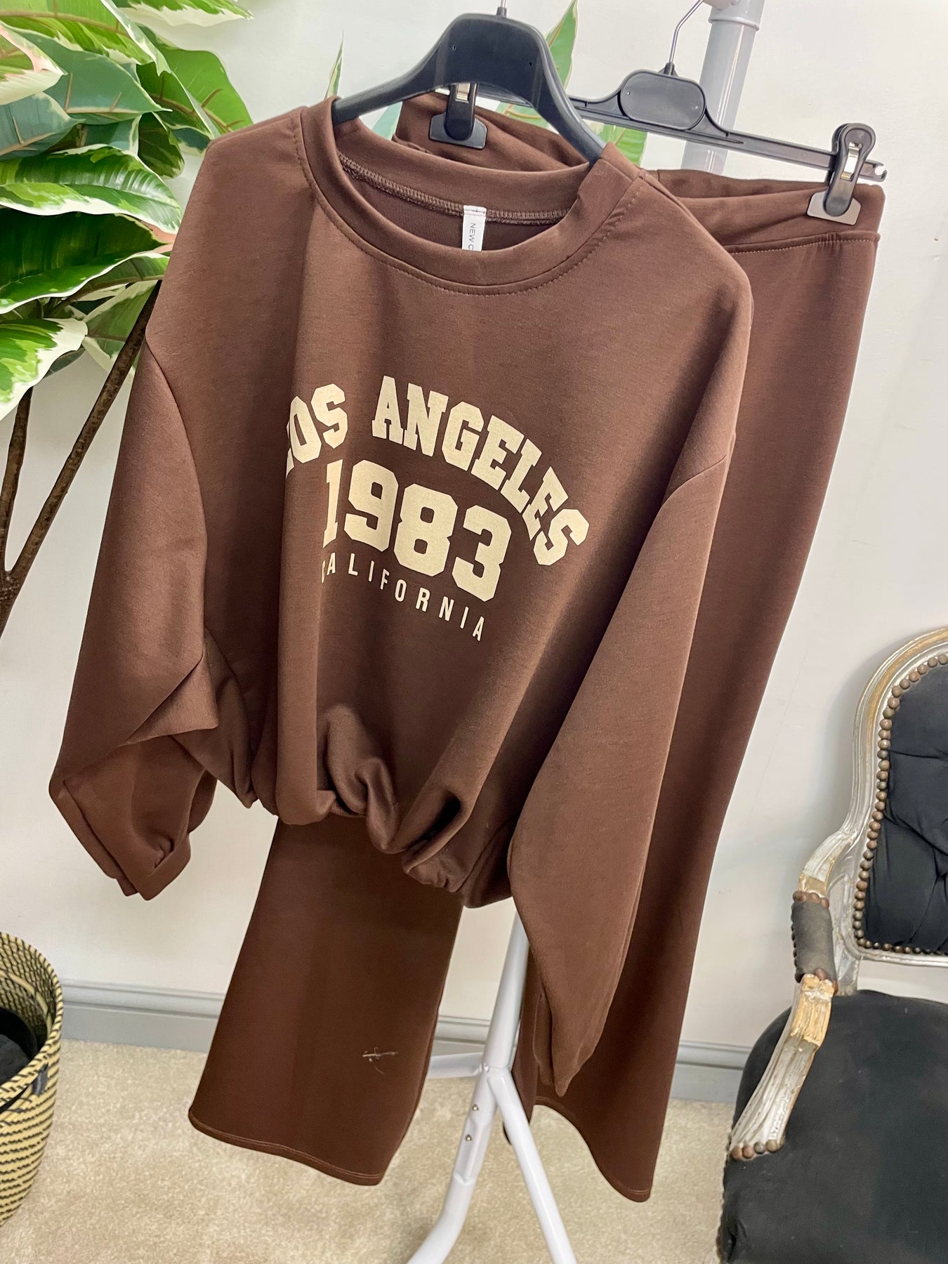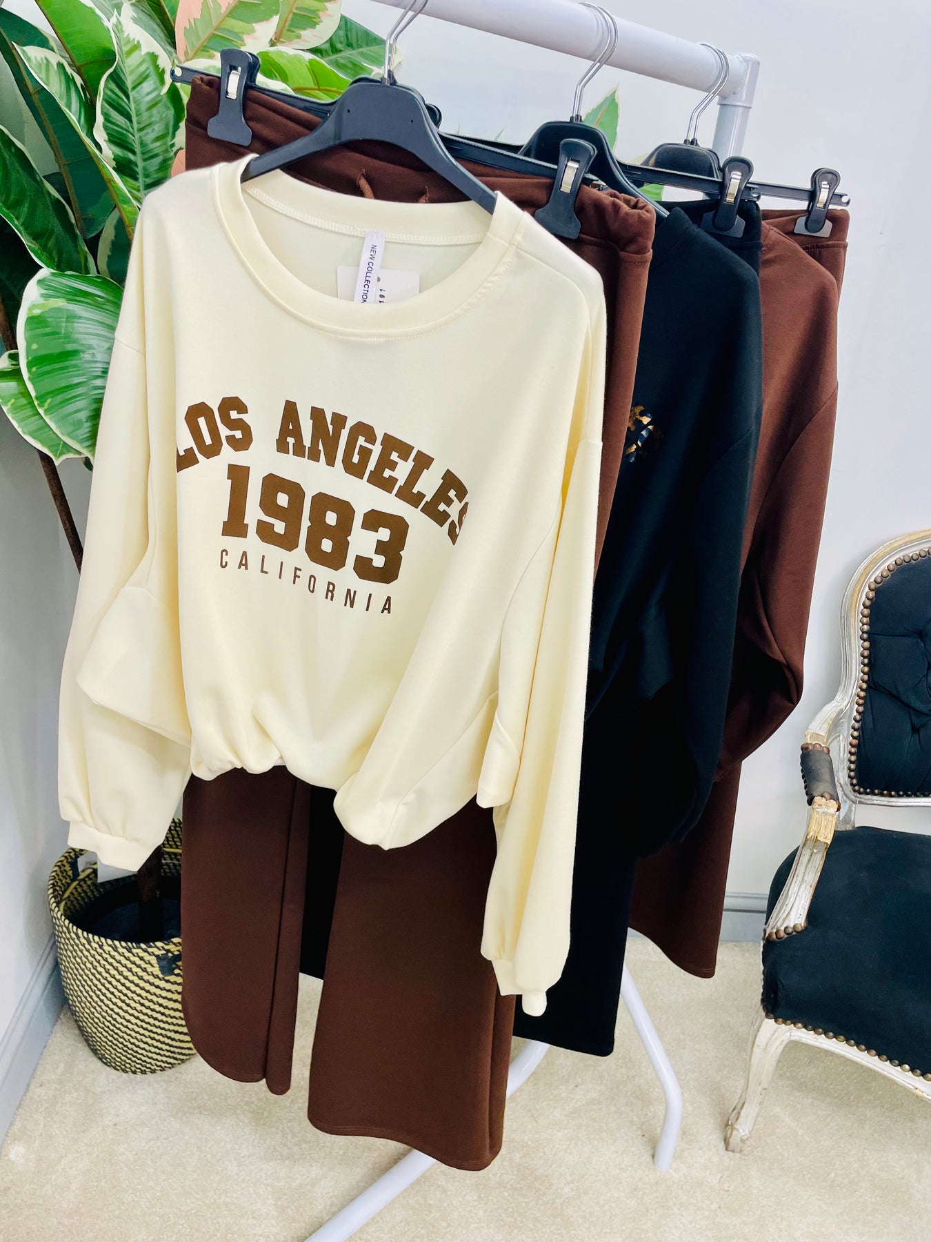 The CATE trouser co ord is the perfect on-trend set for any occasion. Featuring an elasticated blouson top with the iconic LOS ANGELES logo and flared leg trousers, this co ord offers both comfort and style. It is one size fits all, fitting sizes 8 to 12/14. Elevate your wardrobe with this versatile and chic ensemble.