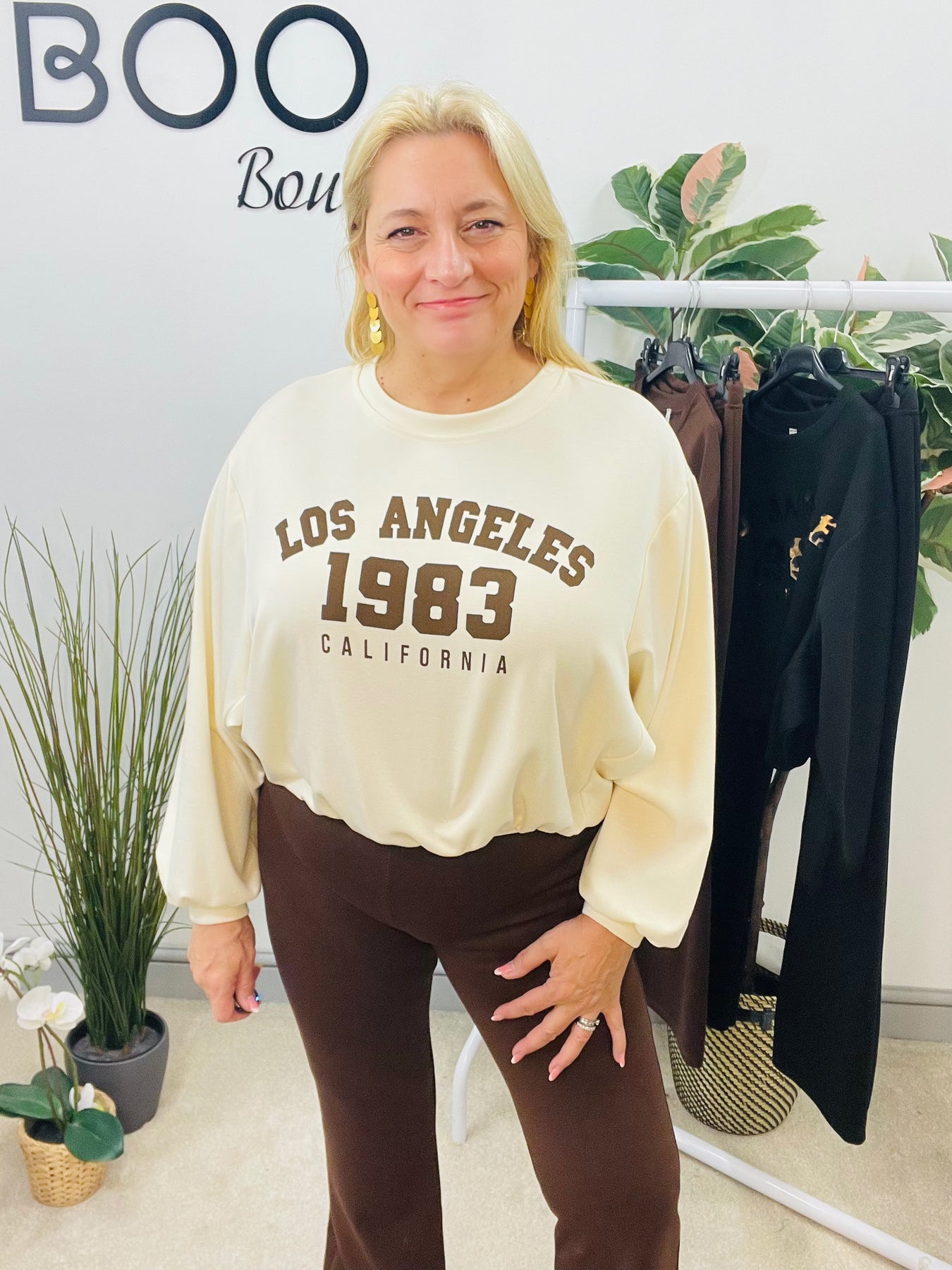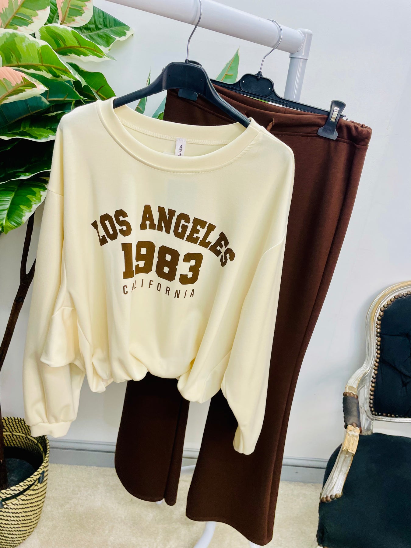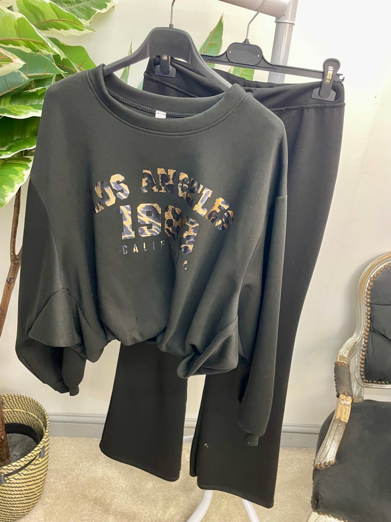 The CATE trouser co ord is the perfect on-trend set for any occasion. Featuring an elasticated blouson top with the iconic LOS ANGELES logo and flared leg trousers, this co ord offers both comfort and style. It is one size fits all, fitting sizes 8 to 12/14. Elevate your wardrobe with this versatile and chic ensemble.