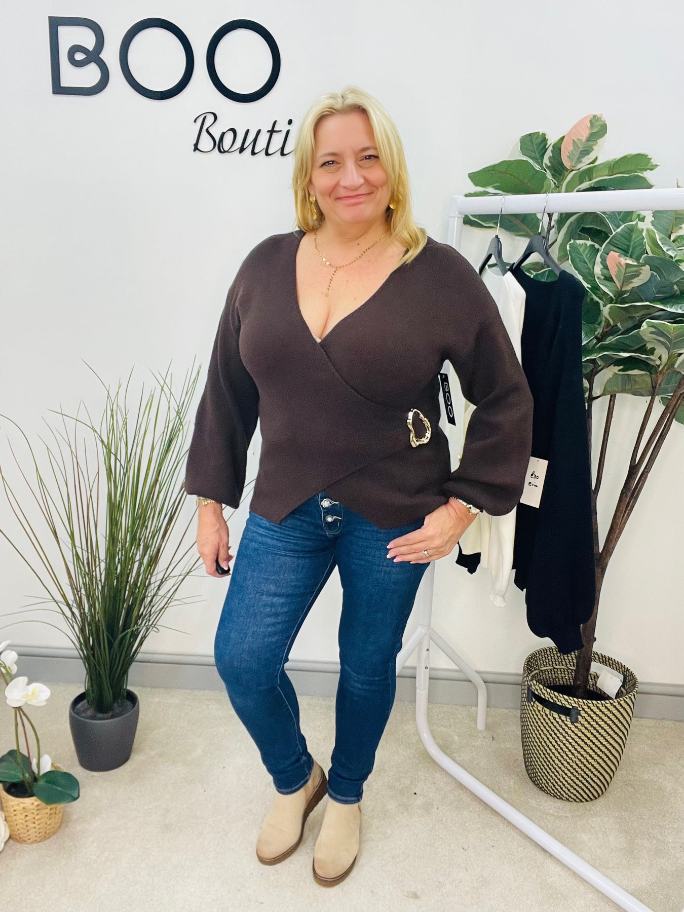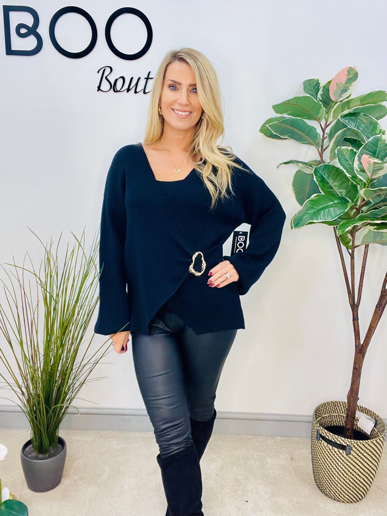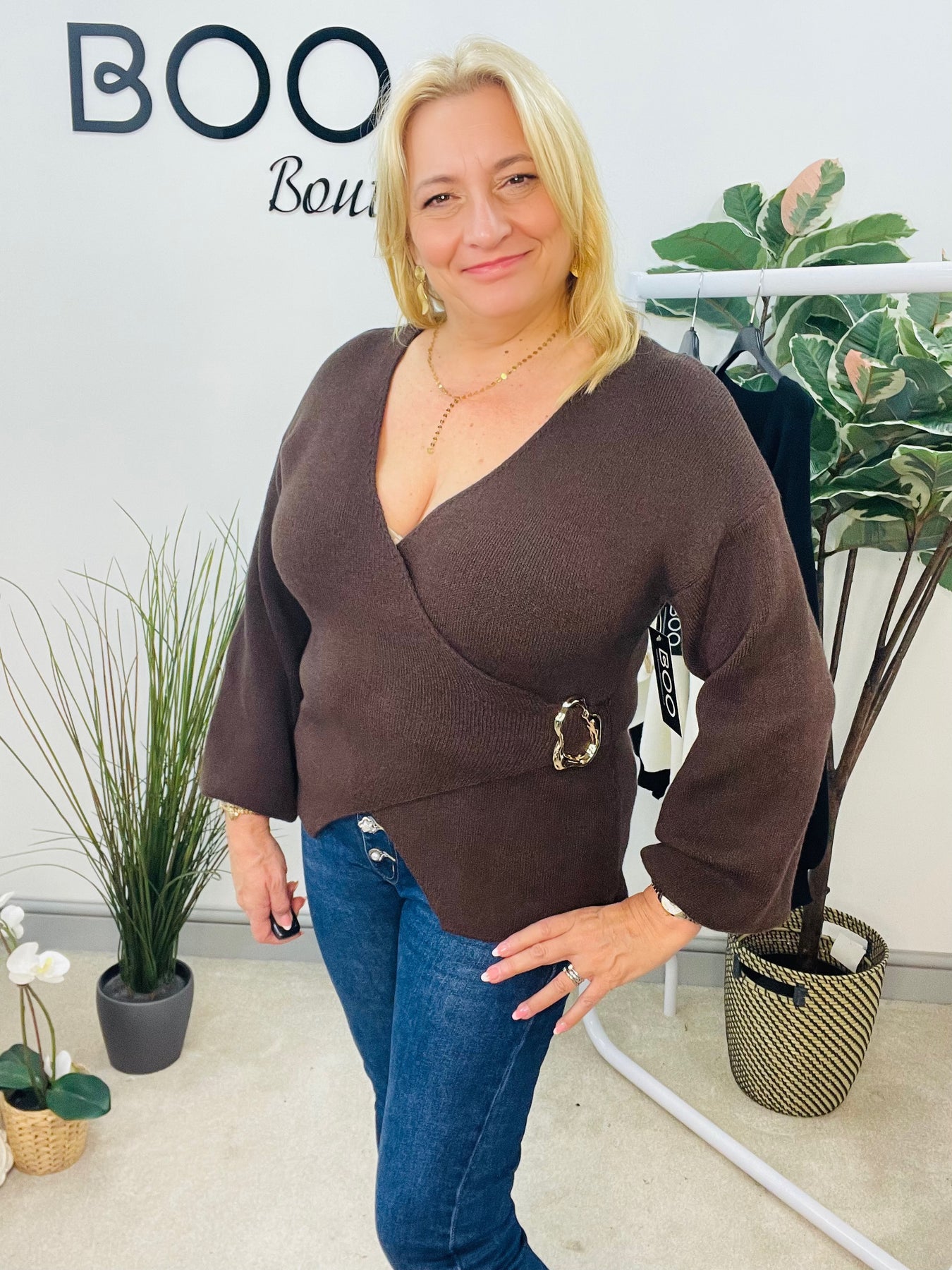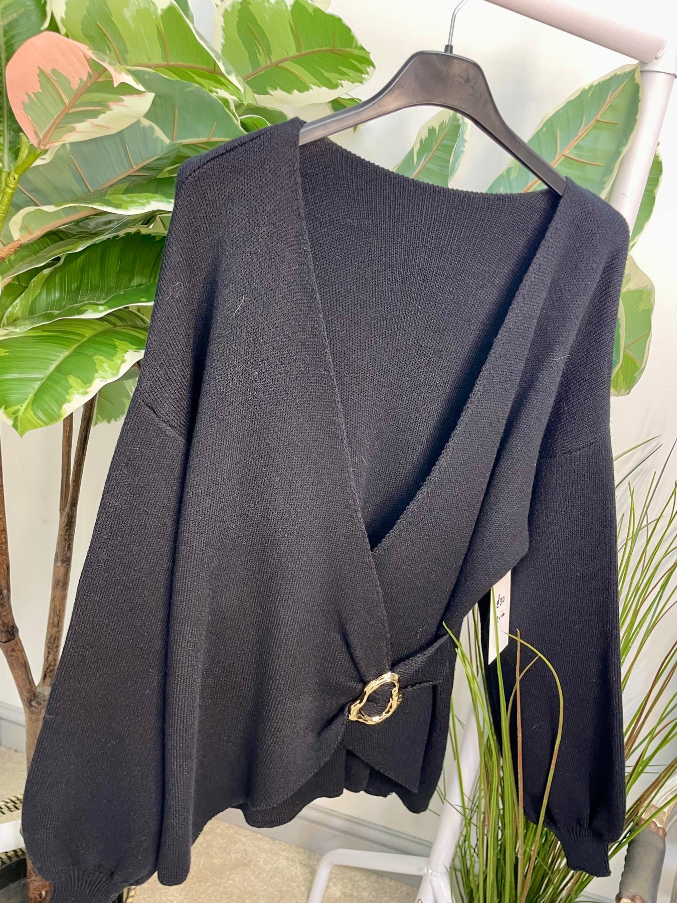 Introducing The EVIE jumper - your new go-to knit! Experience luxurious comfort in the soft knit fabric and chic cross over wrap style. This one-size jumper fits sizes 8 to 14/16 and features a stylish gold buckle detail. Available in 4 stunning colours. Get yours now!