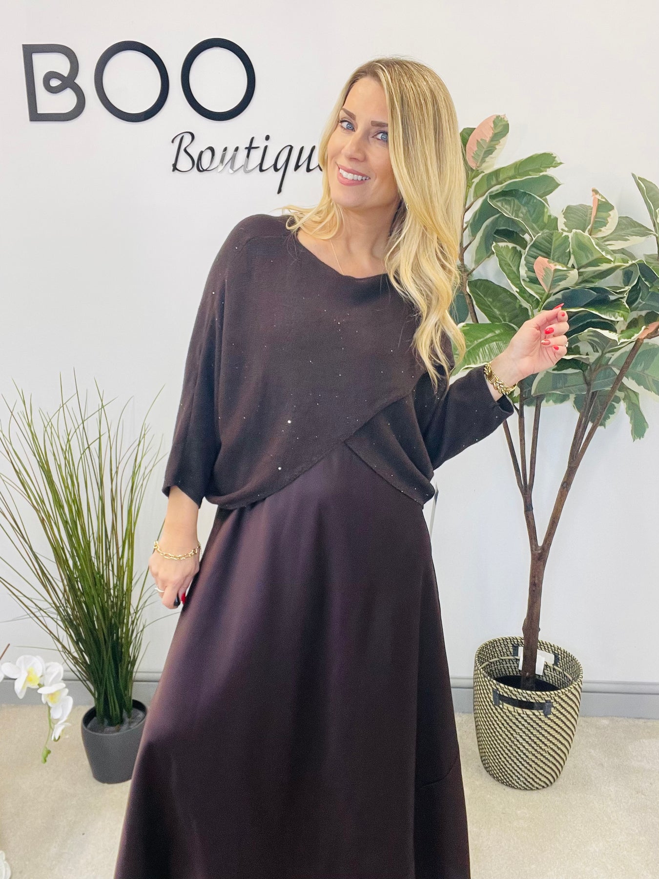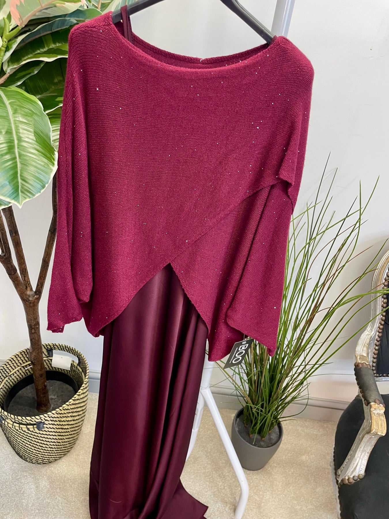 Upgrade your wardrobe with our JO dress jumper set. The set includes a luxurious satin cami dress, along with a matching sparkly cross over jumper, available in 3 stunning colours. Designed to fit sizes 8 to 14, this set is perfect for adding a touch of elegance and versatility to your outfits.
