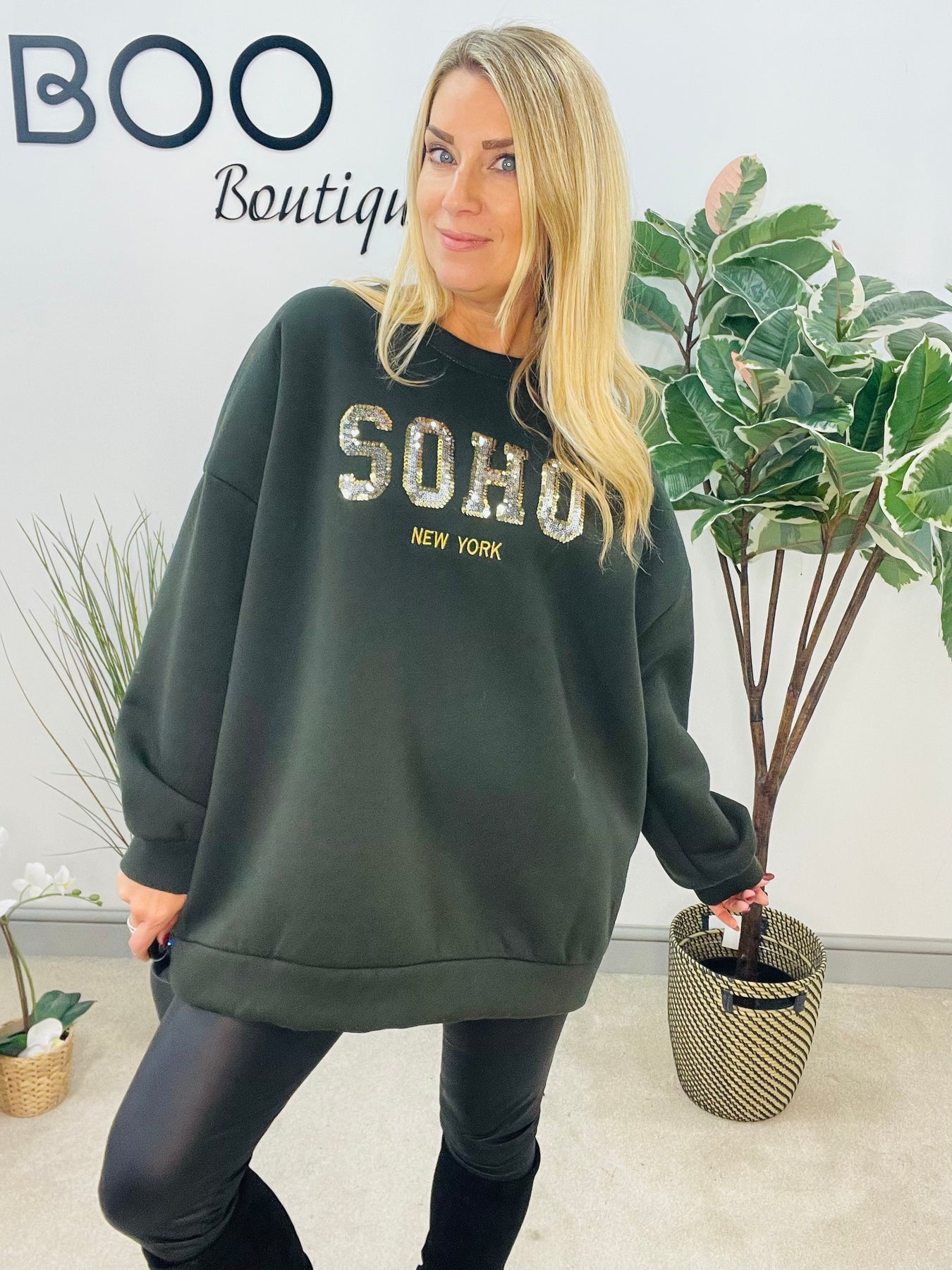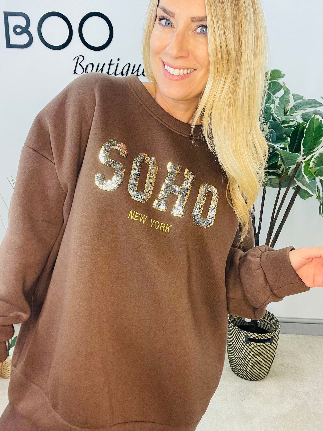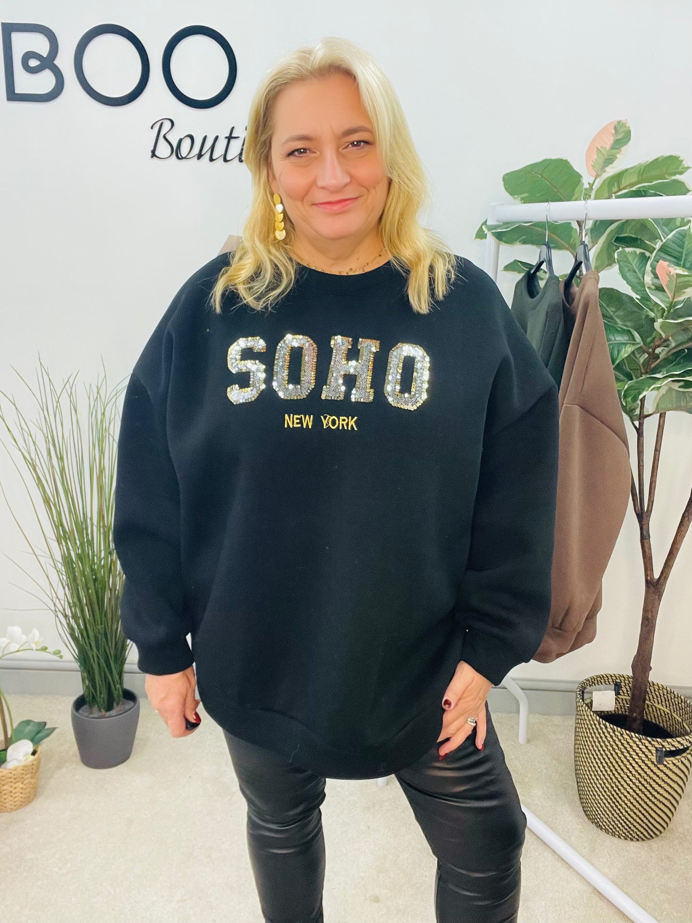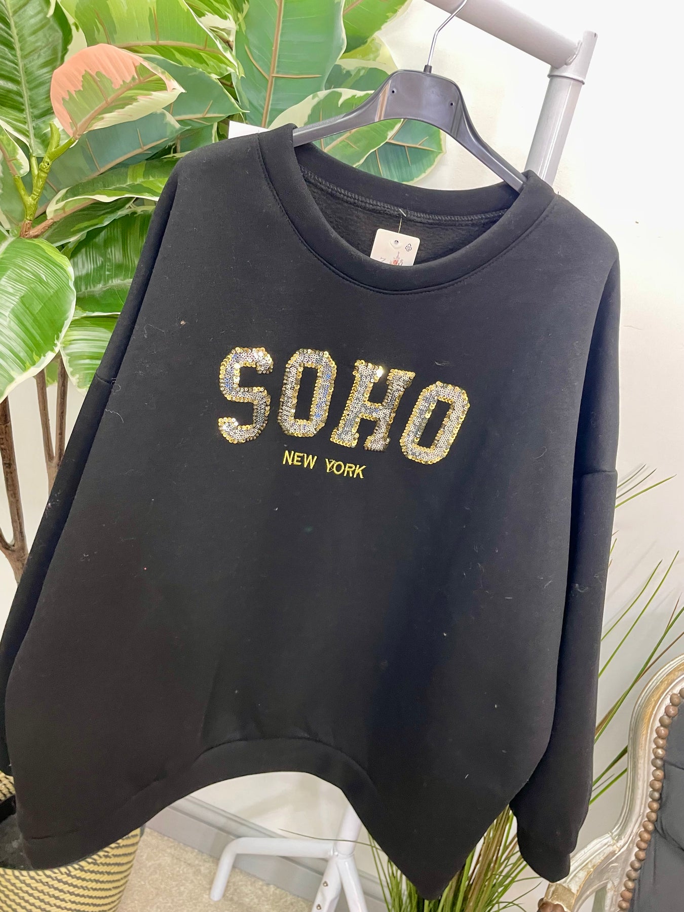The JULIE sweatshirt is a must-have for cozy and stylish fall fashion. It features a thick fleece lining for warmth and comfort, and is designed with an oversize fit that ranges from size 8 to 18. The sparkly sequin SOHO logo adds a touch of glamour to this versatile piece. Available in two chic colours.