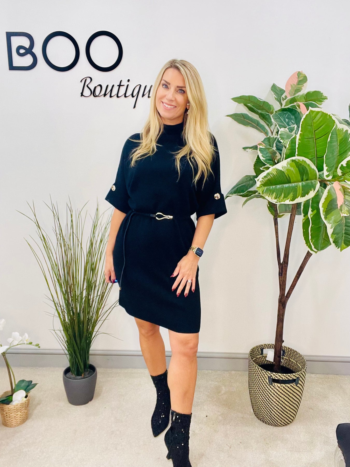 Expertly crafted in a soft black knit, the LIZ dress boasts a unique design with gold button turn-up sleeves and an integrated belt detail. Versatile and stylish, this one-size dress fits sizes 10 to 16, offering comfort and elegance for any occasion.