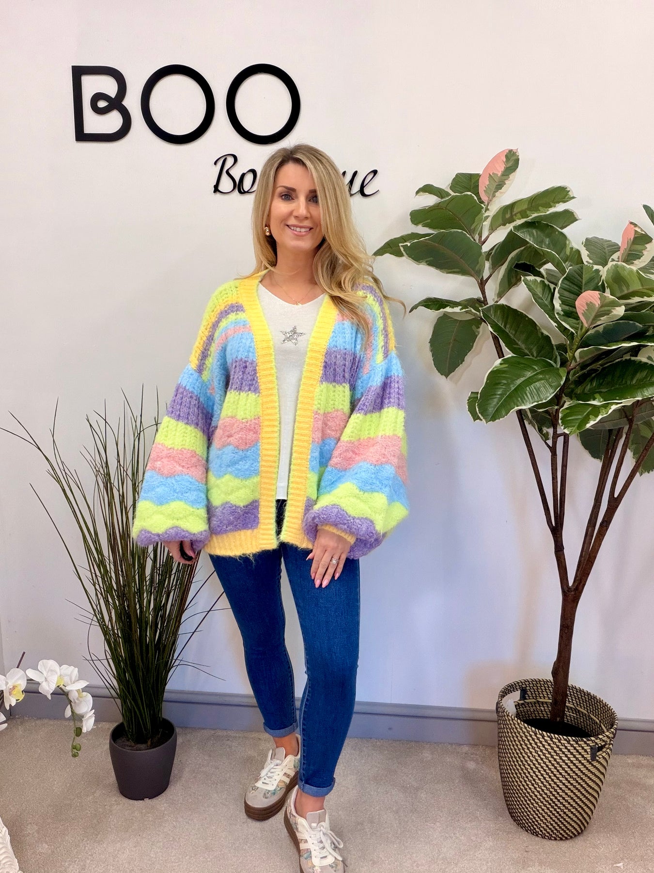 LADIES RAINBOW PASTEL STRIPE CHUNKY KNIT OVERSIZE CARDIGAN