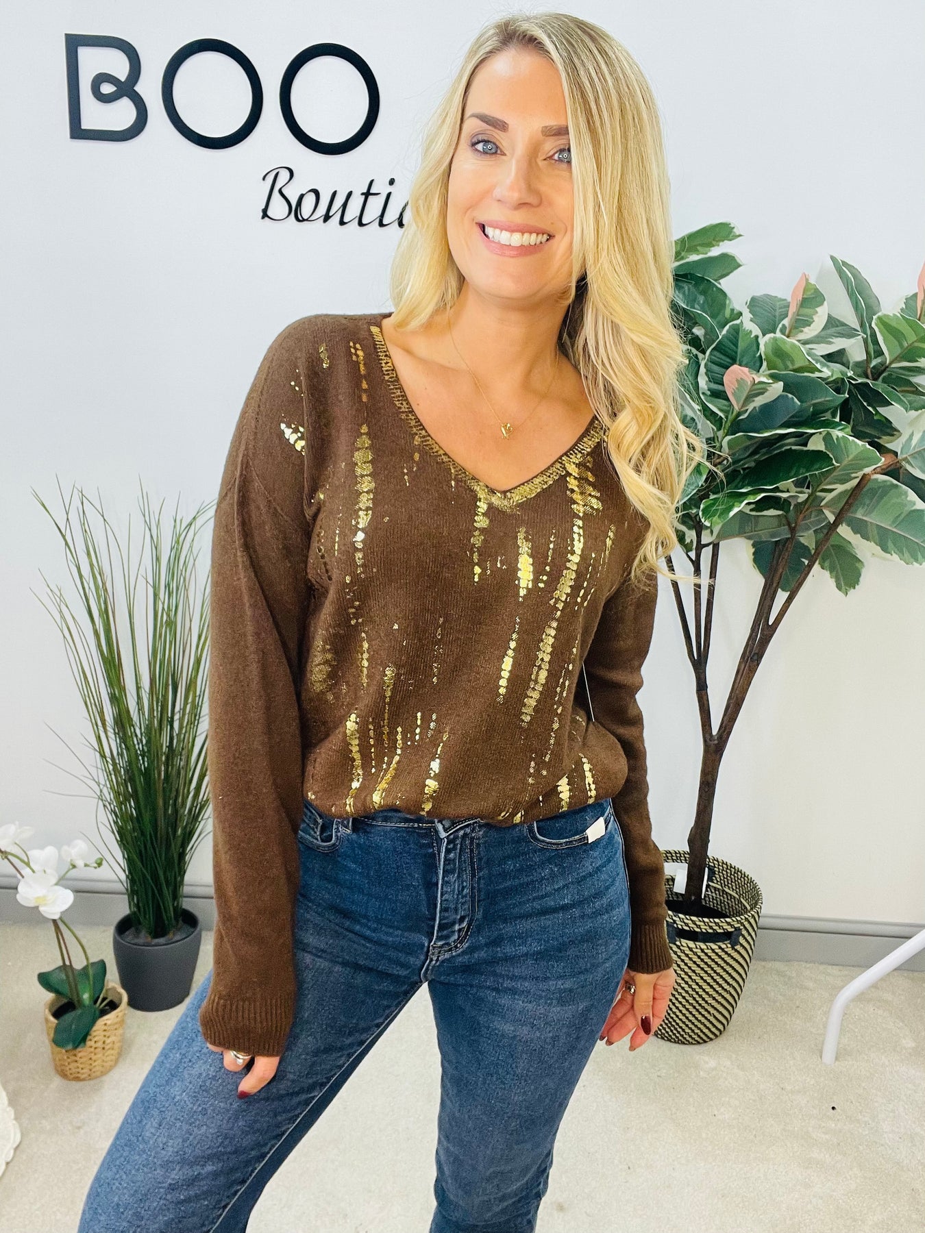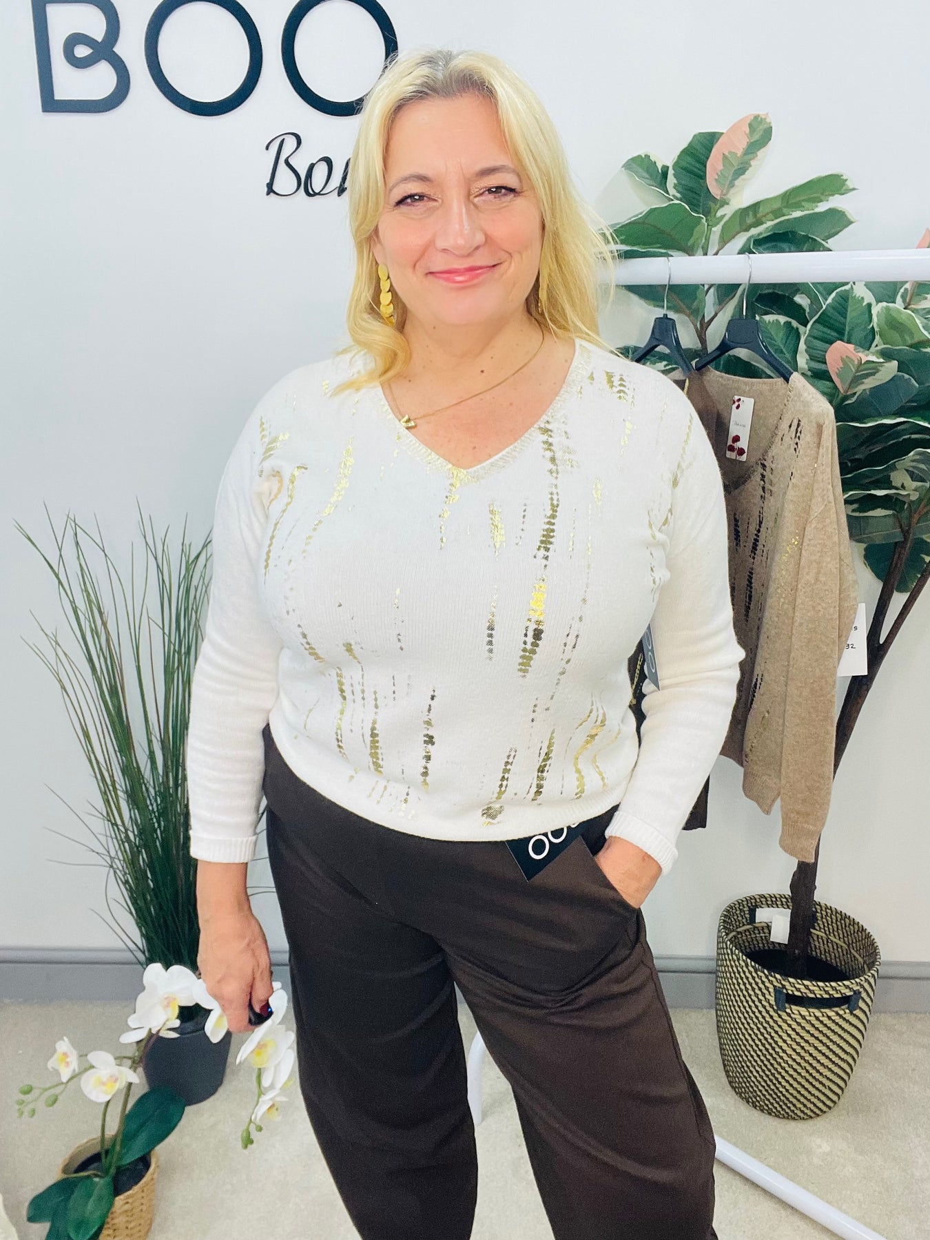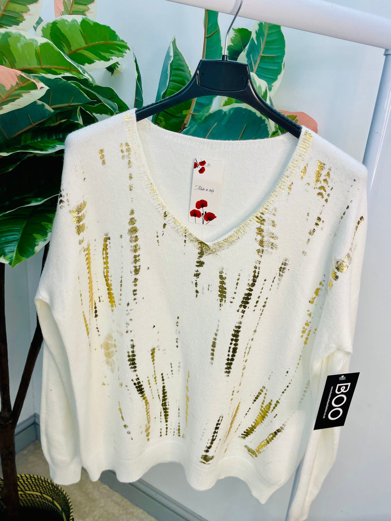 "The LORIS jumper is a versatile addition to any wardrobe. With its soft knit fabric and comfortable v neck design, it offers both style and comfort. The gold foil splash detail adds a touch of glamour, making it perfect for both casual and dressy occasions. Available in three colours, it's a one size fit for sizes 10 to 16."