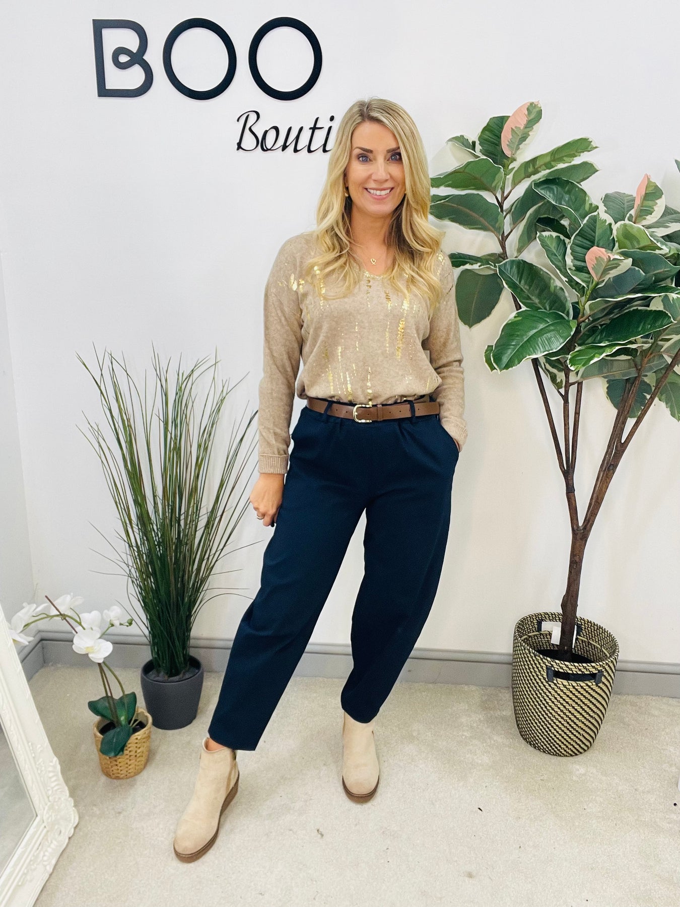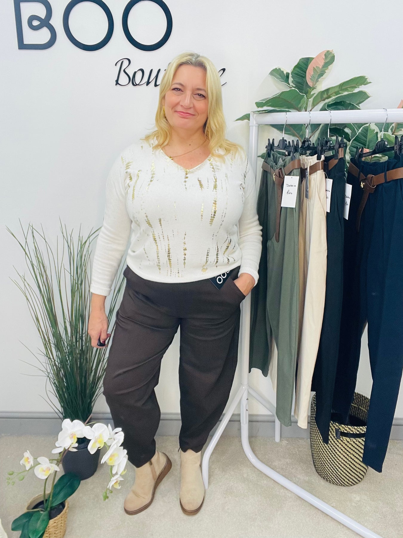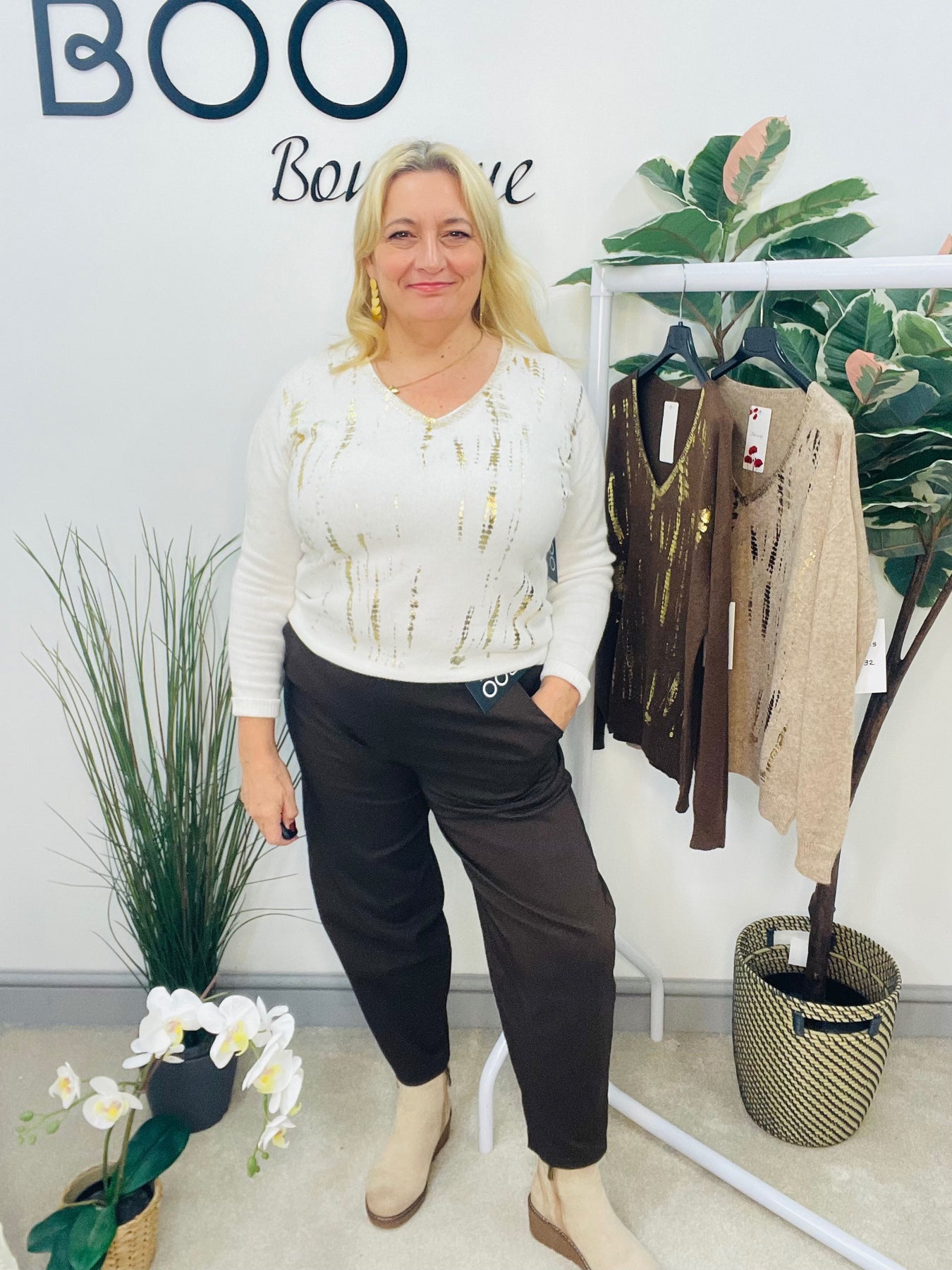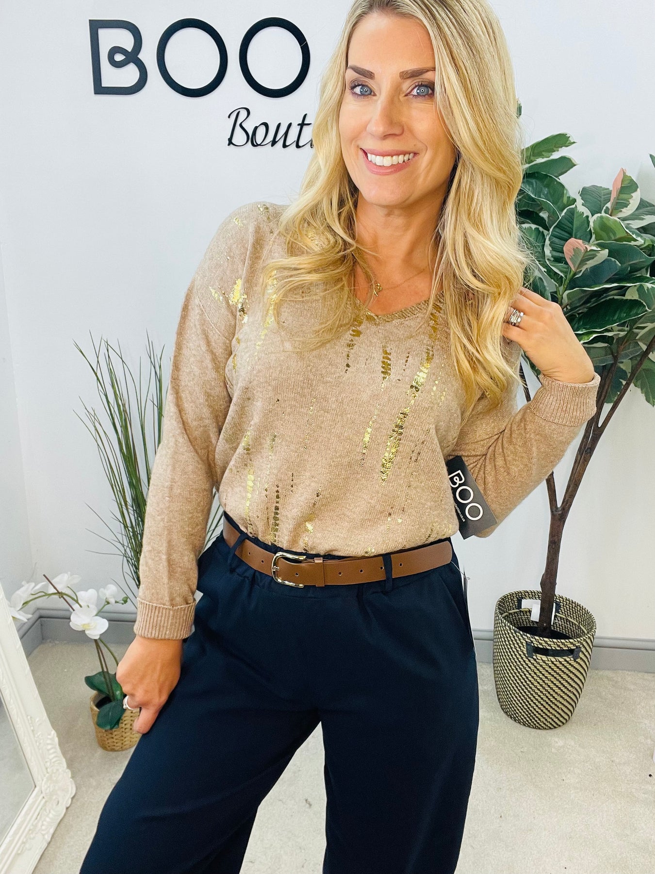 "The LORIS jumper is a versatile addition to any wardrobe. With its soft knit fabric and comfortable v neck design, it offers both style and comfort. The gold foil splash detail adds a touch of glamour, making it perfect for both casual and dressy occasions. Available in three colours, it's a one size fit for sizes 10 to 16."