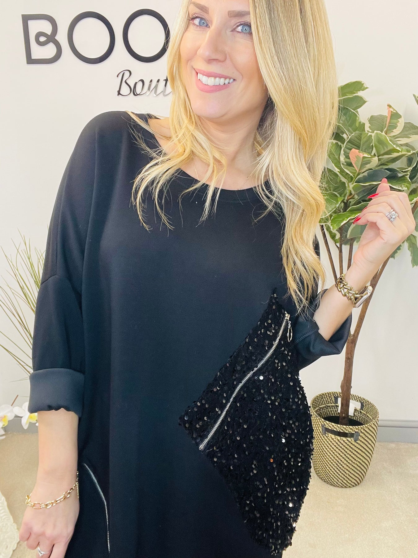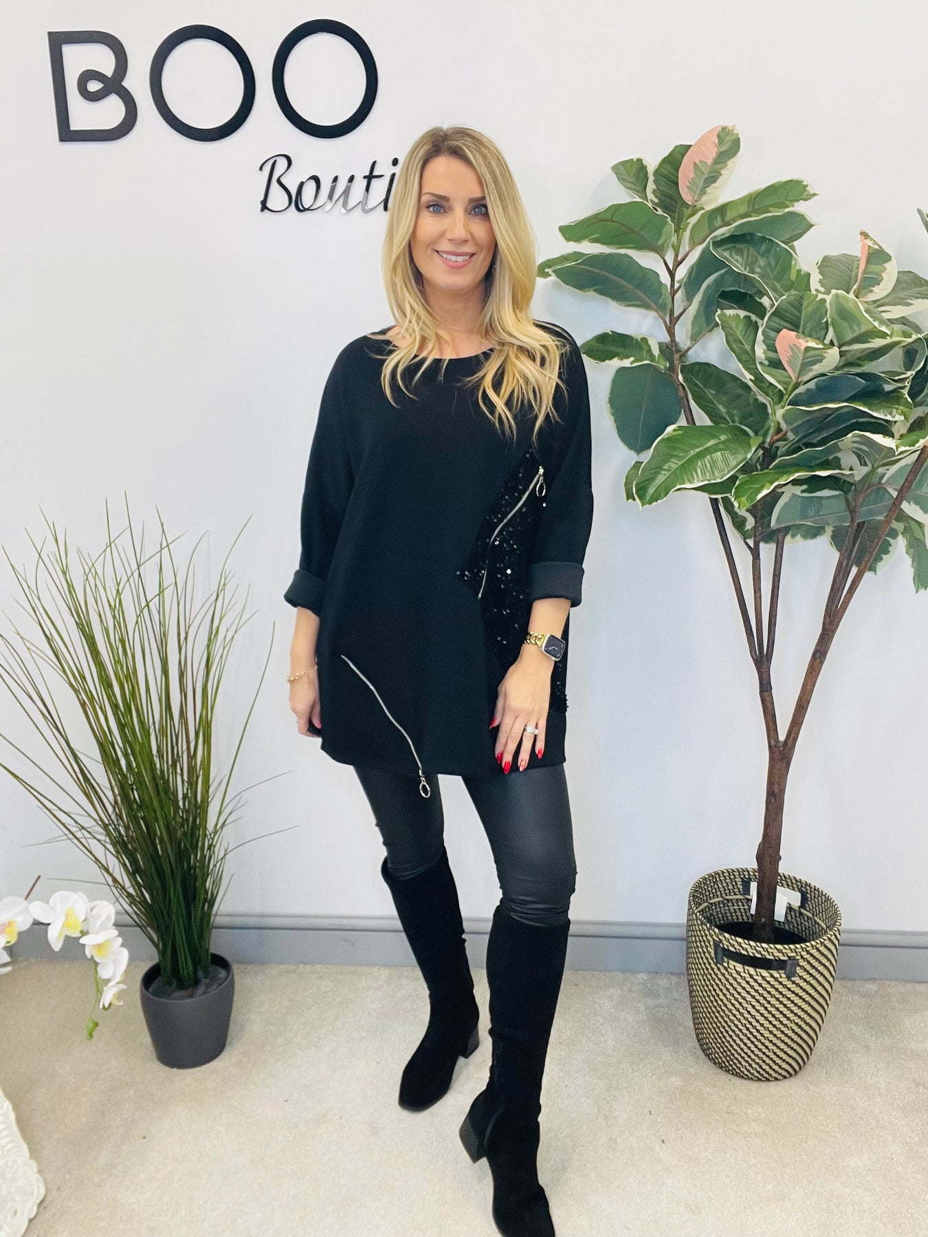 The MIMI sweatshirt top comes in 3 stylish colours and is perfect for pairing with leggings. Made from scuba material, this top features a trendy sequin pocket and zipper detail. It is one size fits all, comfortably fitting sizes 10 to 18.