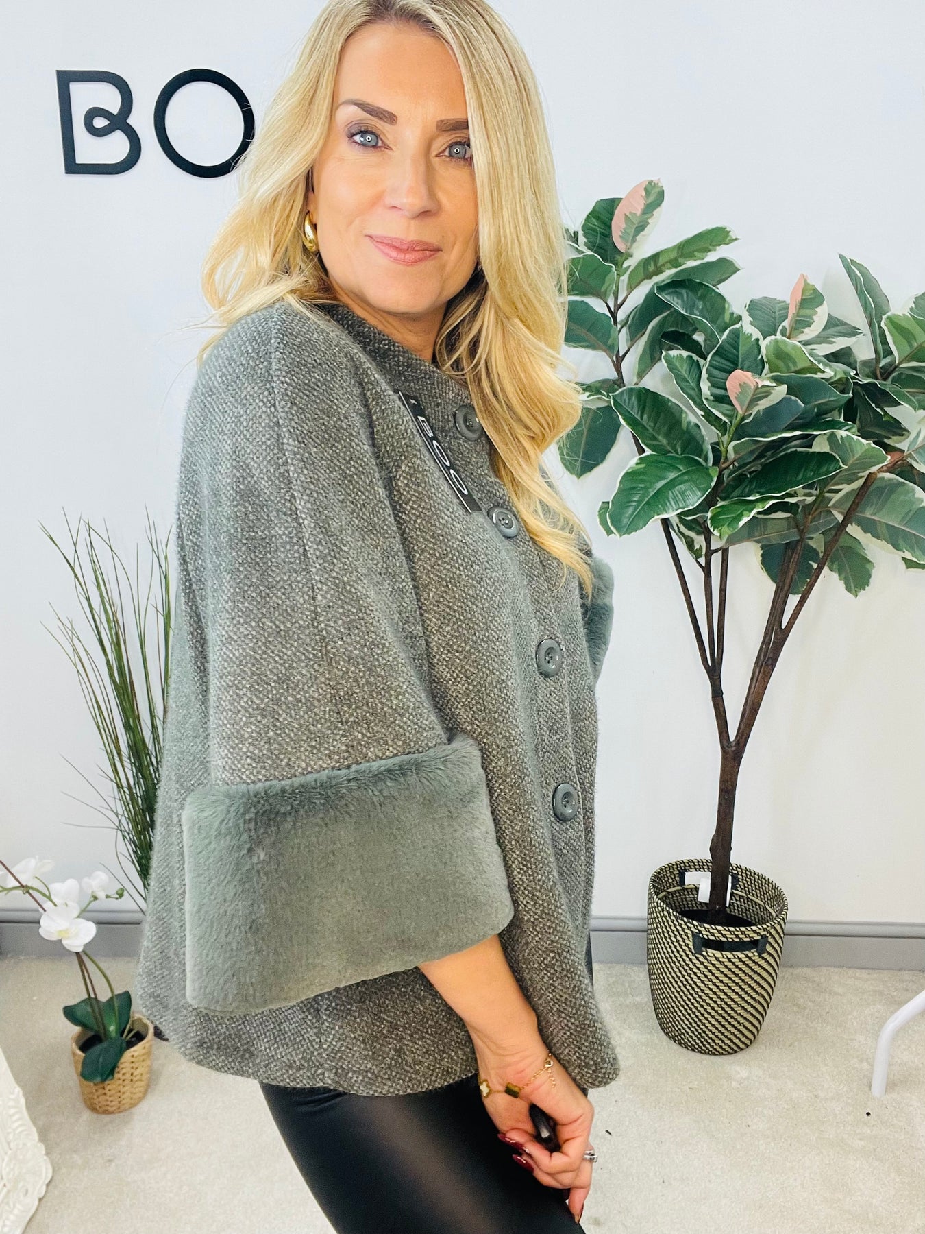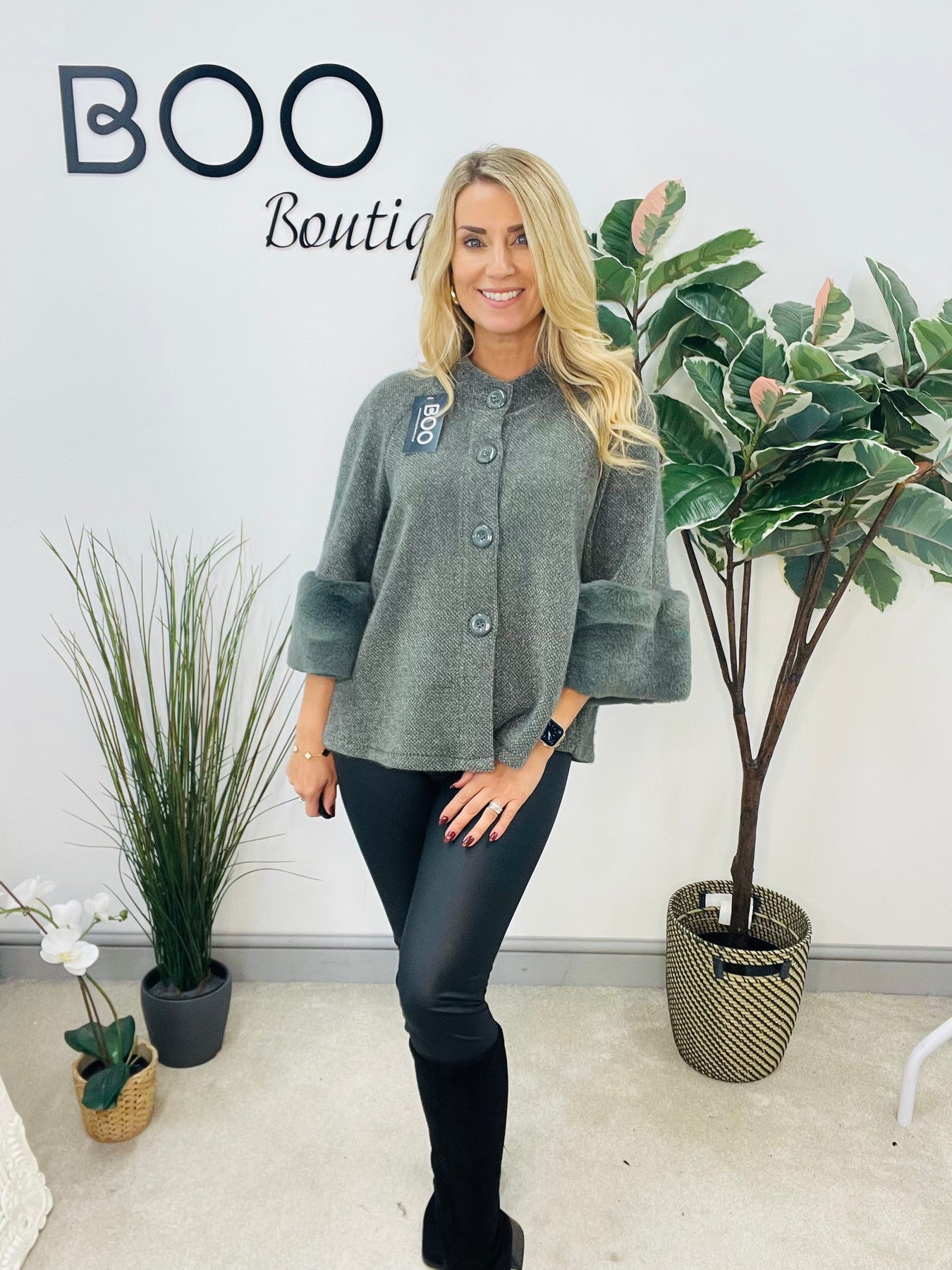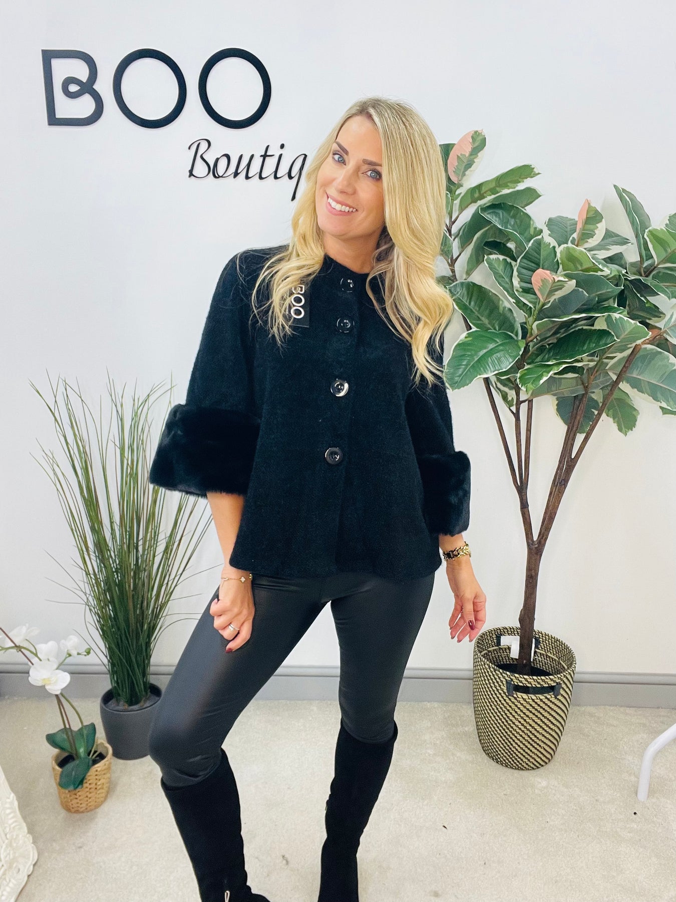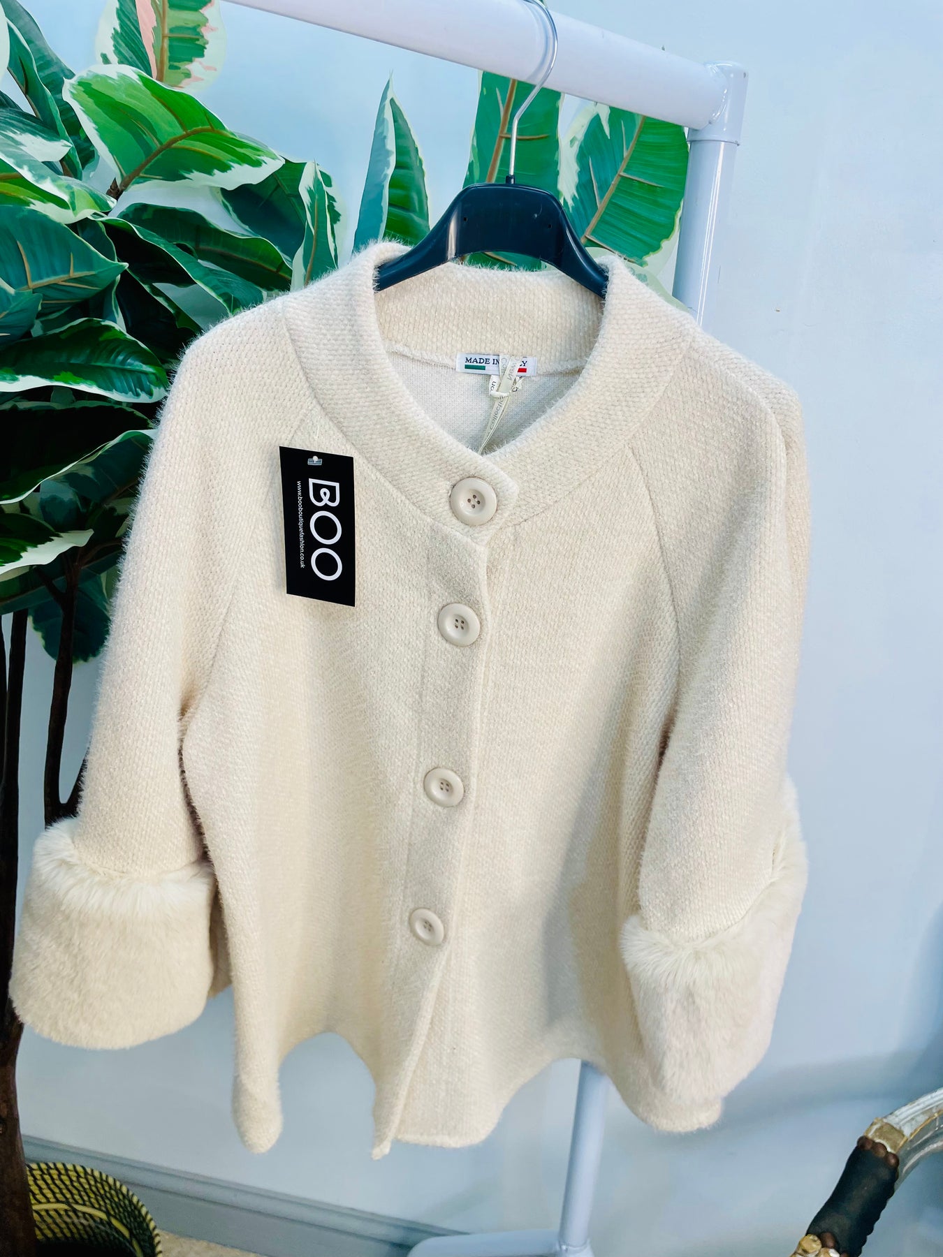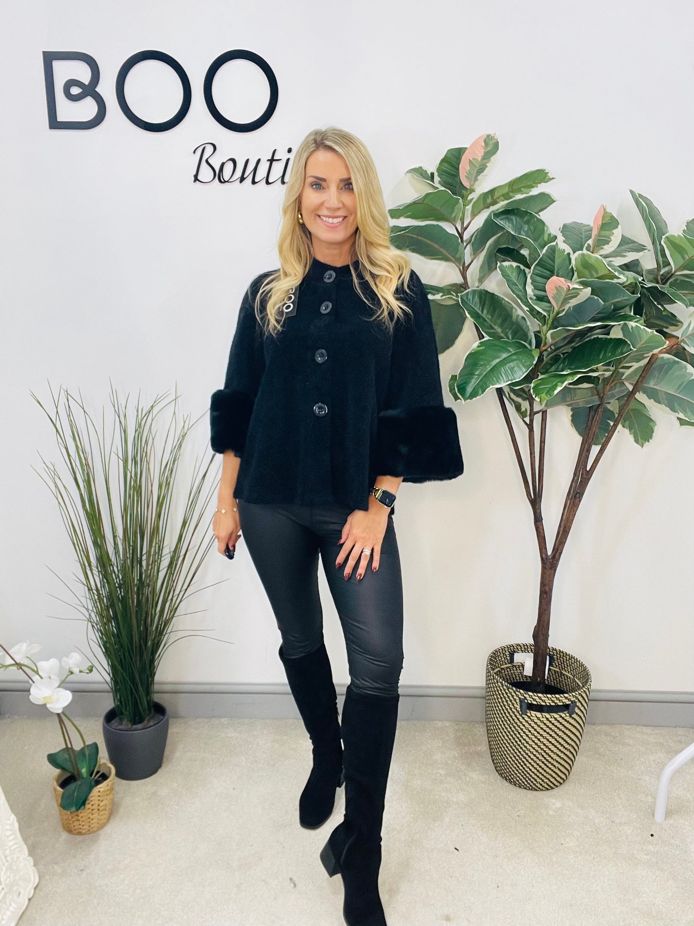 Elevate your style with The NANCY bolero jacket. This stunning piece features a soft, button-up design and luxurious faux fur cuffs in five beautiful colours. With a versatile one size fitting sizes 8 to 16, stand out this season in this must-have autumn/winter staple.