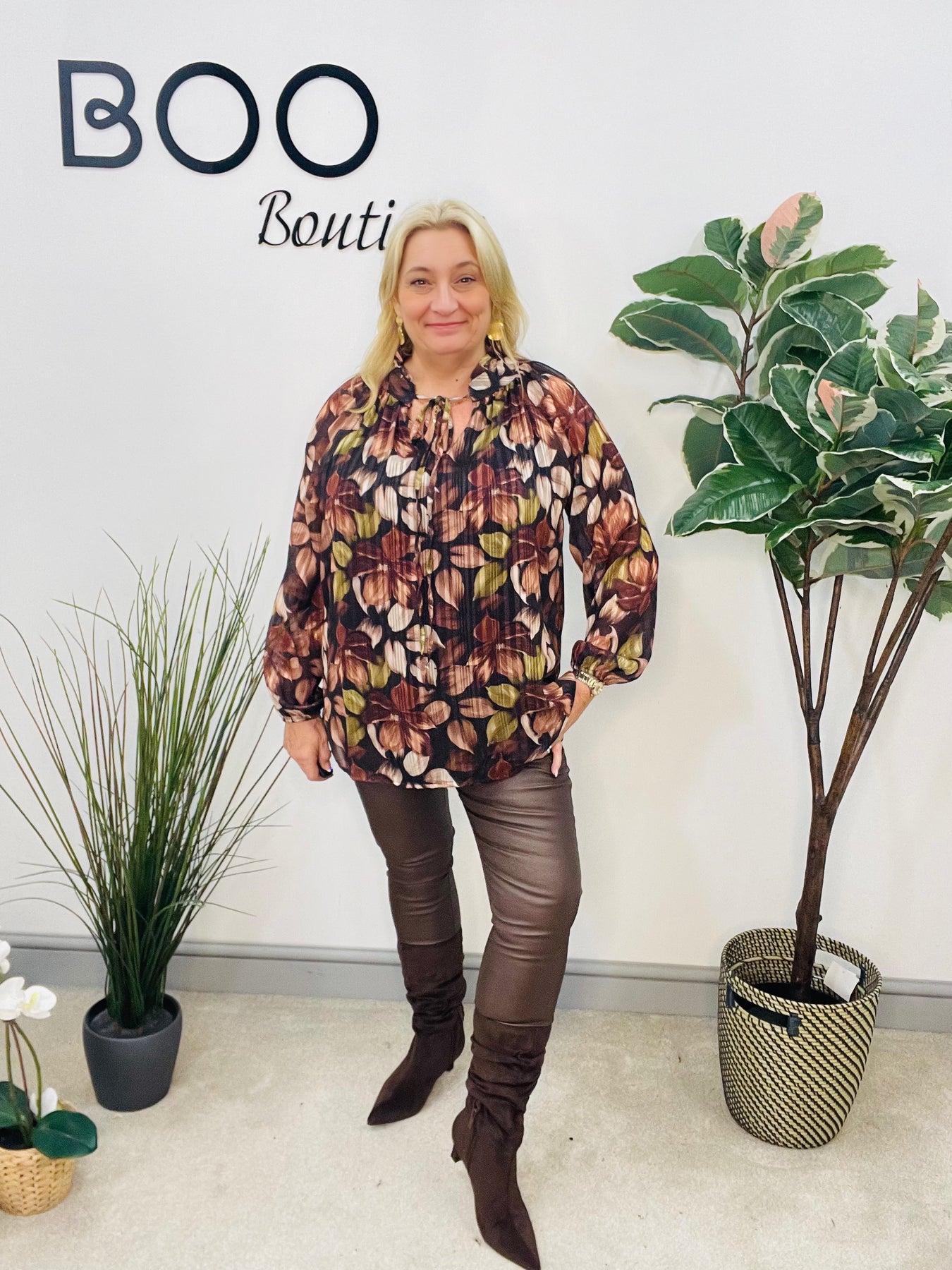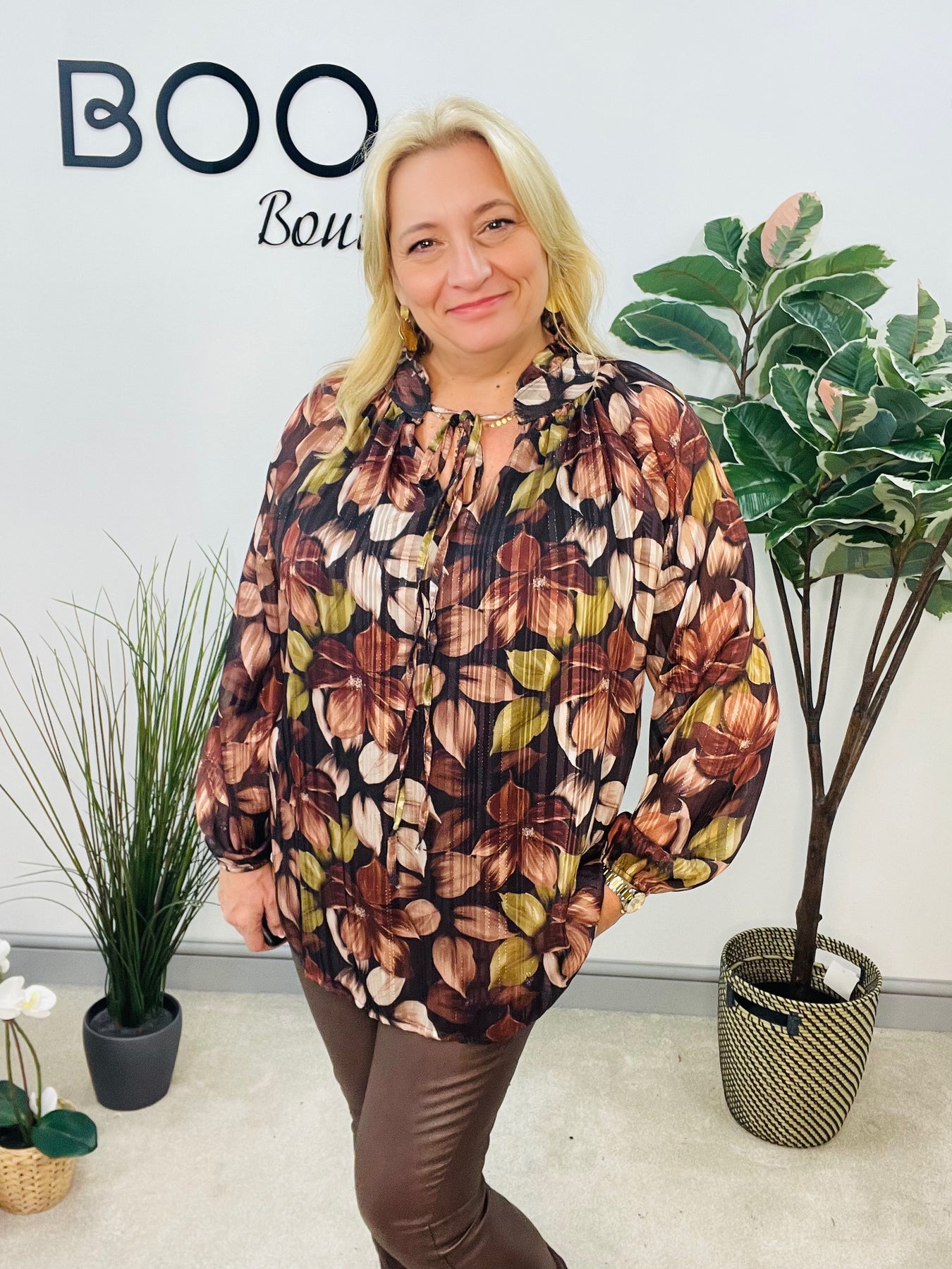LADIES LEAF PRINT CHIFFON BLOUSE TOP - BROWN, BLACK & KHAKI