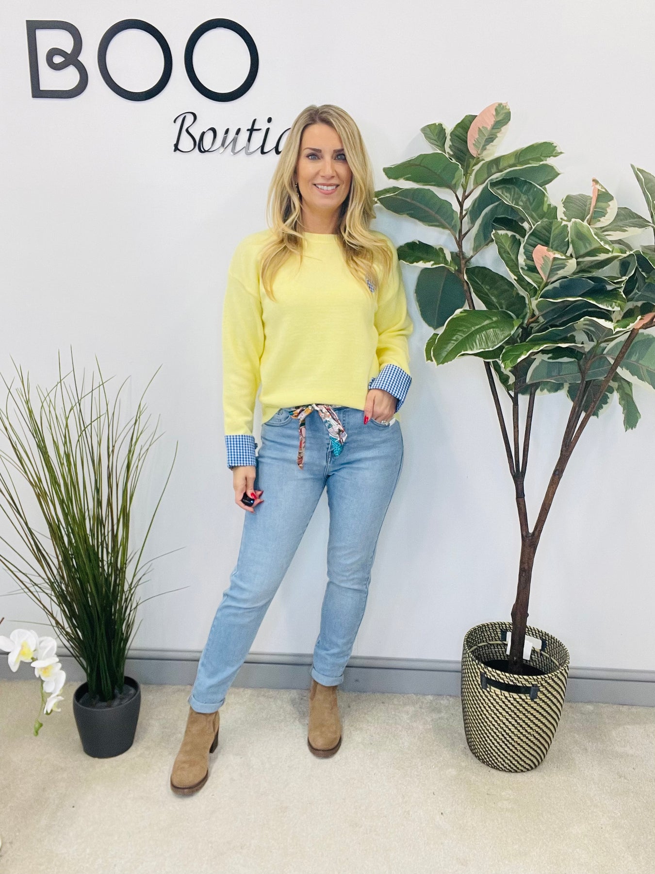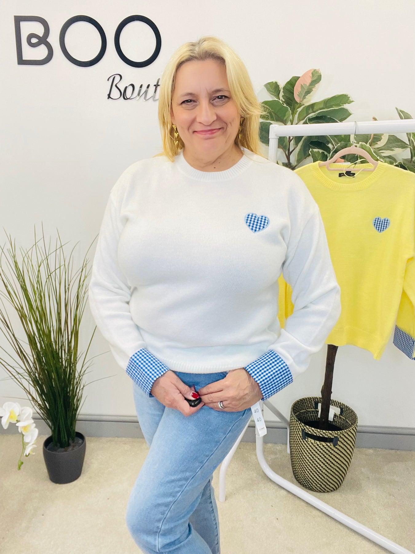 The RHIANA jumper features a soft knit material, gingham cuff detail, and a heart motif. Stay cozy and stylish in this must-have jumper available in two colours.  Elevate your look with a touch of charm and warmth.