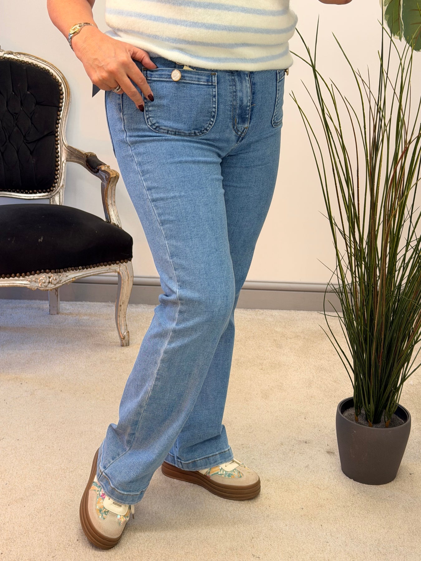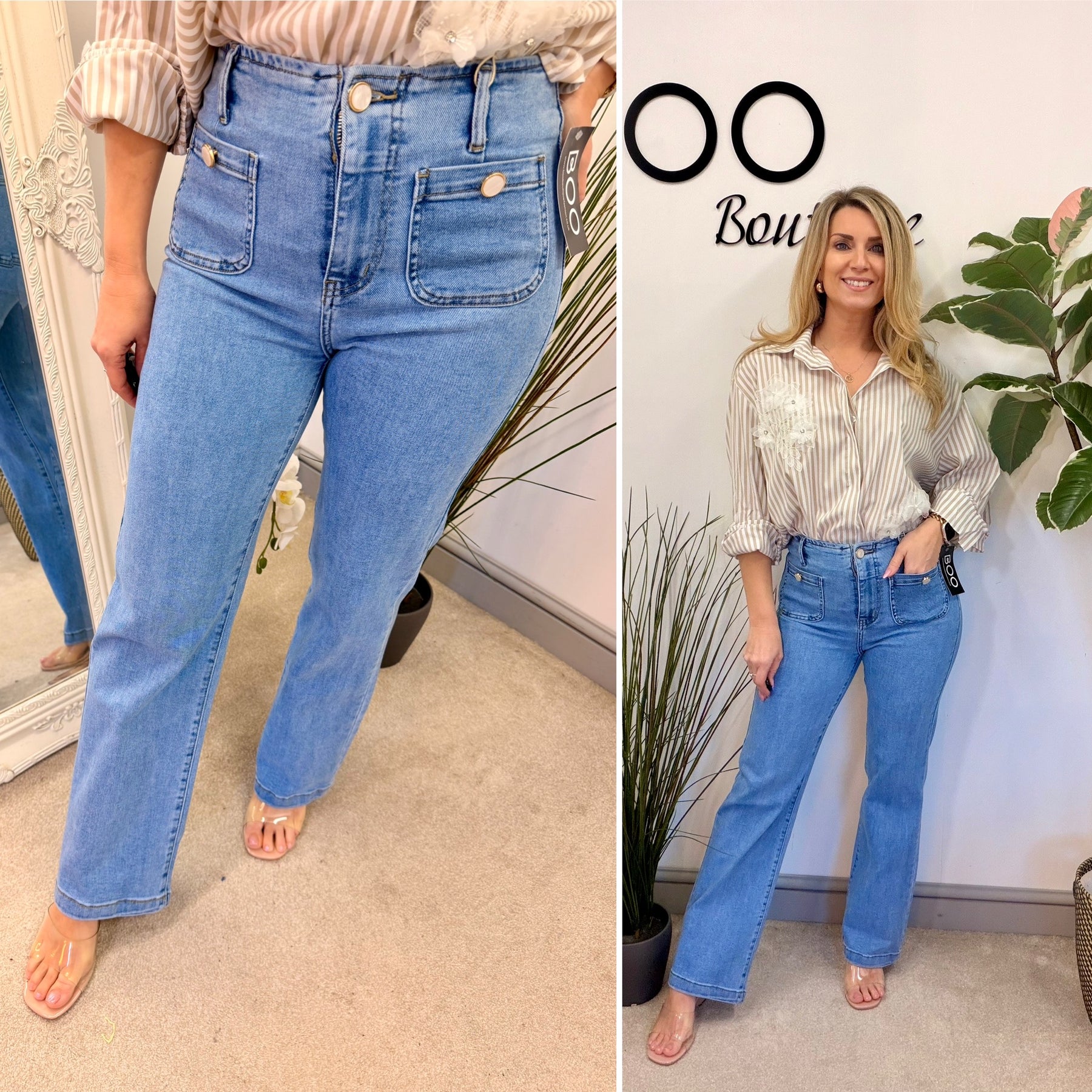 The SALLY straight leg jeans feature a mid wash design with a high waist that enhances body shape. The straight leg cut provides comfort and versatility, while the trendy front pockets add functional style. Ideal for various occasions, these jeans offer a contemporary fit for everyday wear.