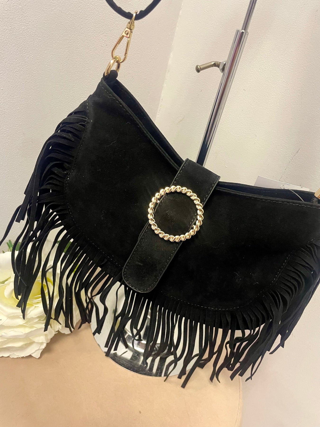 Elevate your style with the SUZY black bag. This gorgeous shoulder bag features faux suede fringe detailing and a gold clasp fastening, giving you a chic and sophisticated look. The detachable adjustable shoulder strap adds versatility, making it the perfect accessory for any occasion.