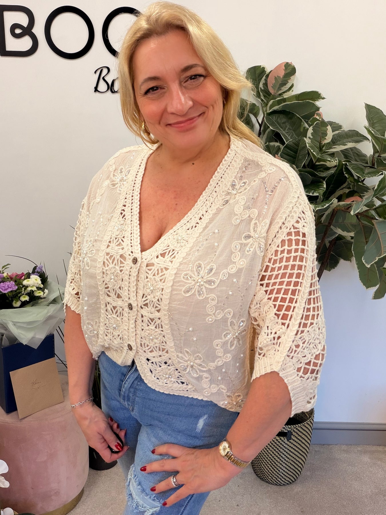 Elevate your wardrobe with The VICKI top! This exquisite button-up bolero features beautiful crochet and sequin details, adding a touch of elegance to any outfit. Designed to fit sizes 8 to 16, it offers versatility and style for every occasion. Embrace your unique flair and shine!