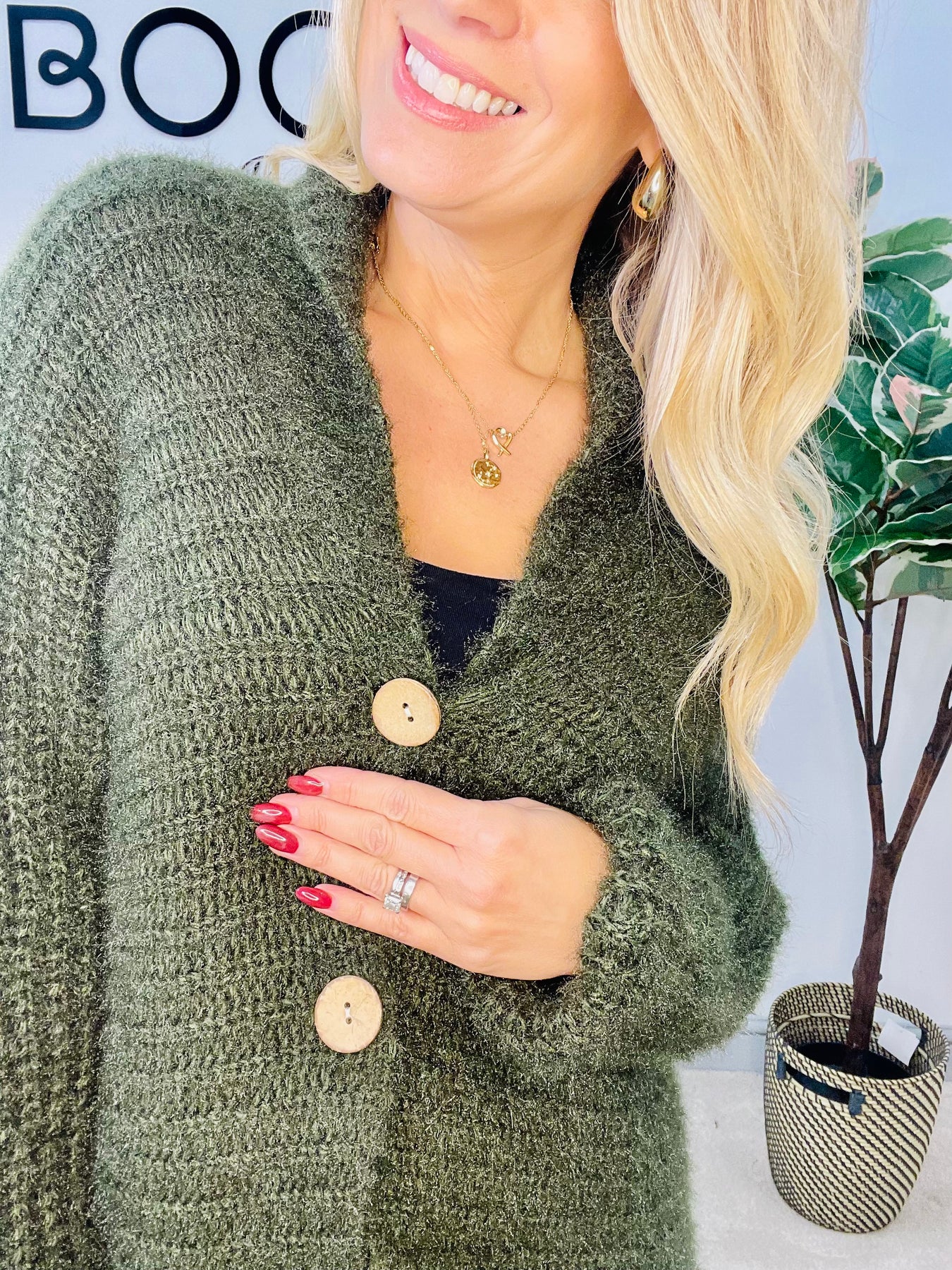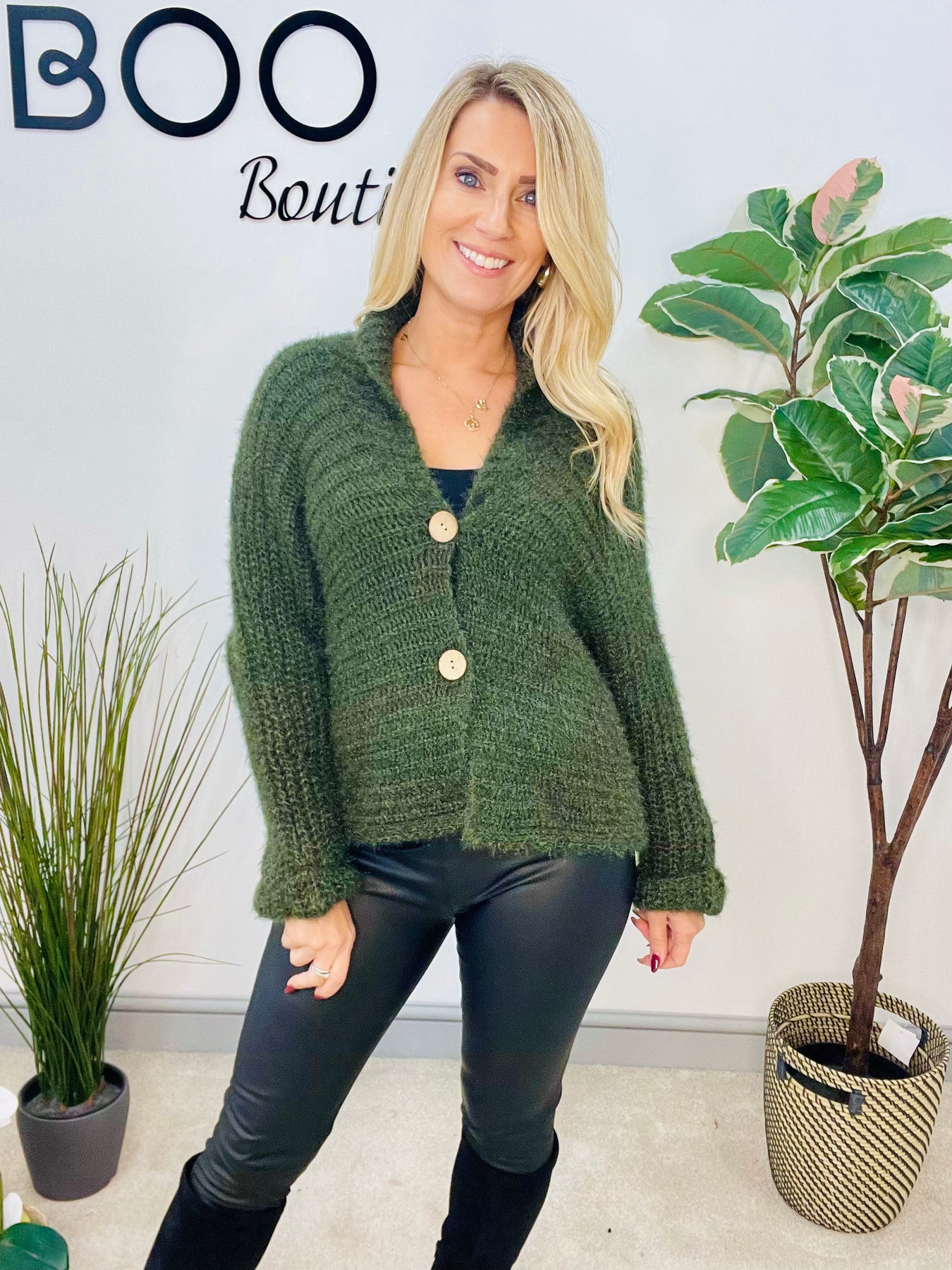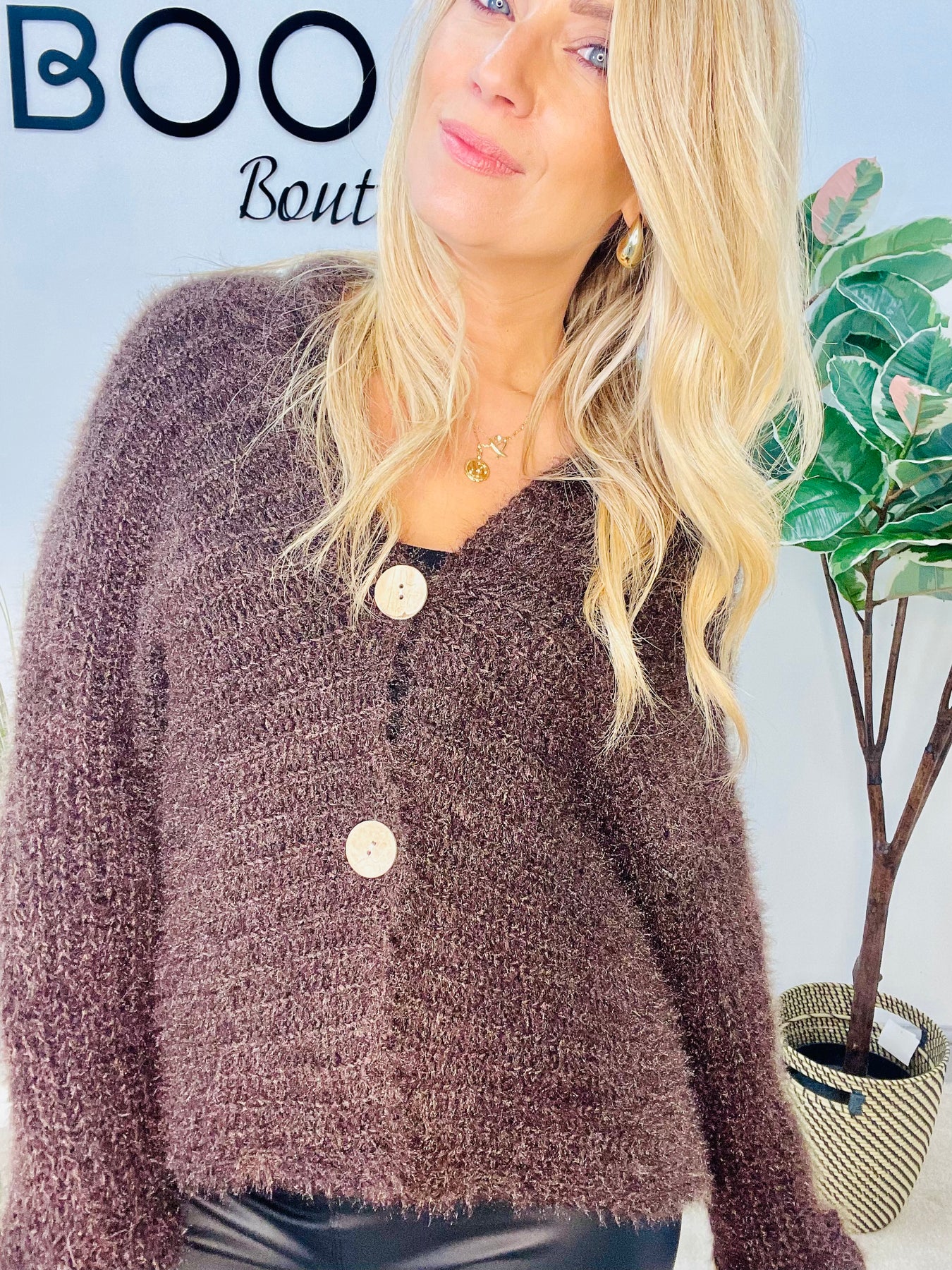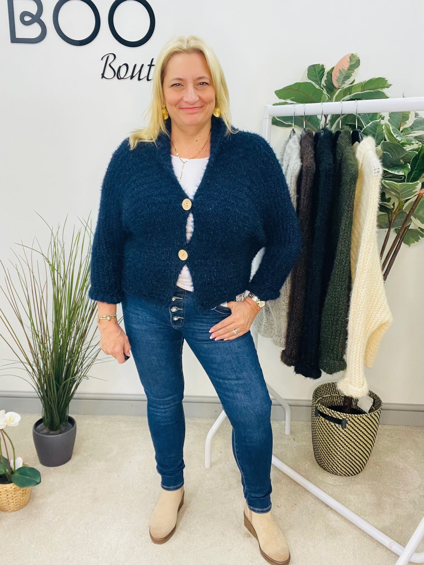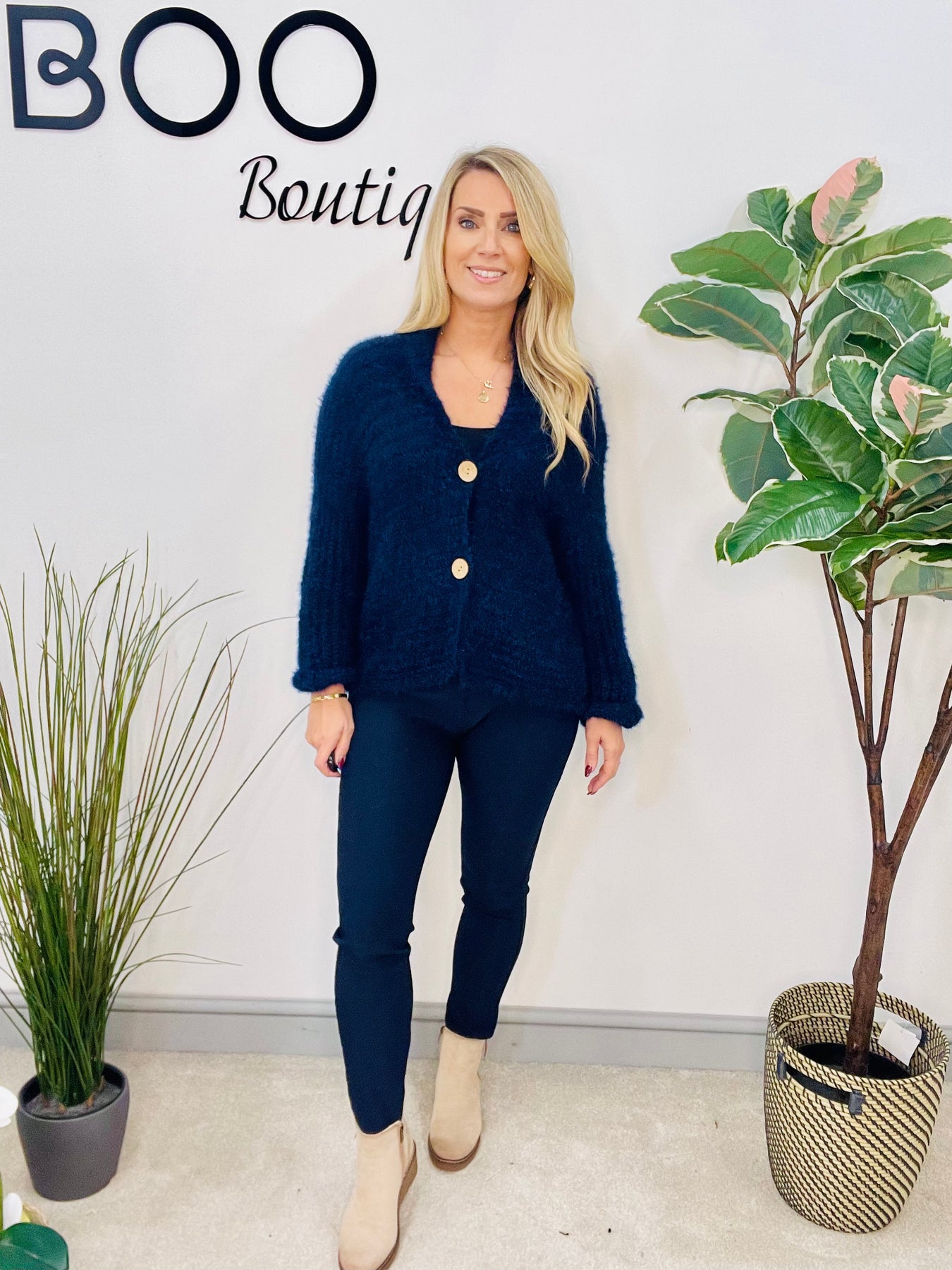 LADIES FLUFFY KNIT CARDIGAN - KHAKI, NAVY, GREY, BLACK, BEIGE, BROWN
