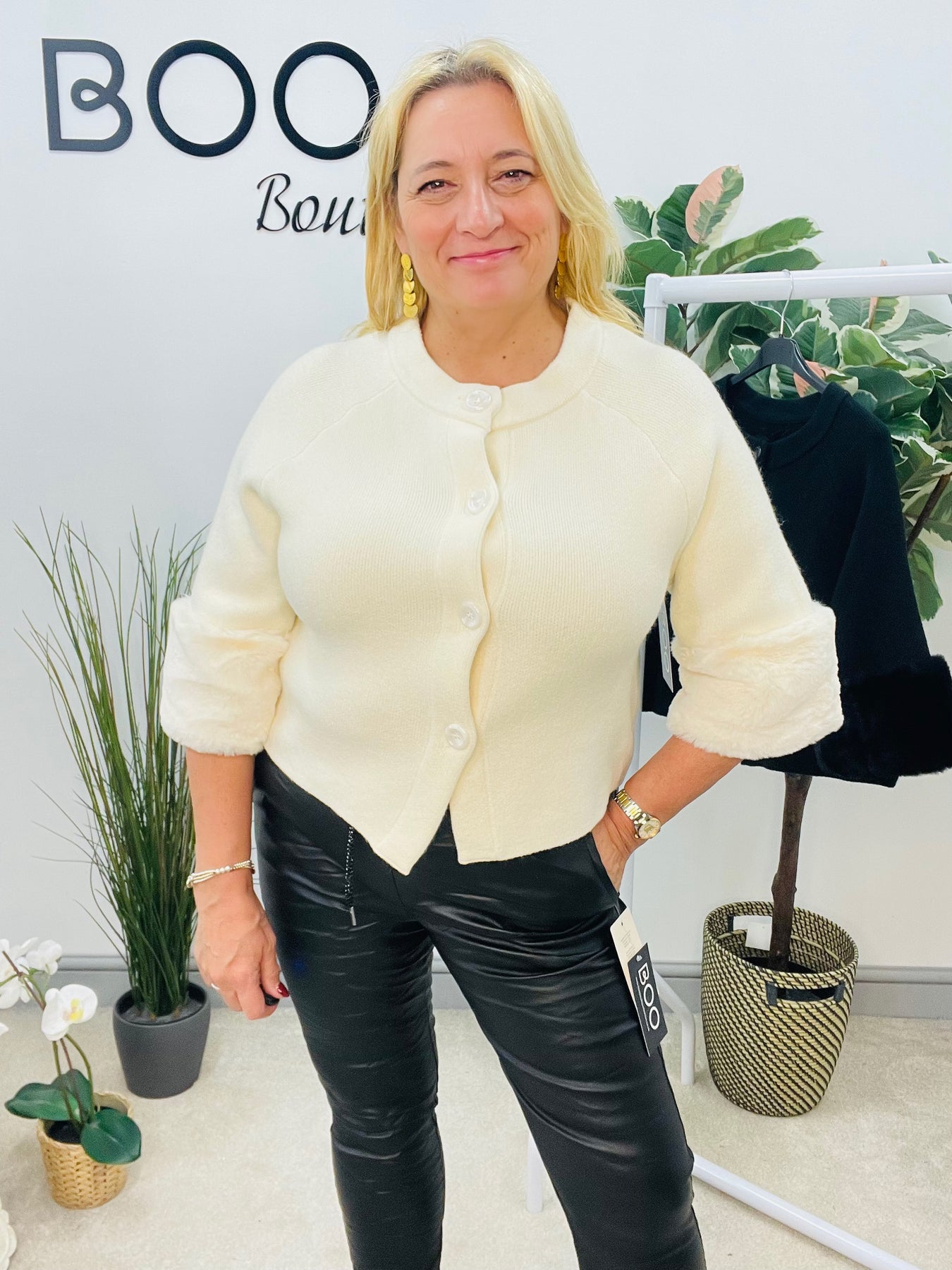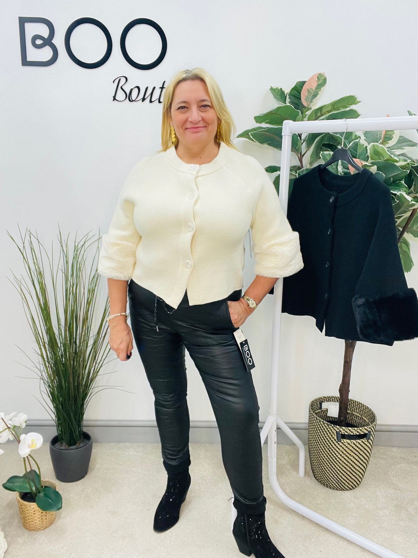 LADIES KNITTED BOLERO FAUX FUR CUFF CARDIGAN JUMPER - BLACK & CREAM