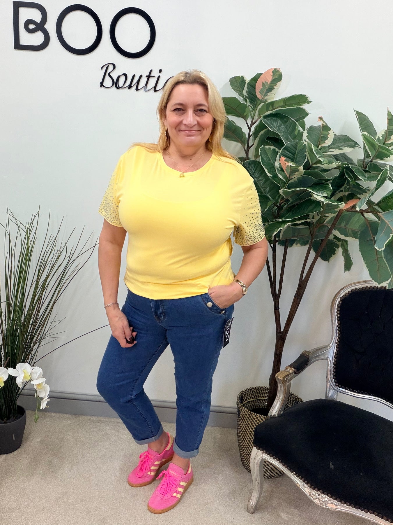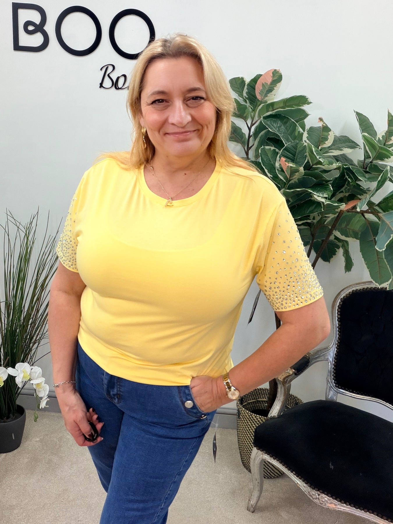 LADIES FASHION DIAMANTE T SHIRT - BLACK, WHITE & YELLOW