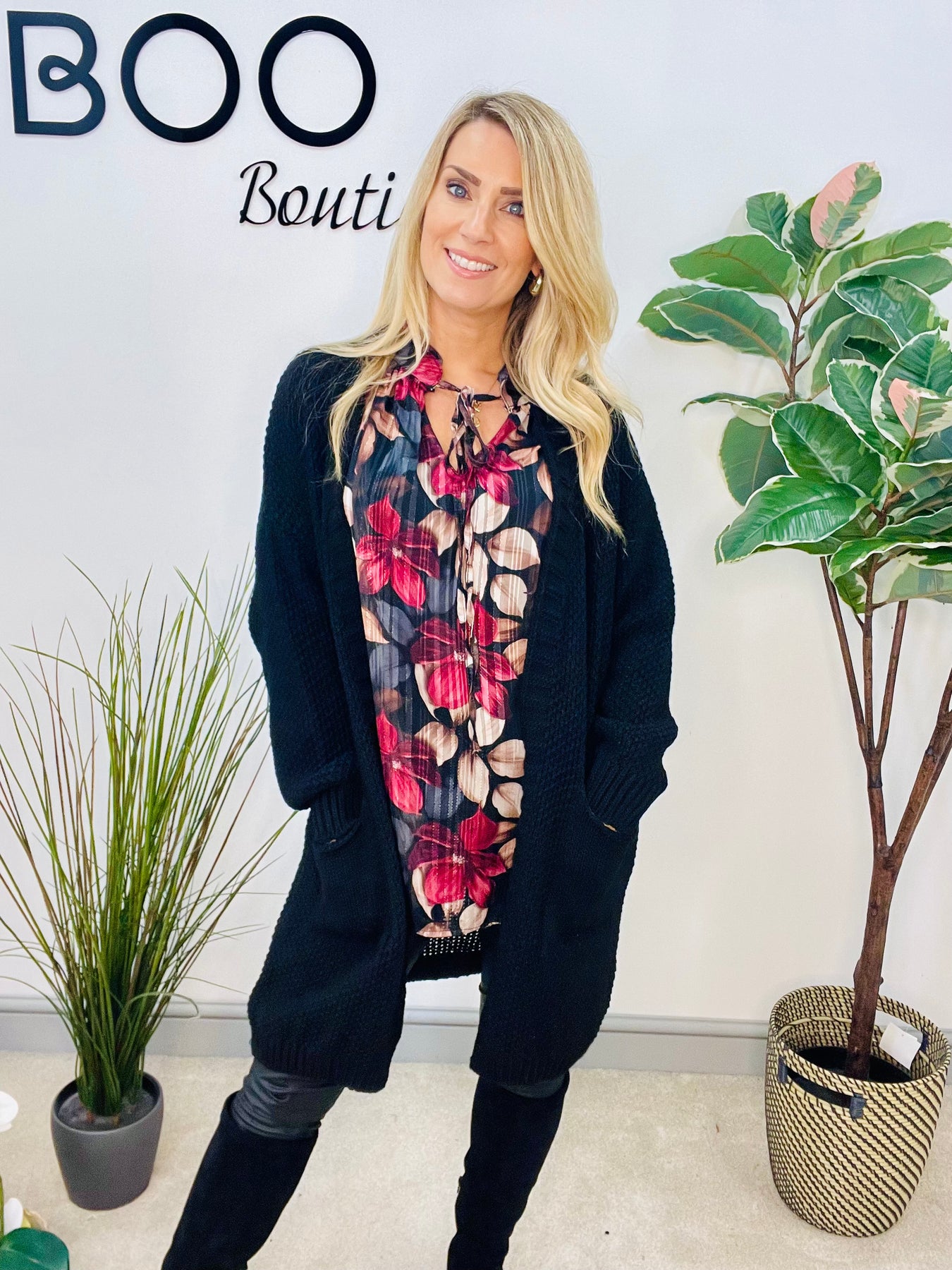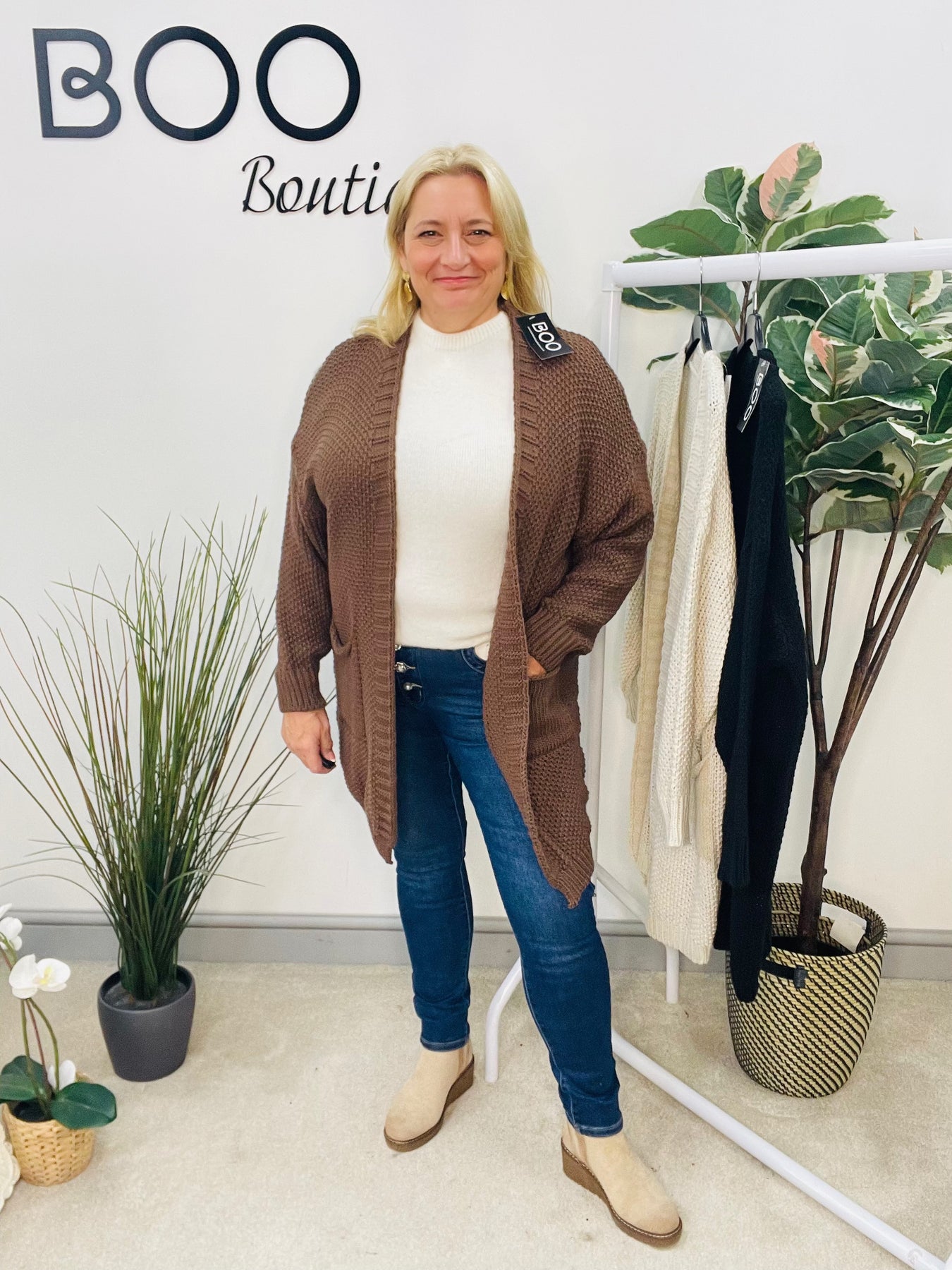 LADIES WAFFLE KNIT LONG LINE CARDIGAN - BLACK, BROWN & BEIGE