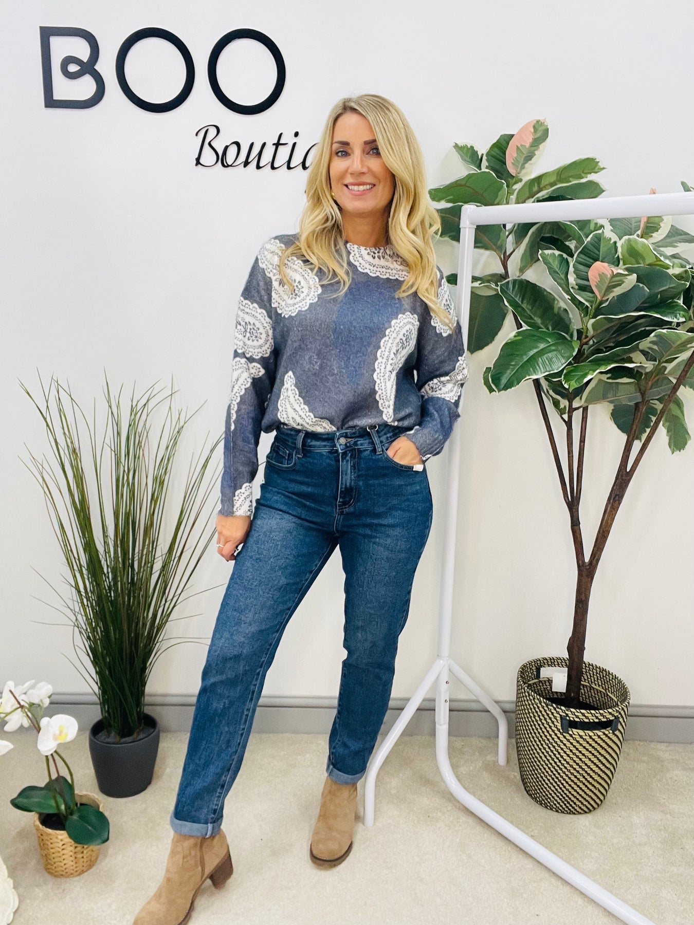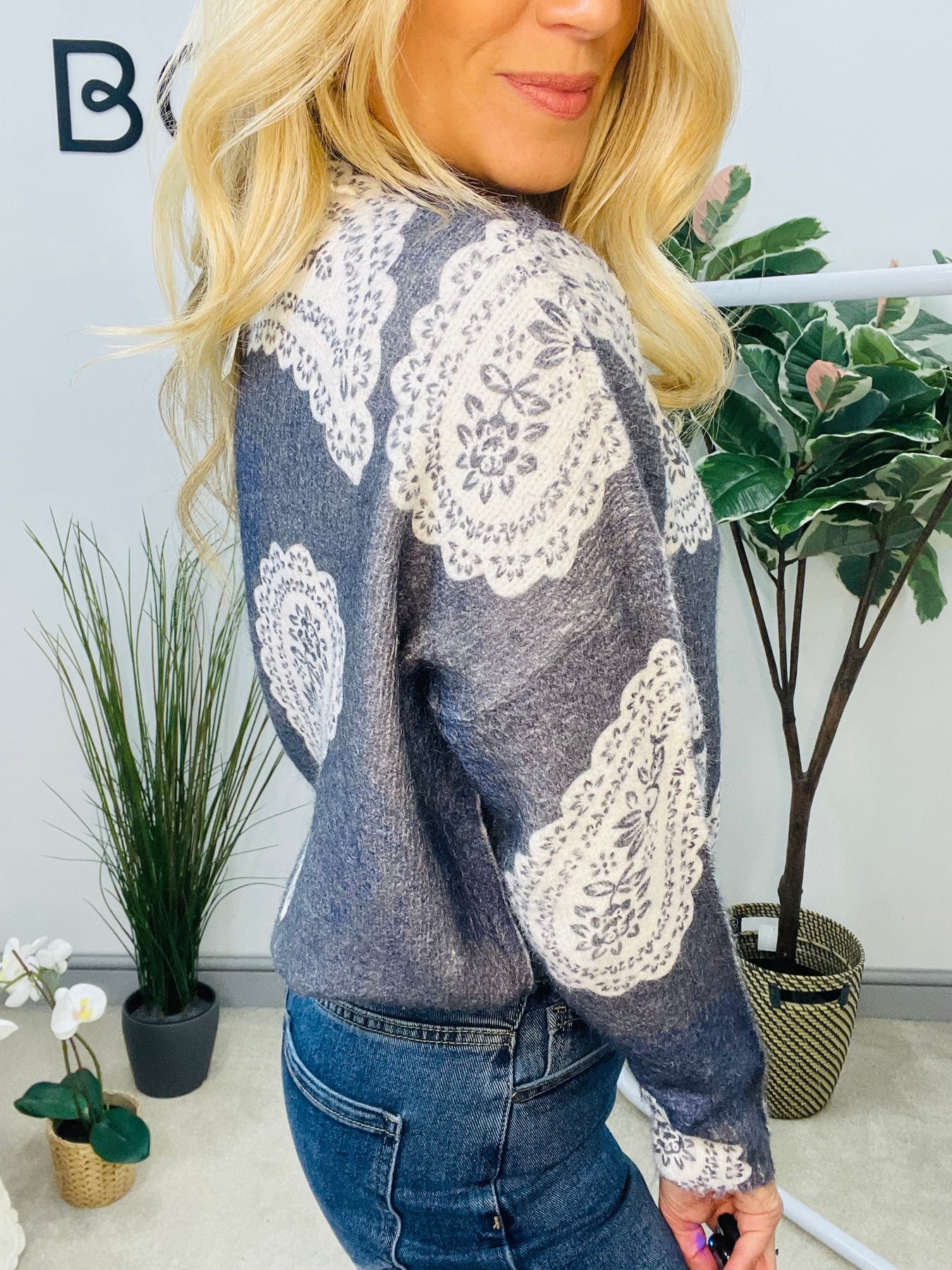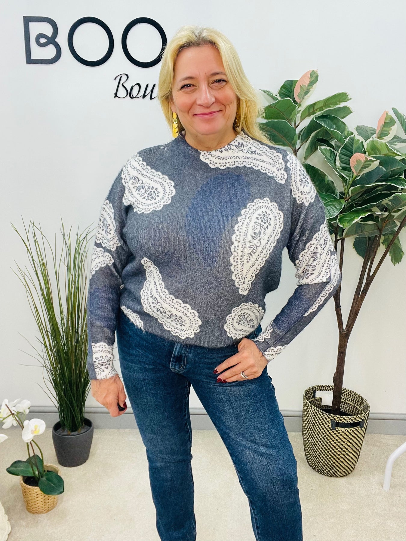 Introducing the EMMA jumper - a stunning addition to your wardrobe! Crafted from a soft and luxurious knit, this jumper features a beautiful paisley print. Pair it effortlessly with your favourite blue or white jeans for a stylish and comfortable look. Elevate your fashion game with the EMMA jumper.