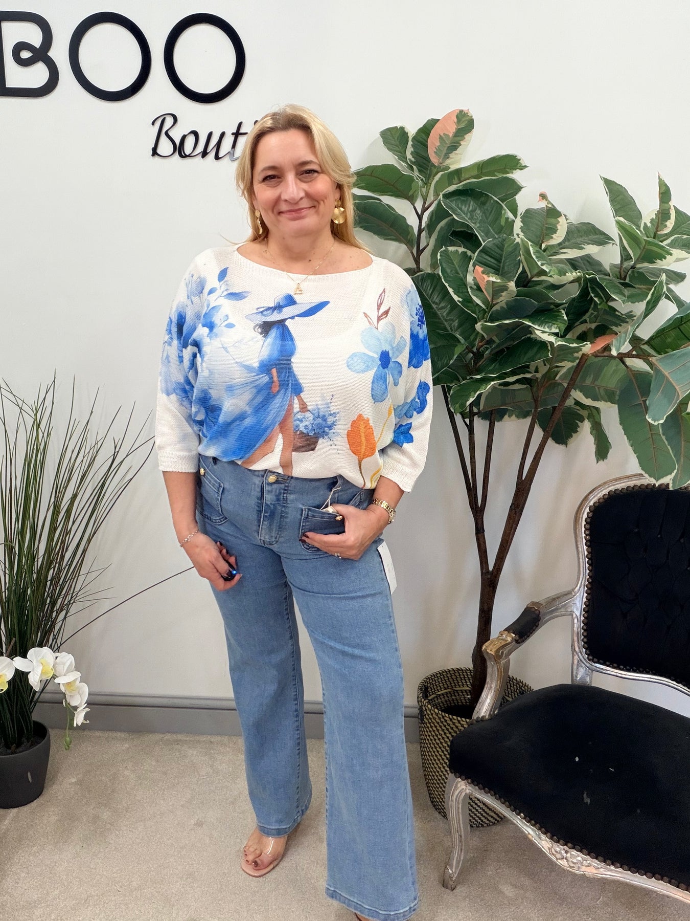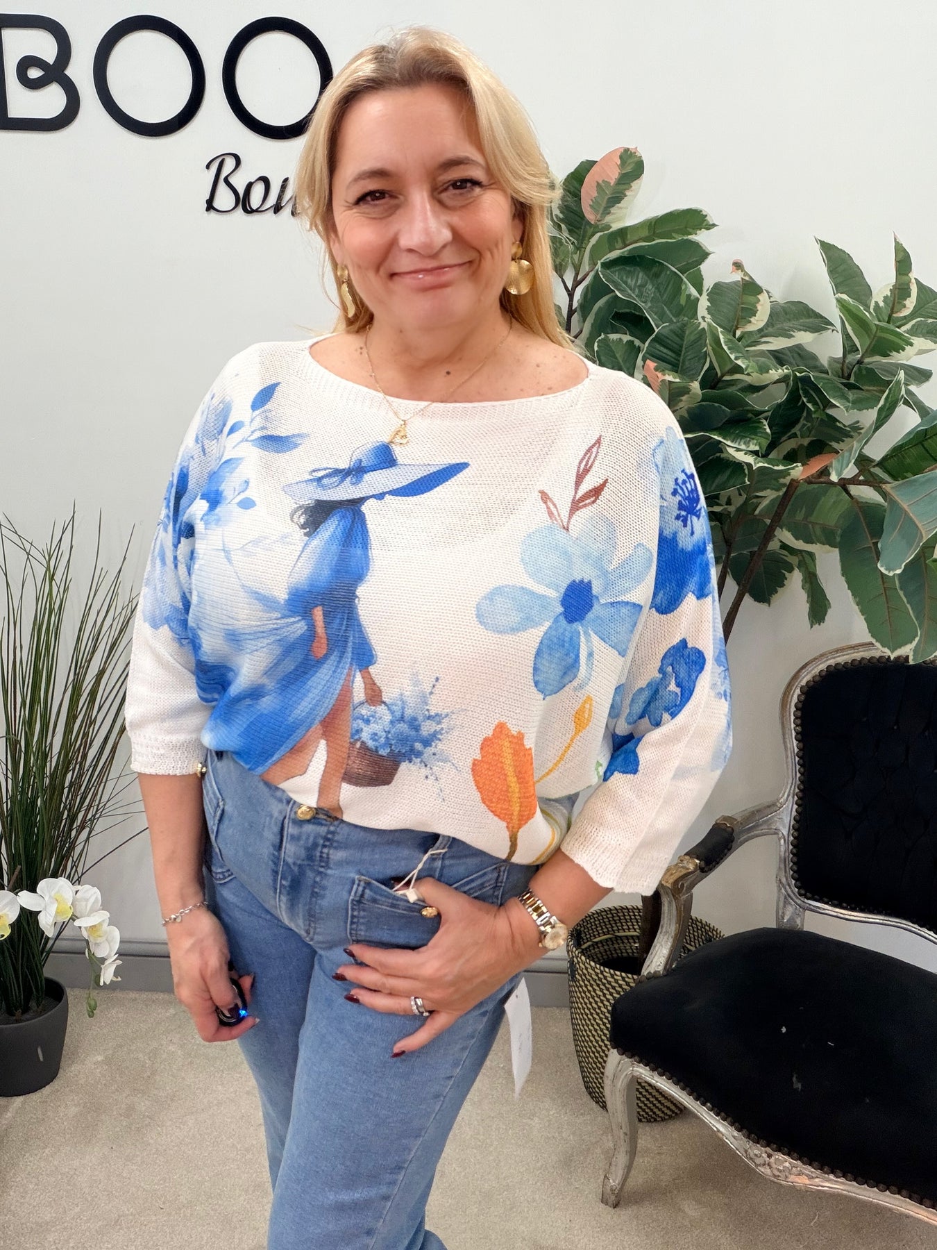 Elevate your wardrobe with The ENYA top! This beautiful fine knit batwing sleeve top, featuring a charming lady print, is designed for comfort and effortless style. Available in two stunning colours, it fits sizes 8 to 16.