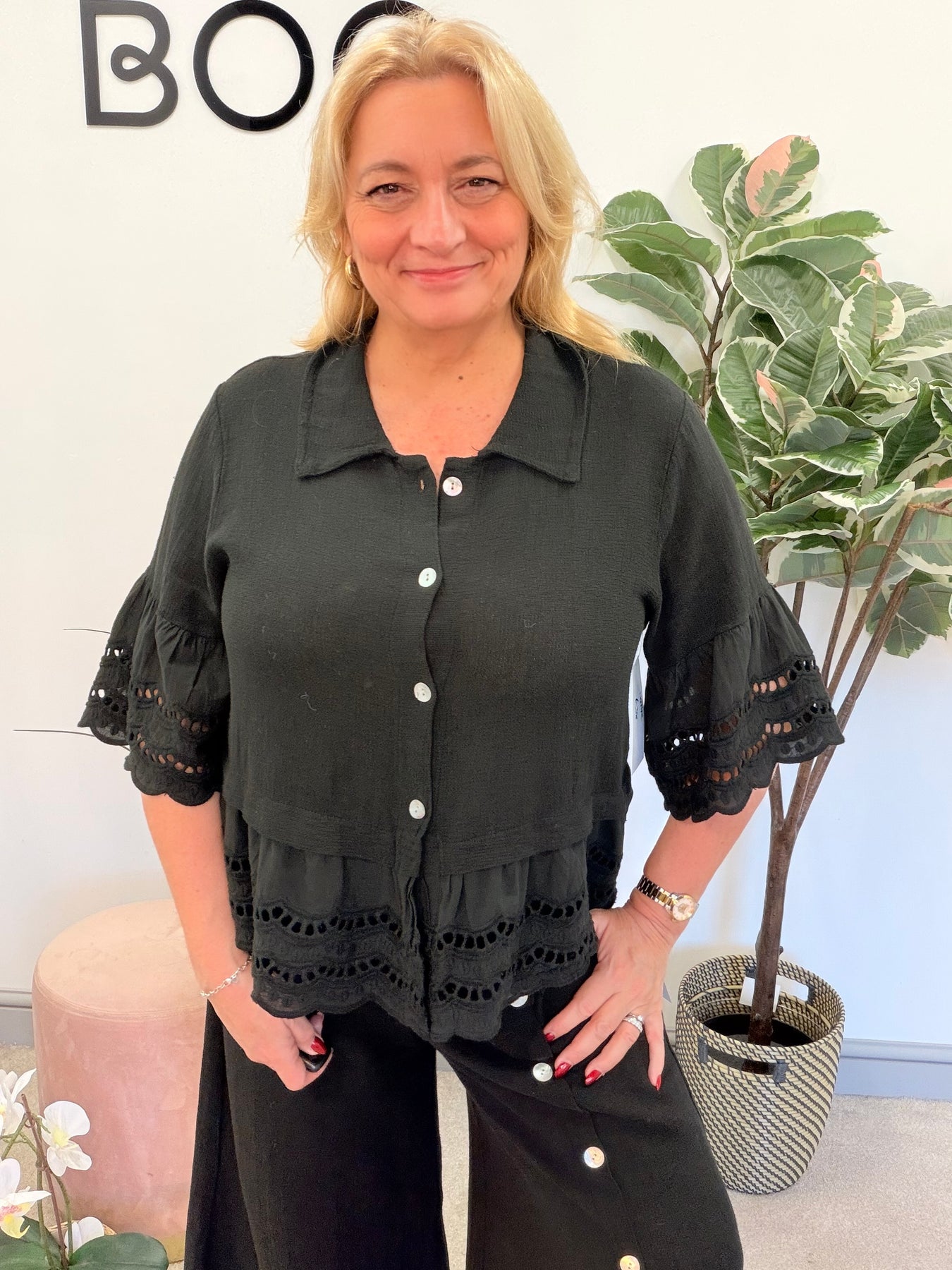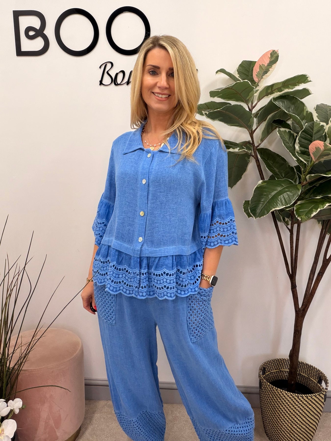 Elevate your summer wardrobe with The HATTIE teabag top! This charming linen button-up features delicate broderie anglaise sleeves and hem, ensuring you stay stylish and comfortable. Perfectly designed for sizes 8 to 14/16, pair it with the FLOSS or MAD trousers or the WILMA skirt for a coordinated look that radiates effortless chic!