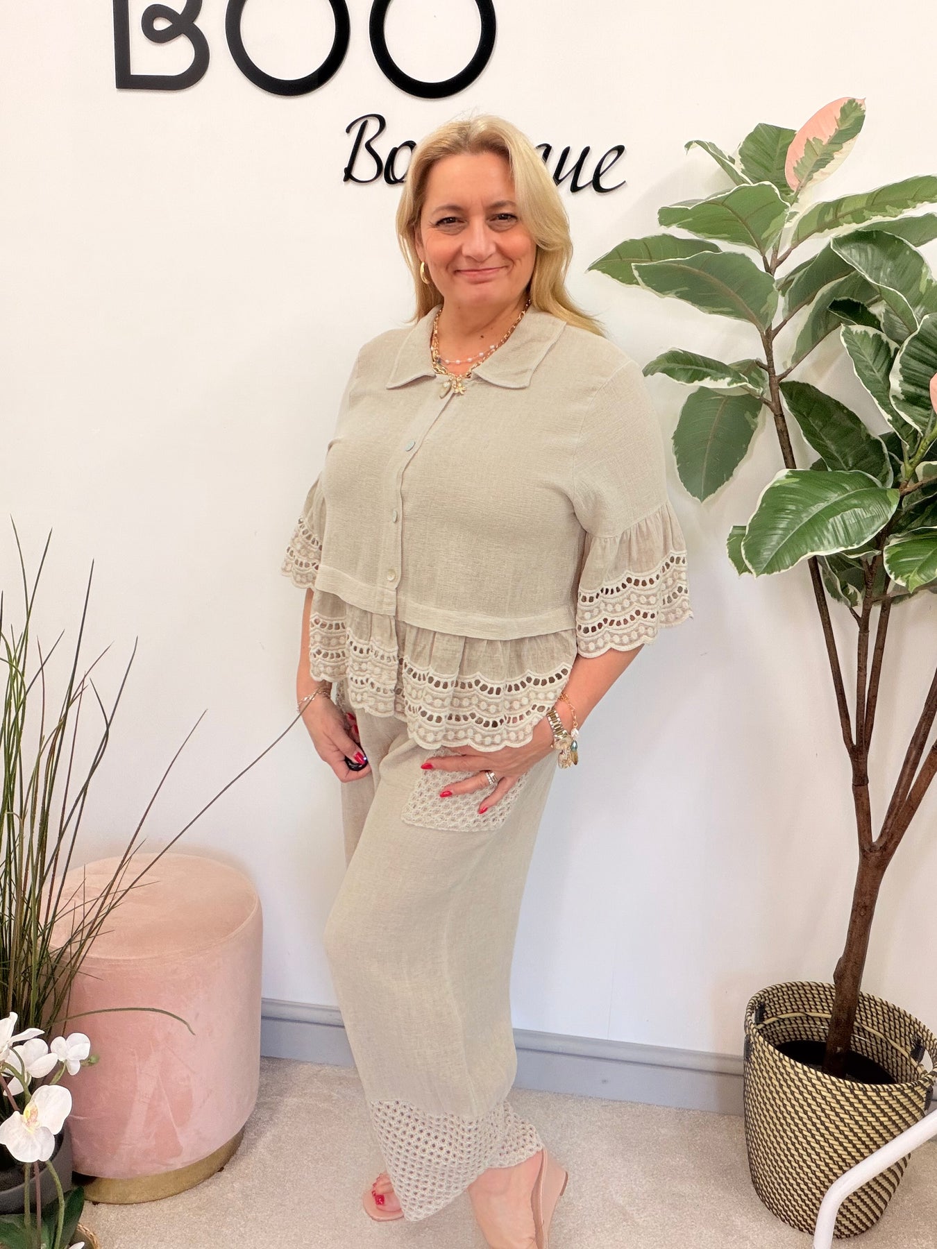 Ladies Fashion Broderie Anglaise Teabag Linen Top light beige