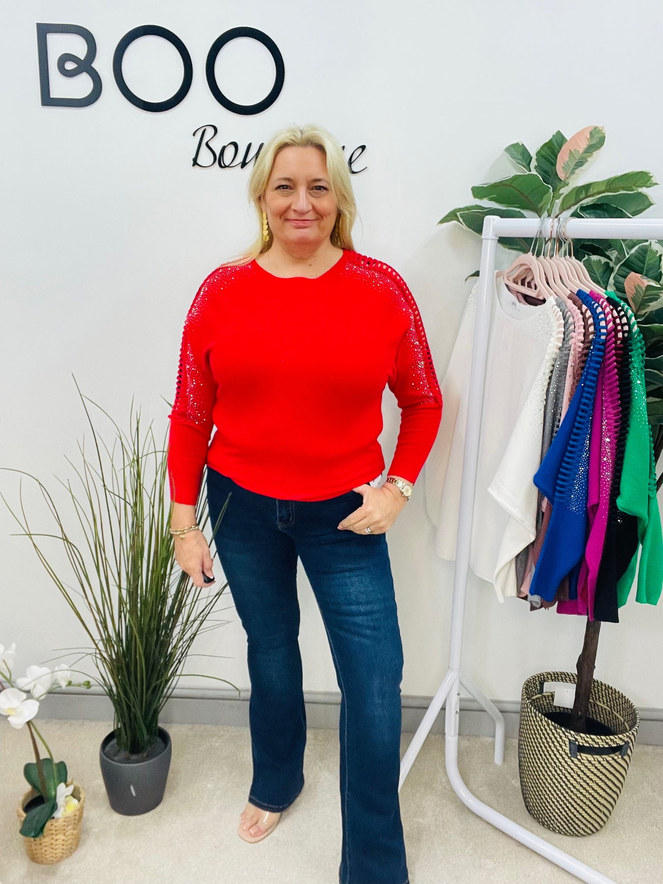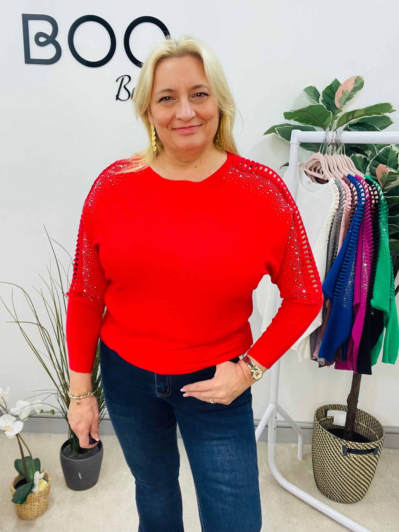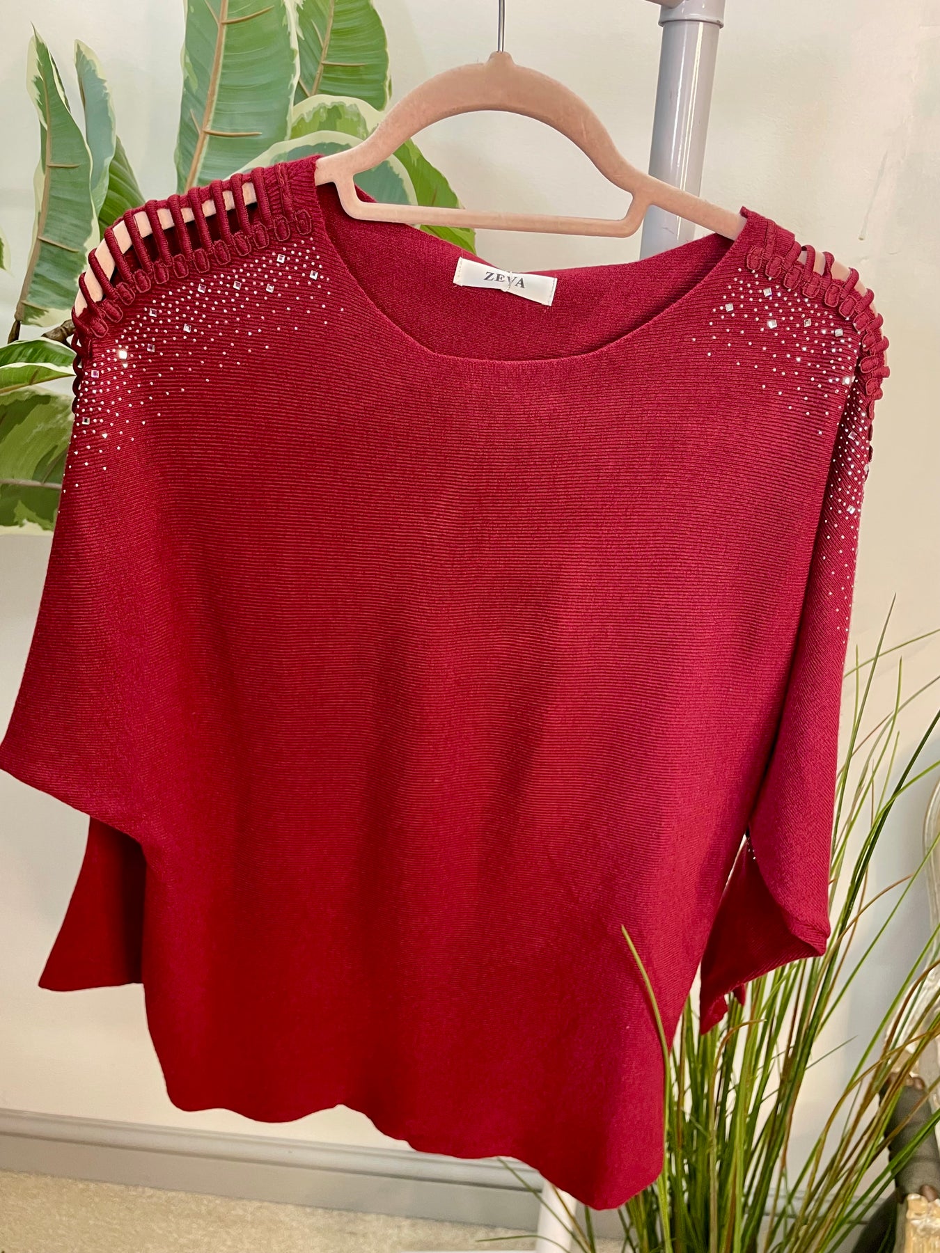 LADIES DIAMANTE BATWING JUMPER BURGUNDY WINE