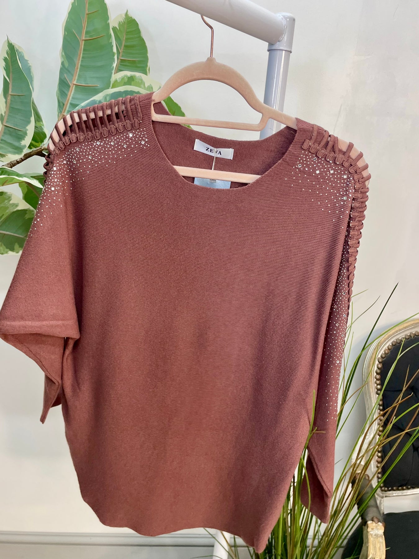 LADIES DIAMANTE BATWING JUMPER CHOCOLATE BROWN
