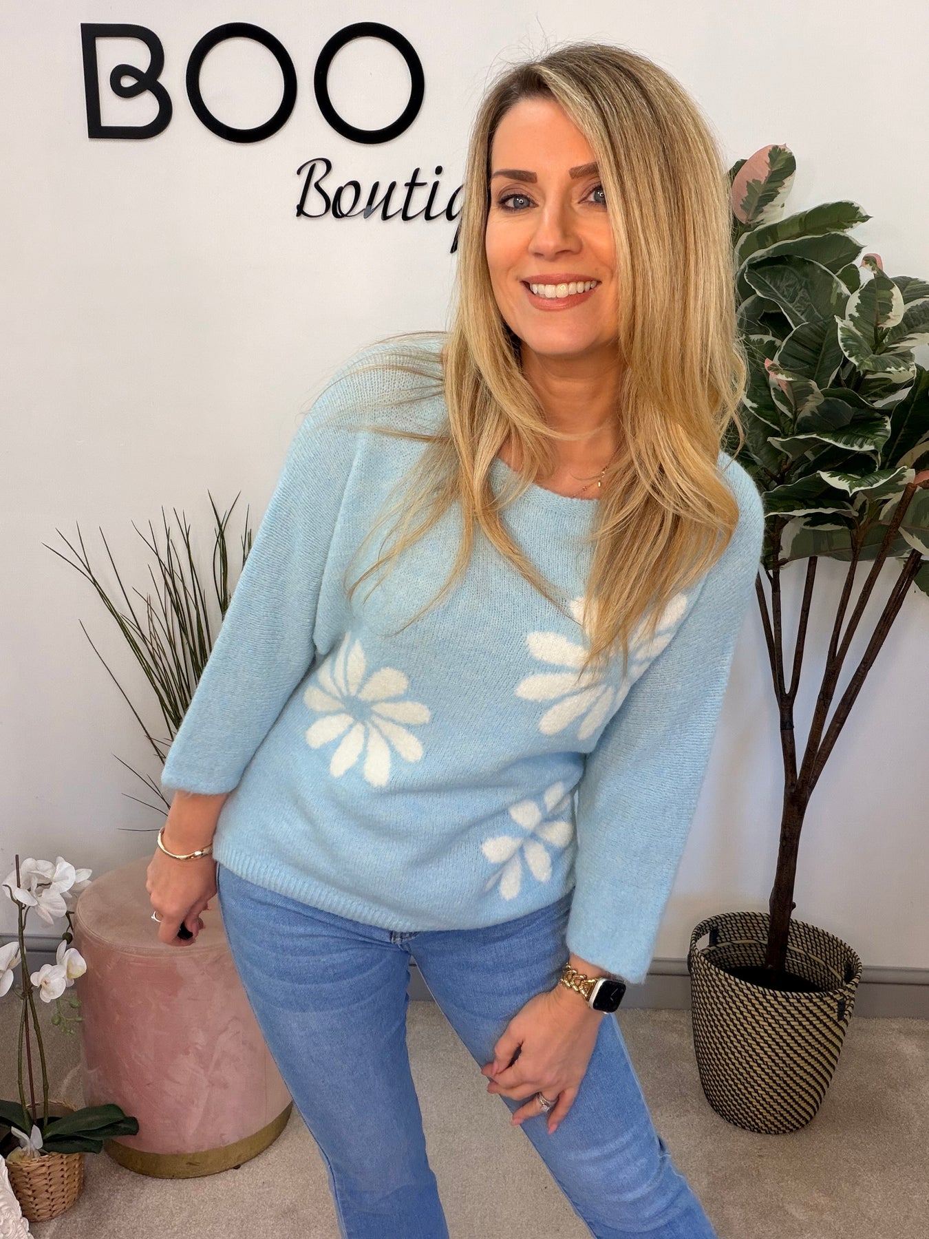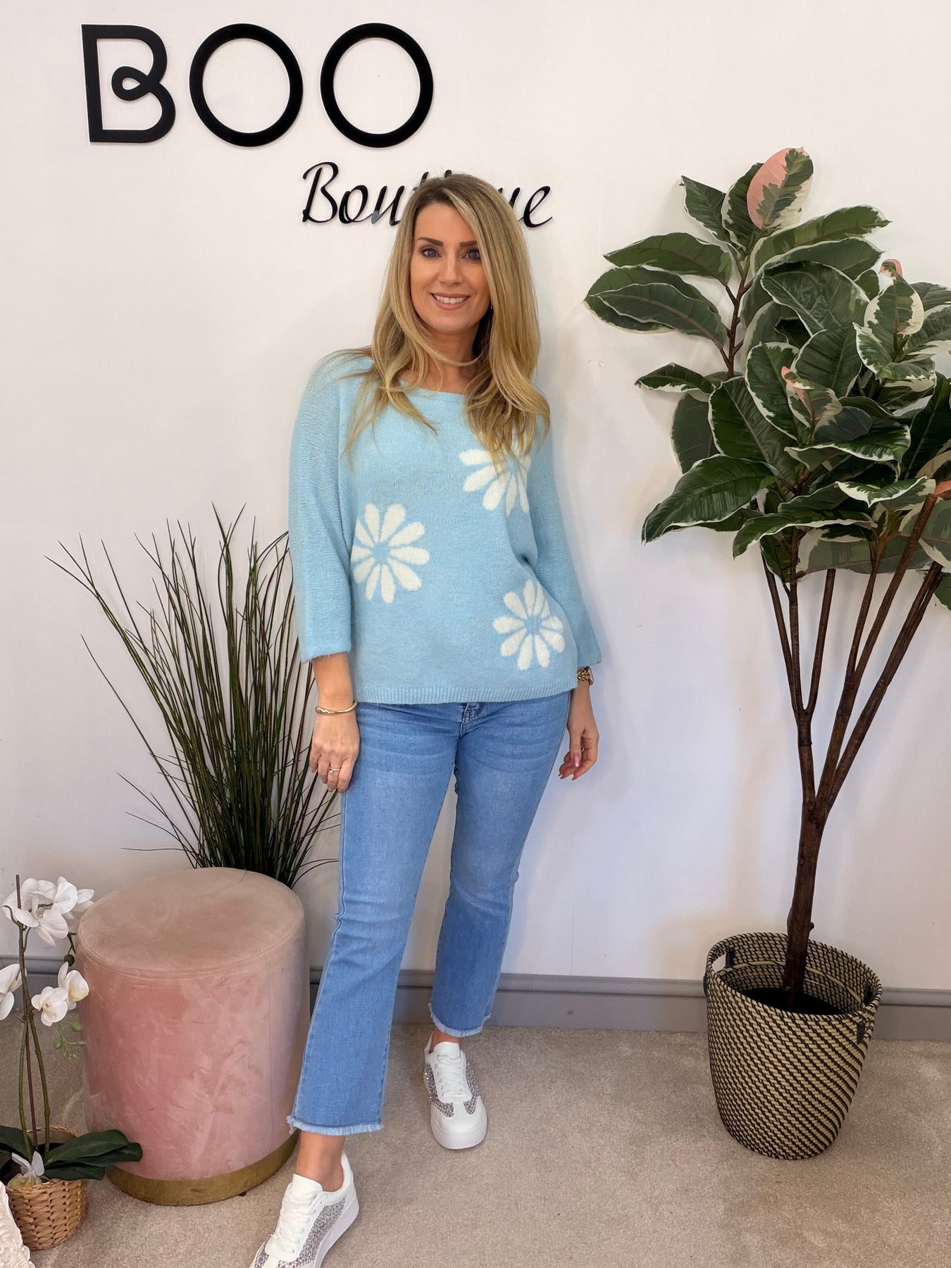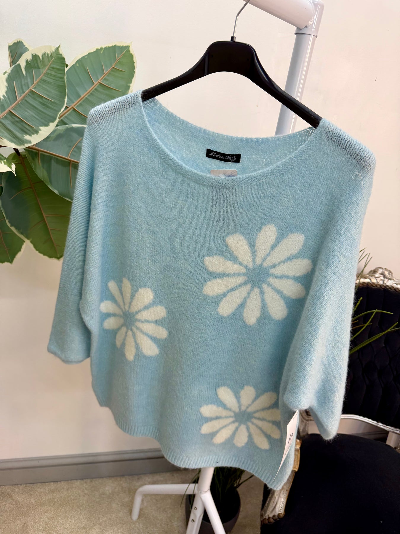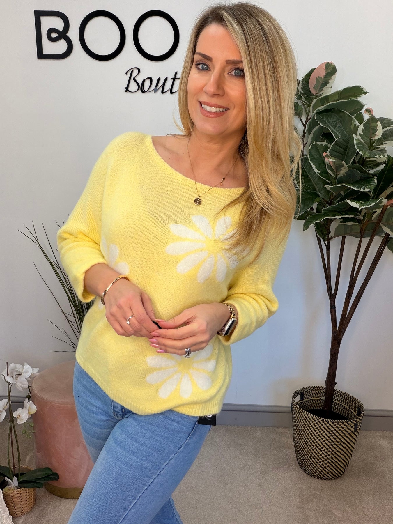 Ladies Fashion Daisy Short Sleeve Jumper - lemon, blue, white & pink