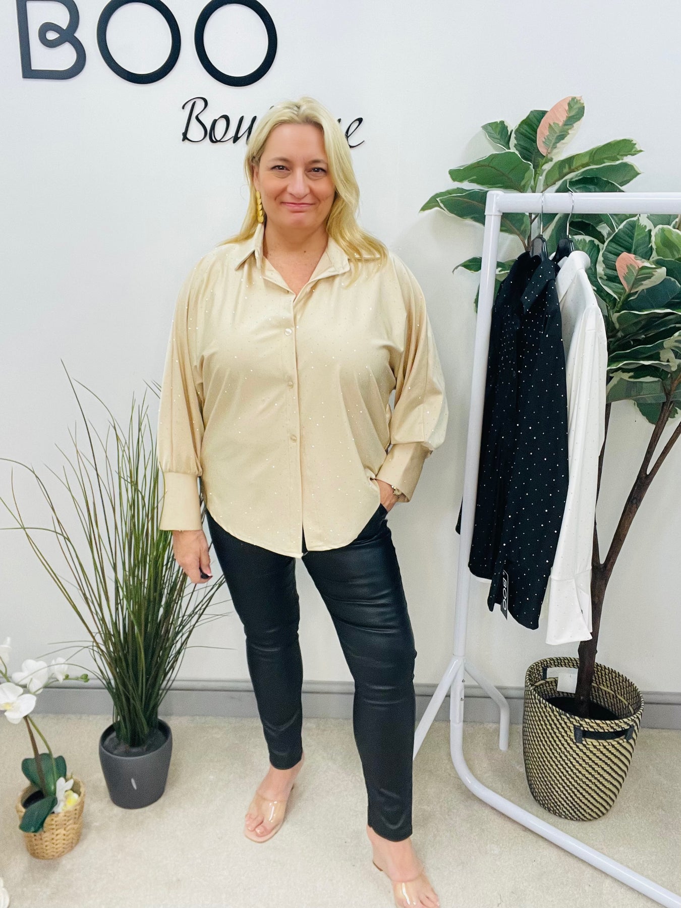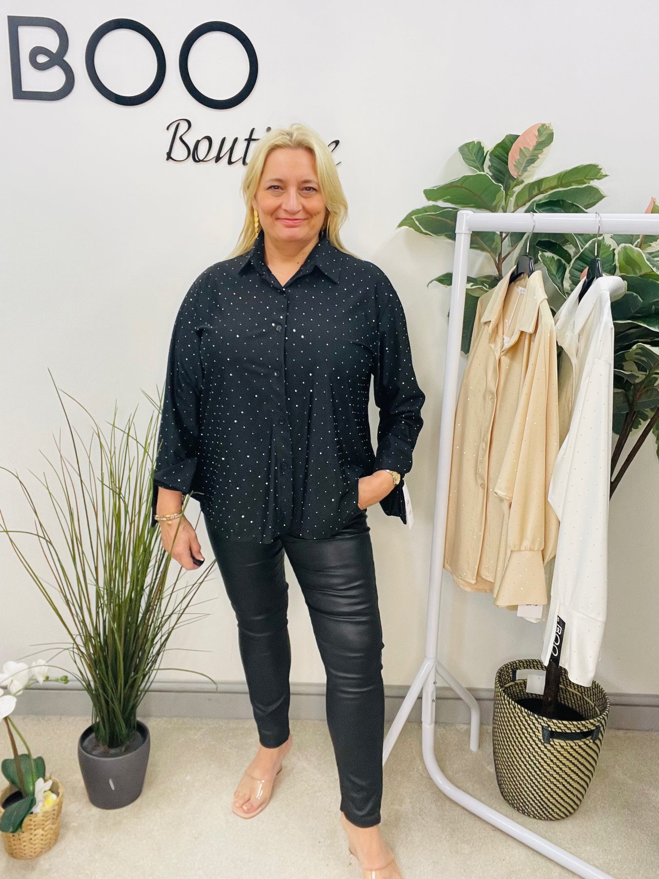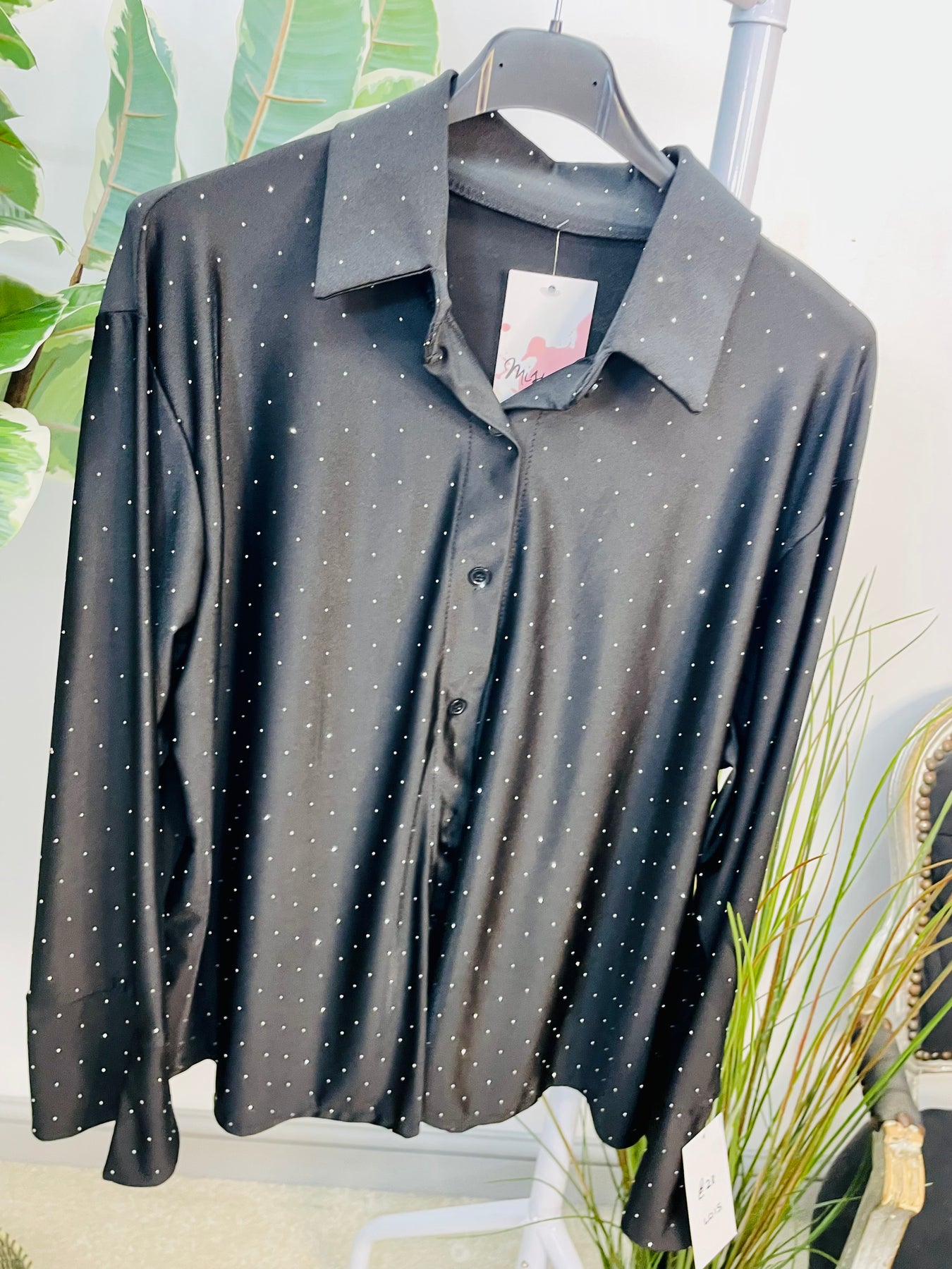 Elevate your wardrobe with the LOIS sparkly shirt, available in 3 stunning colours. Made with a gorgeous slinky fabric, this shirt features a button-up front and sparkly stud detailing. Versatile and flattering, it fits sizes 12 to 18. Upgrade your style with this must-have piece.