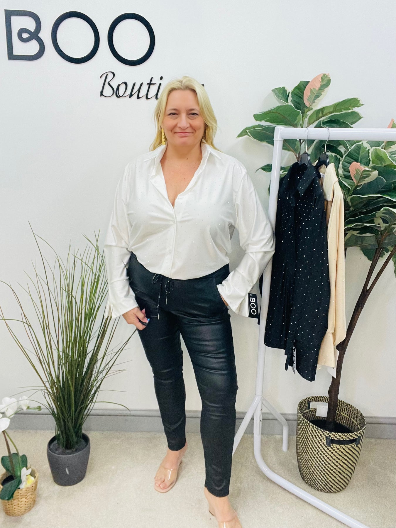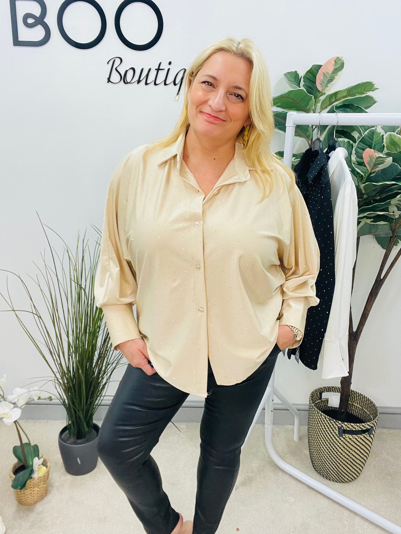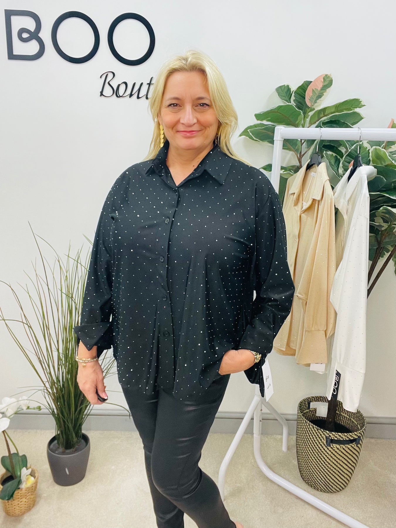 Elevate your wardrobe with the LOIS sparkly shirt, available in 3 stunning colours. Made with a gorgeous slinky fabric, this shirt features a button-up front and sparkly stud detailing. Versatile and flattering, it fits sizes 12 to 18. Upgrade your style with this must-have piece.