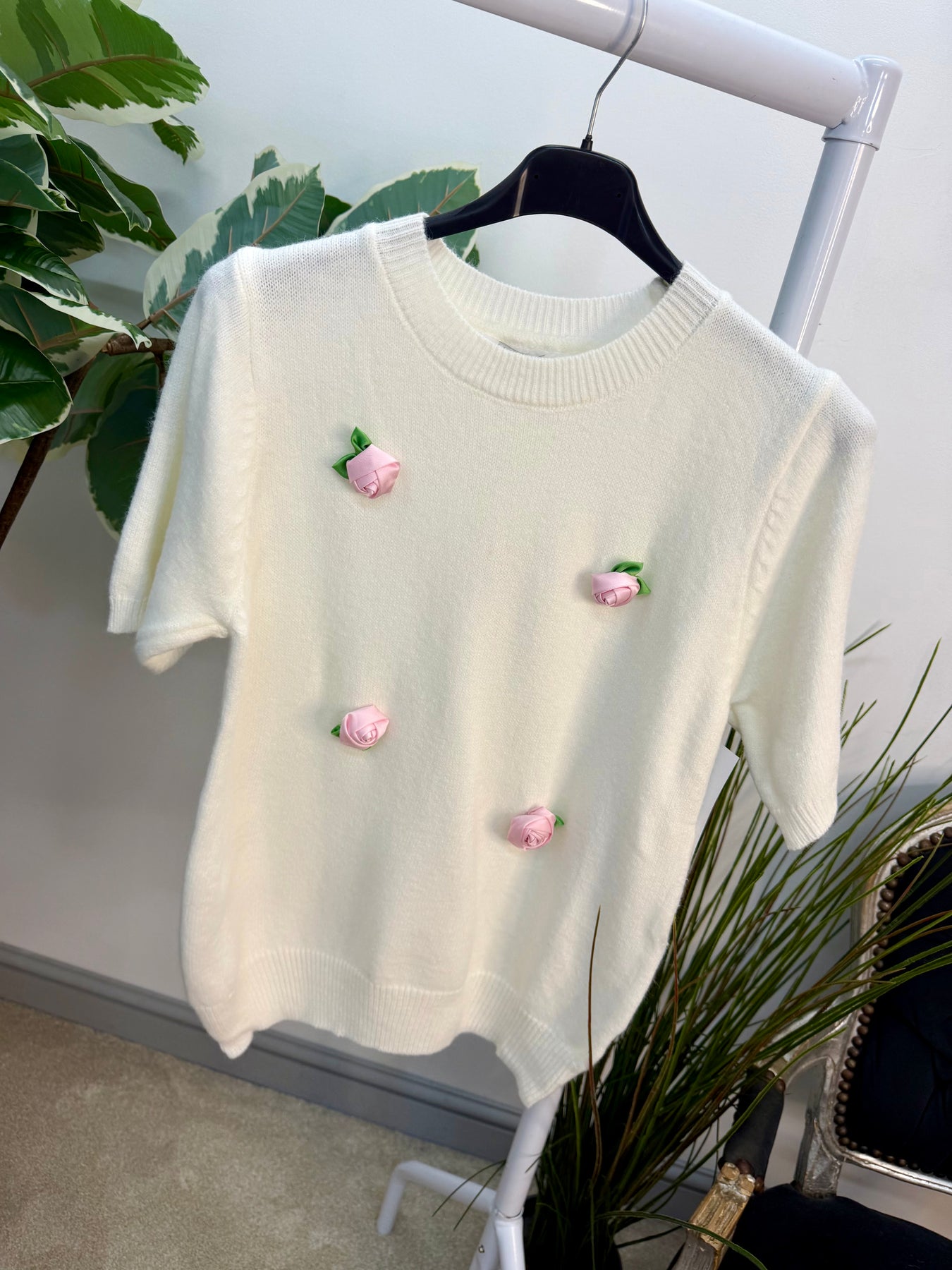 Pretty soft knit short sleeve jumper with cute satin rose detail