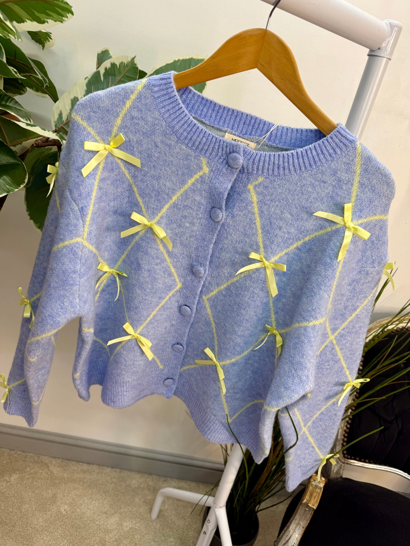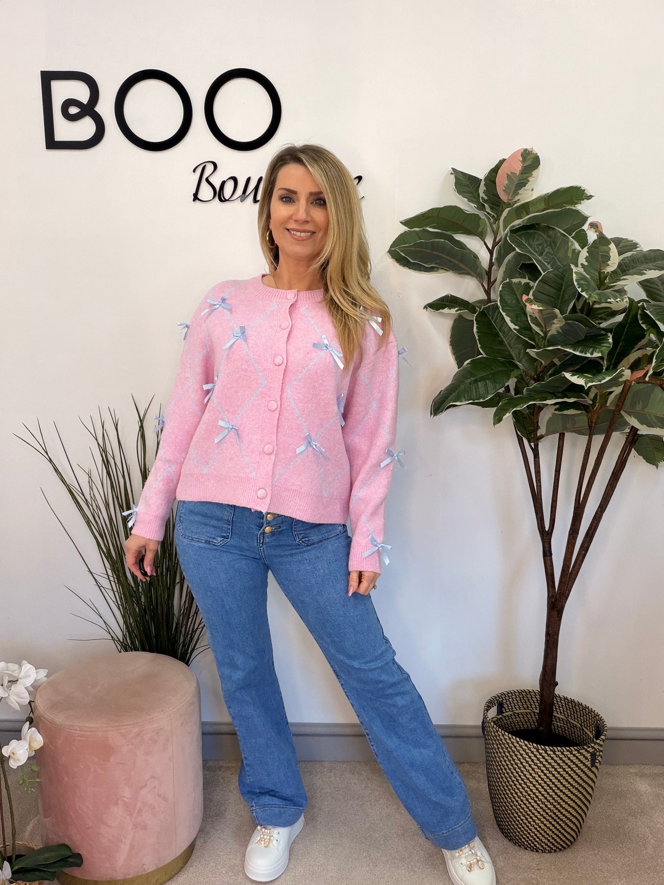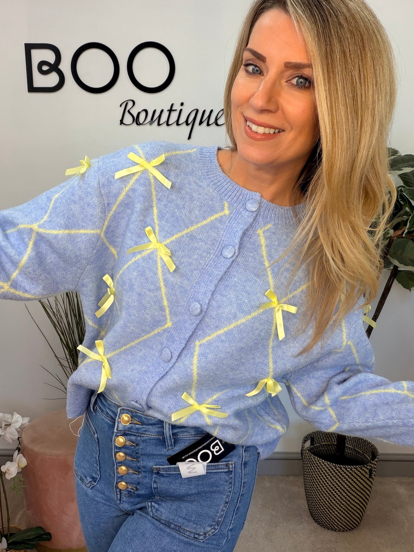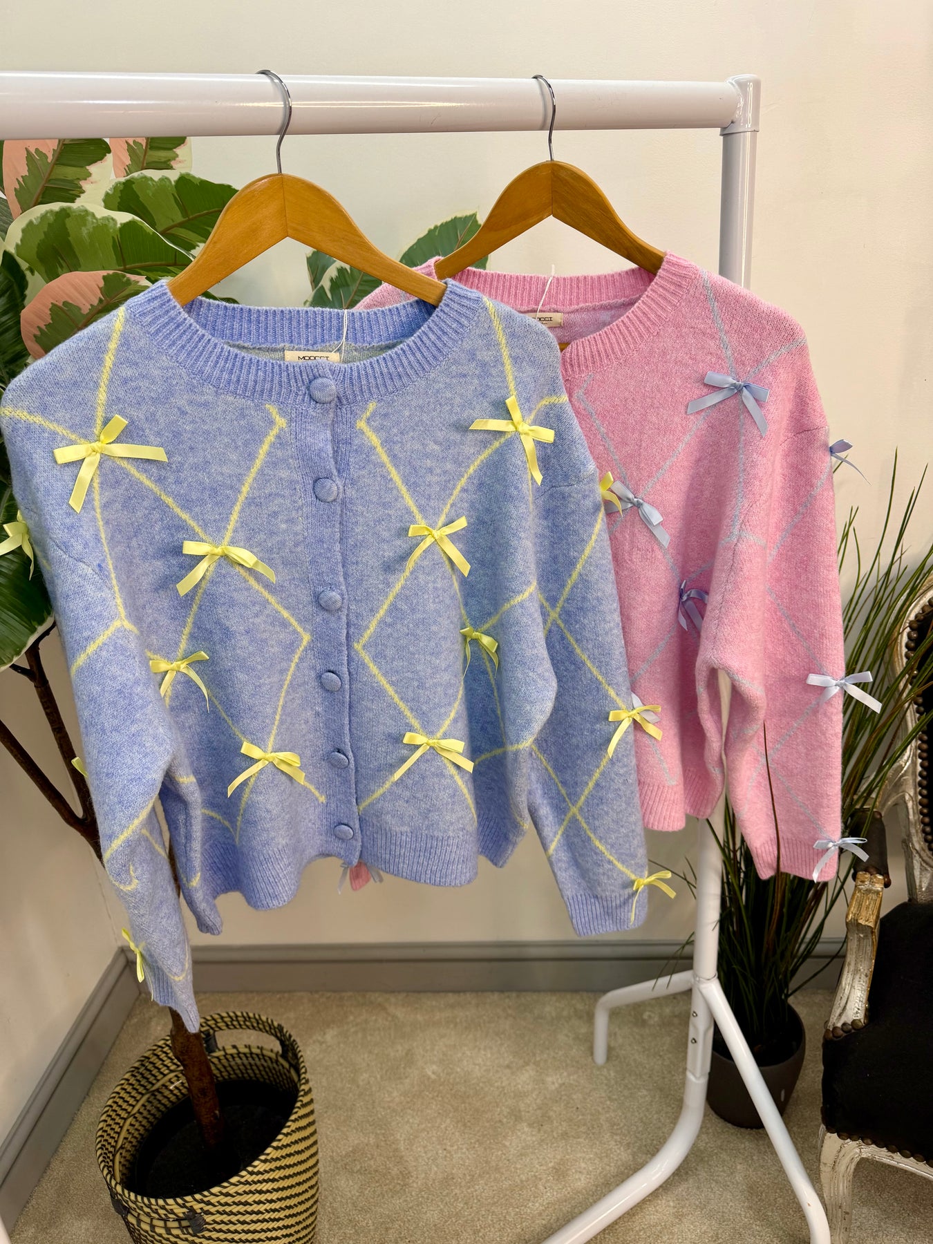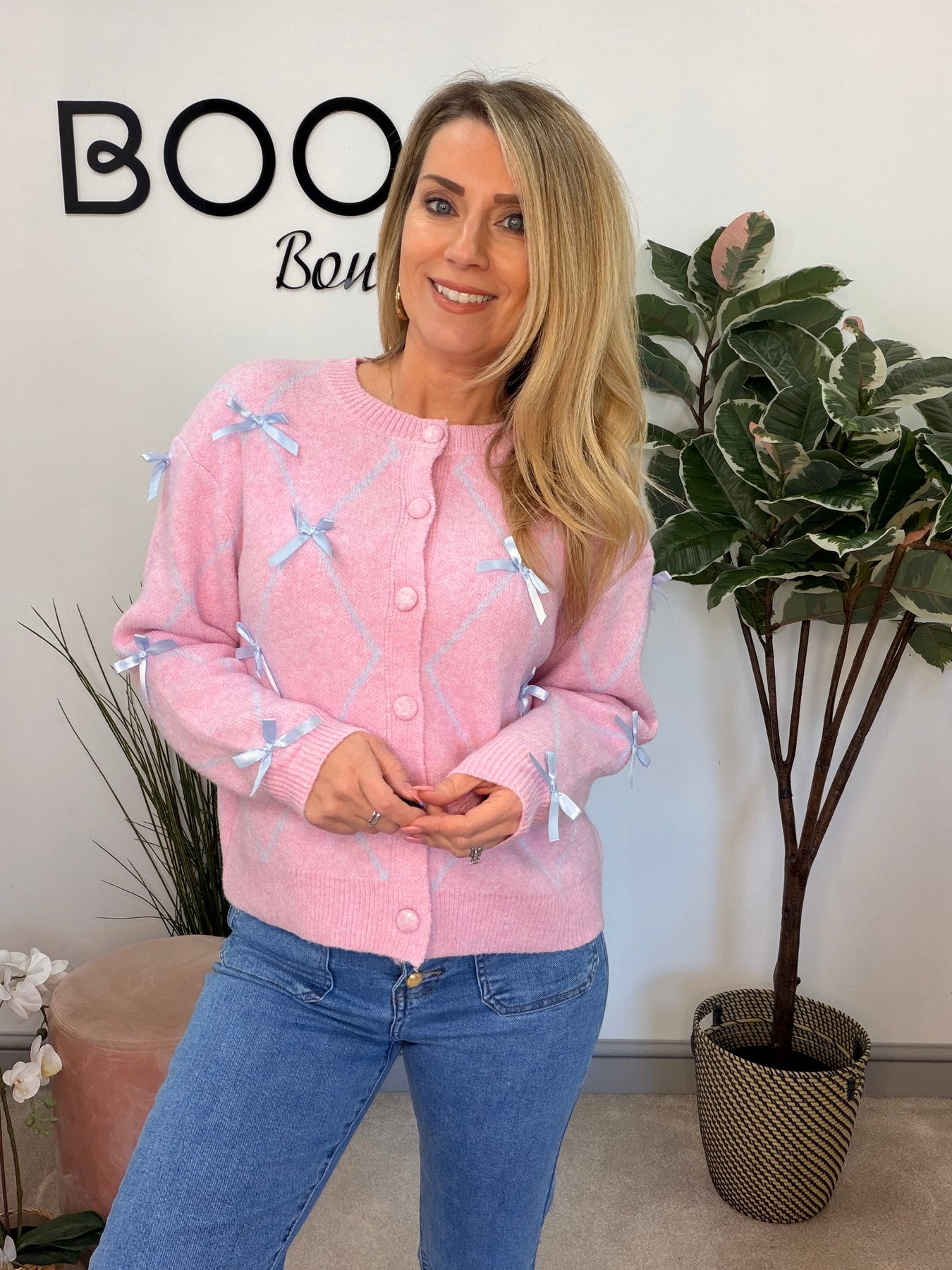 Ladies Fashion Soft Knit Satin Bow Cardigan - blue & pink