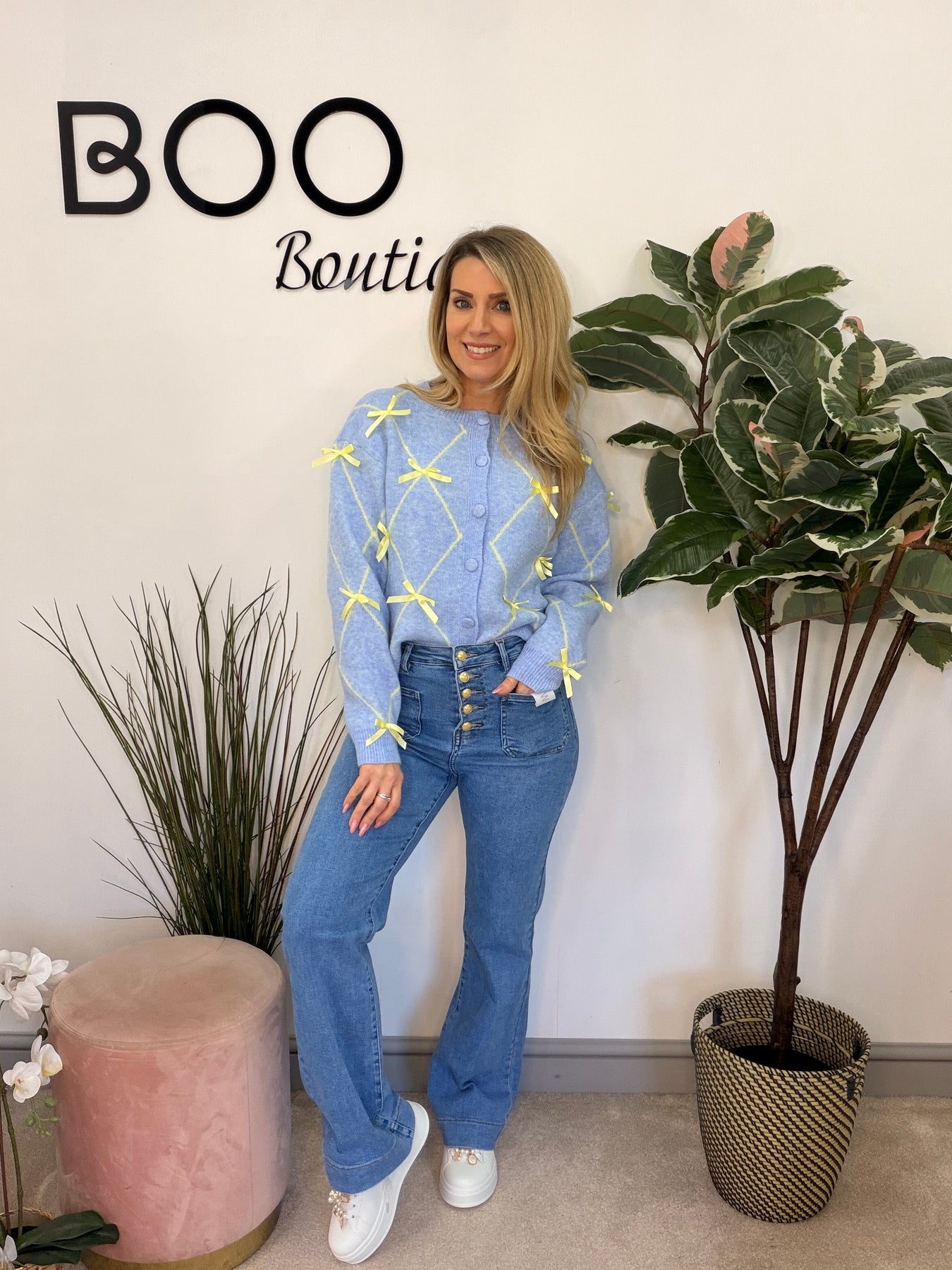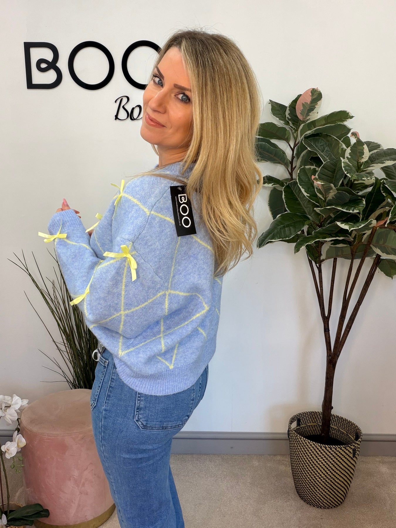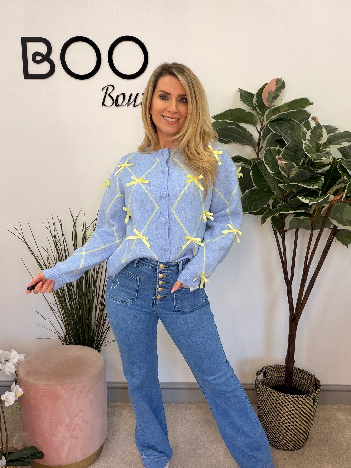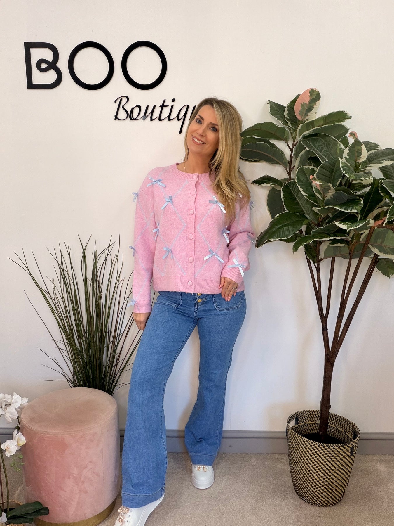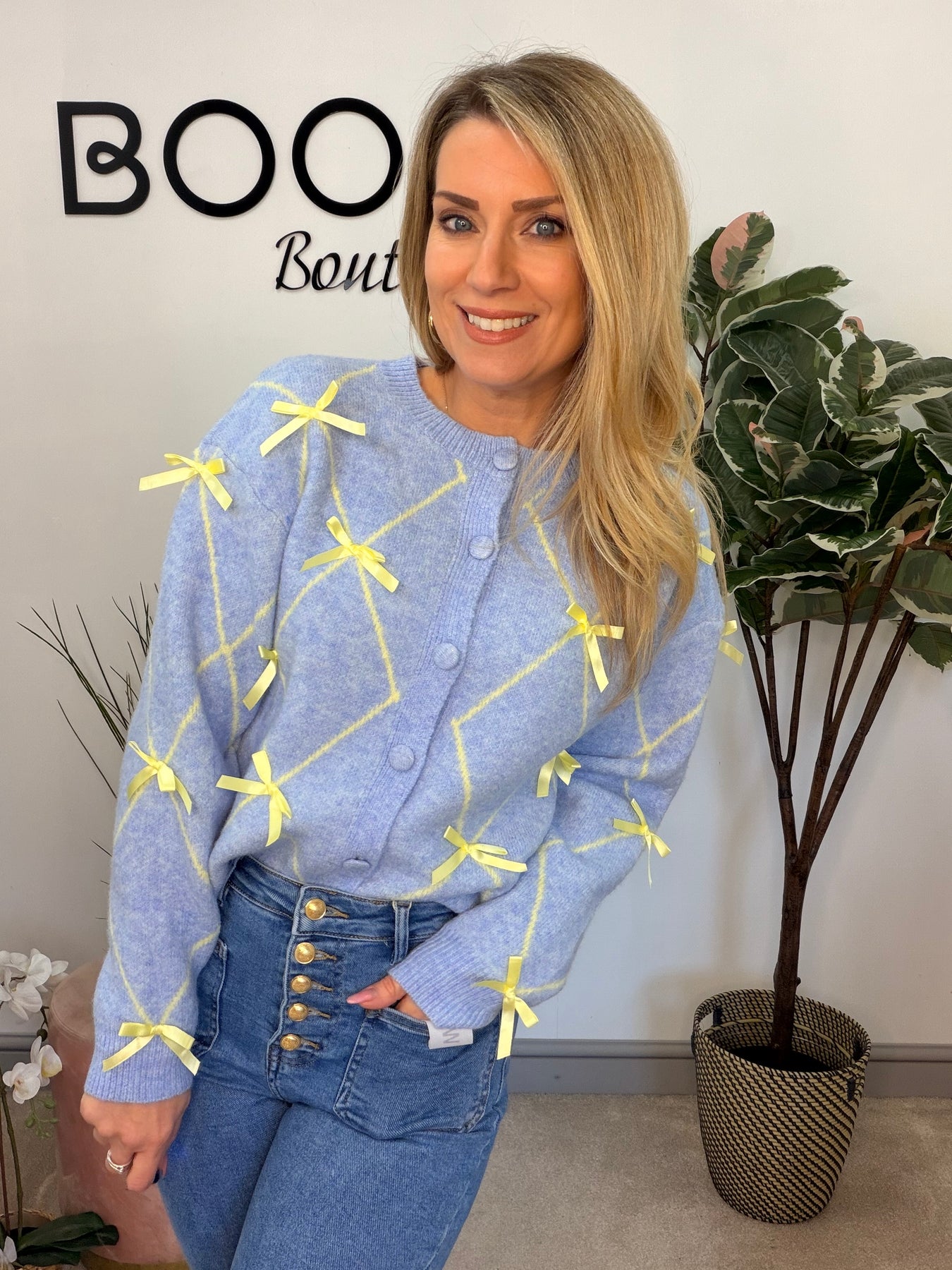 Ladies Fashion Soft Knit Satin Bow Cardigan - blue & pink