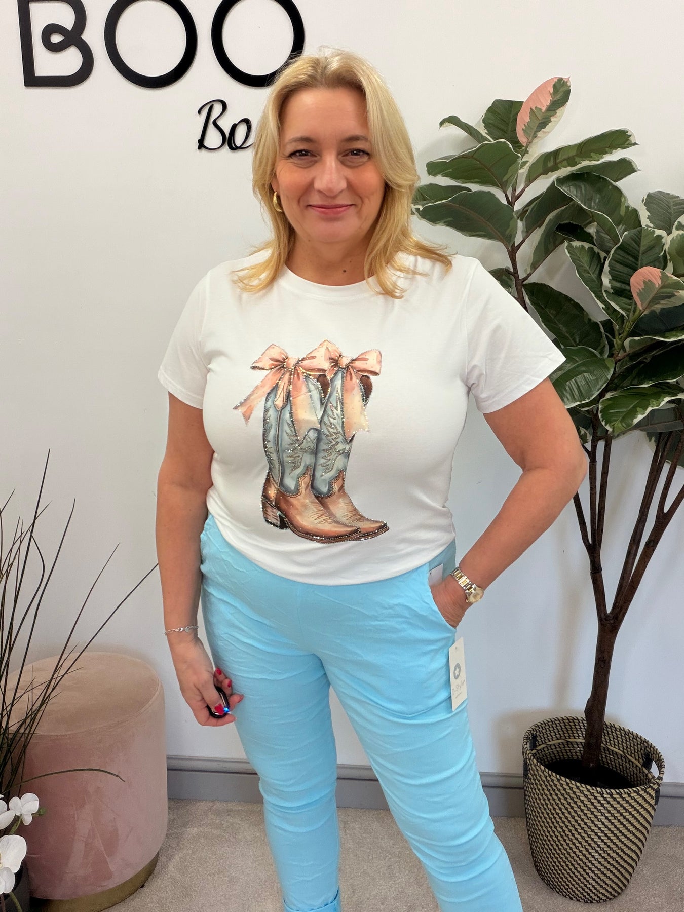 Ladies Fashion Stretch White T Shirt with cowboy boot logo