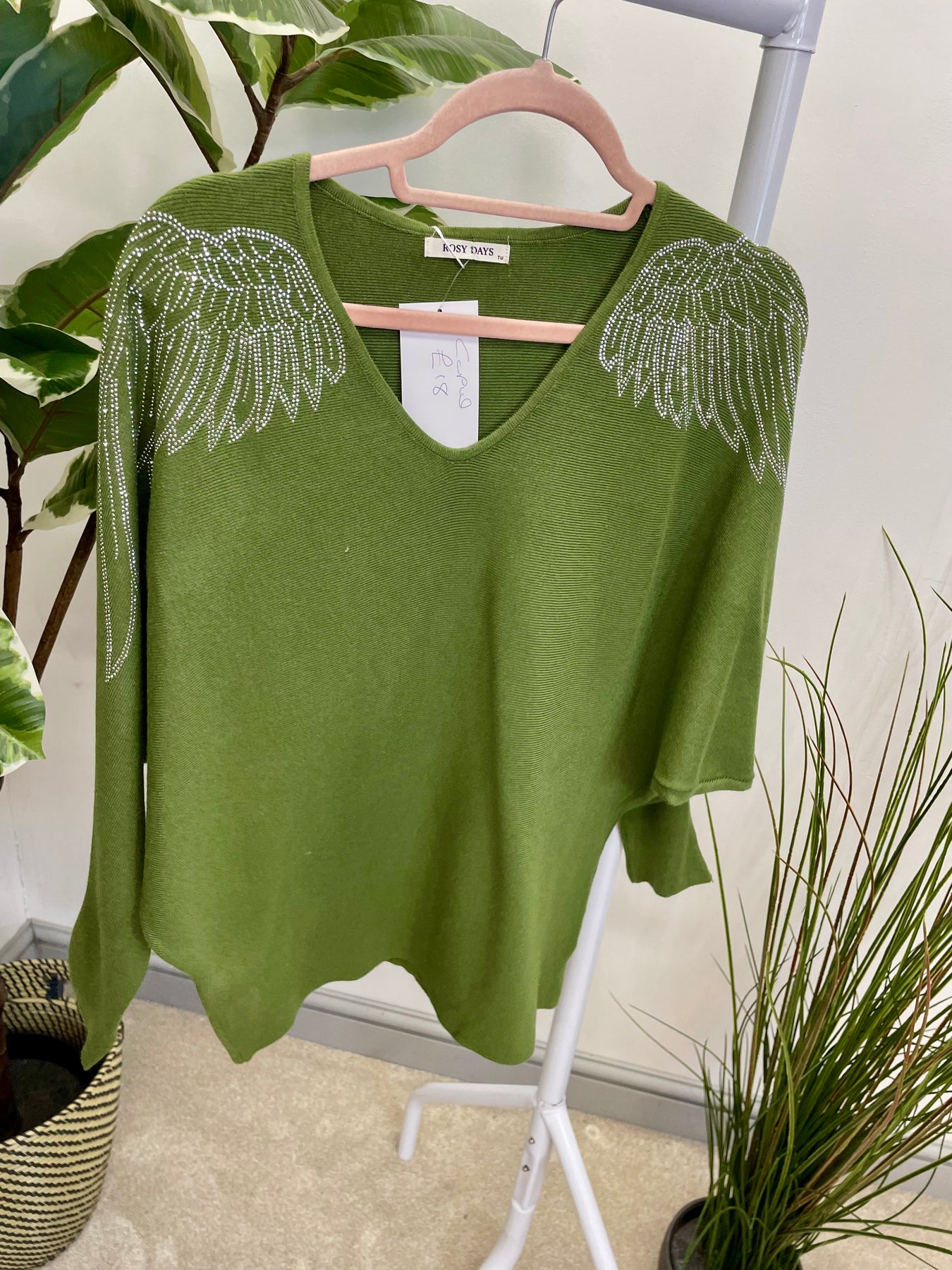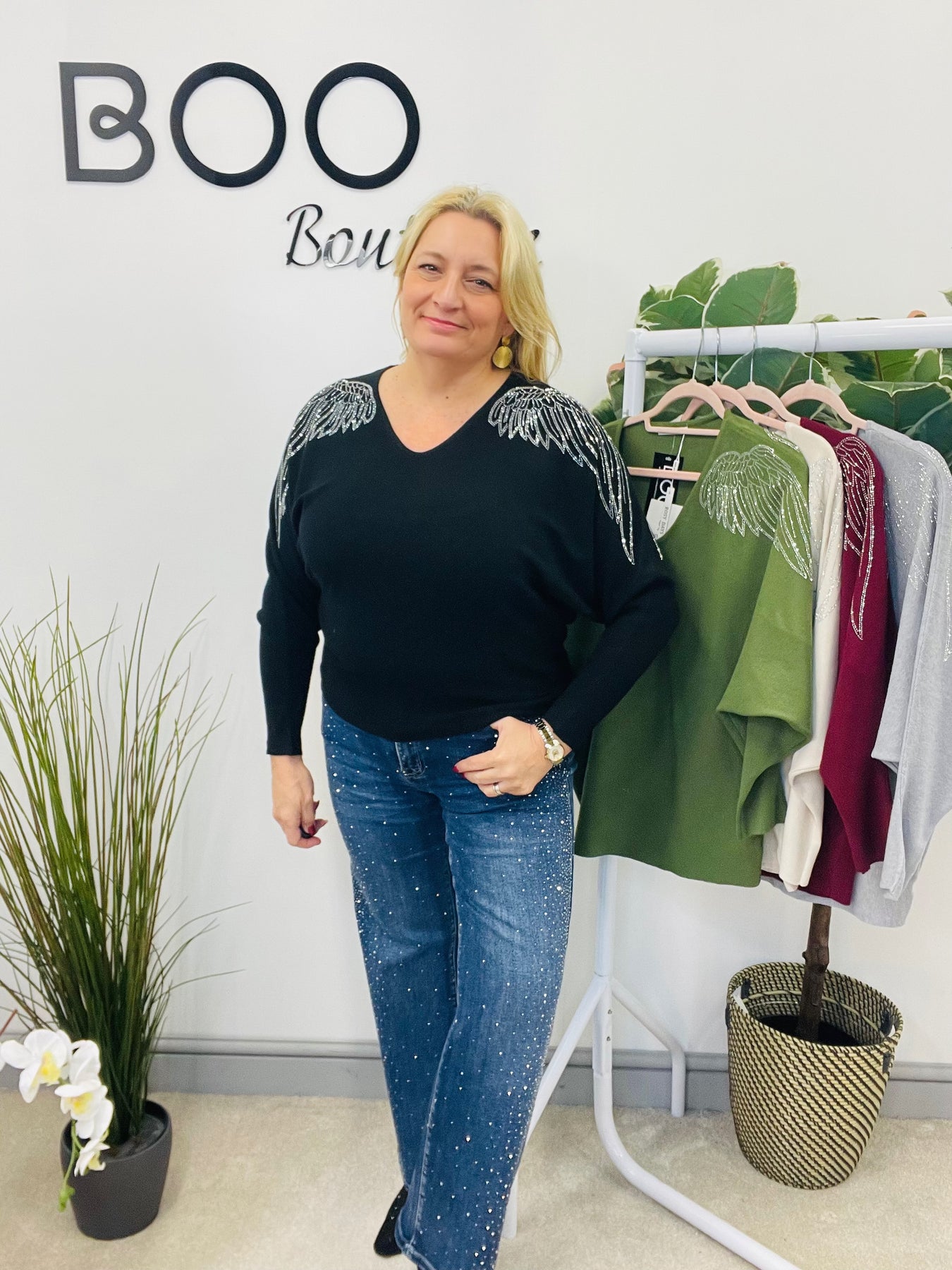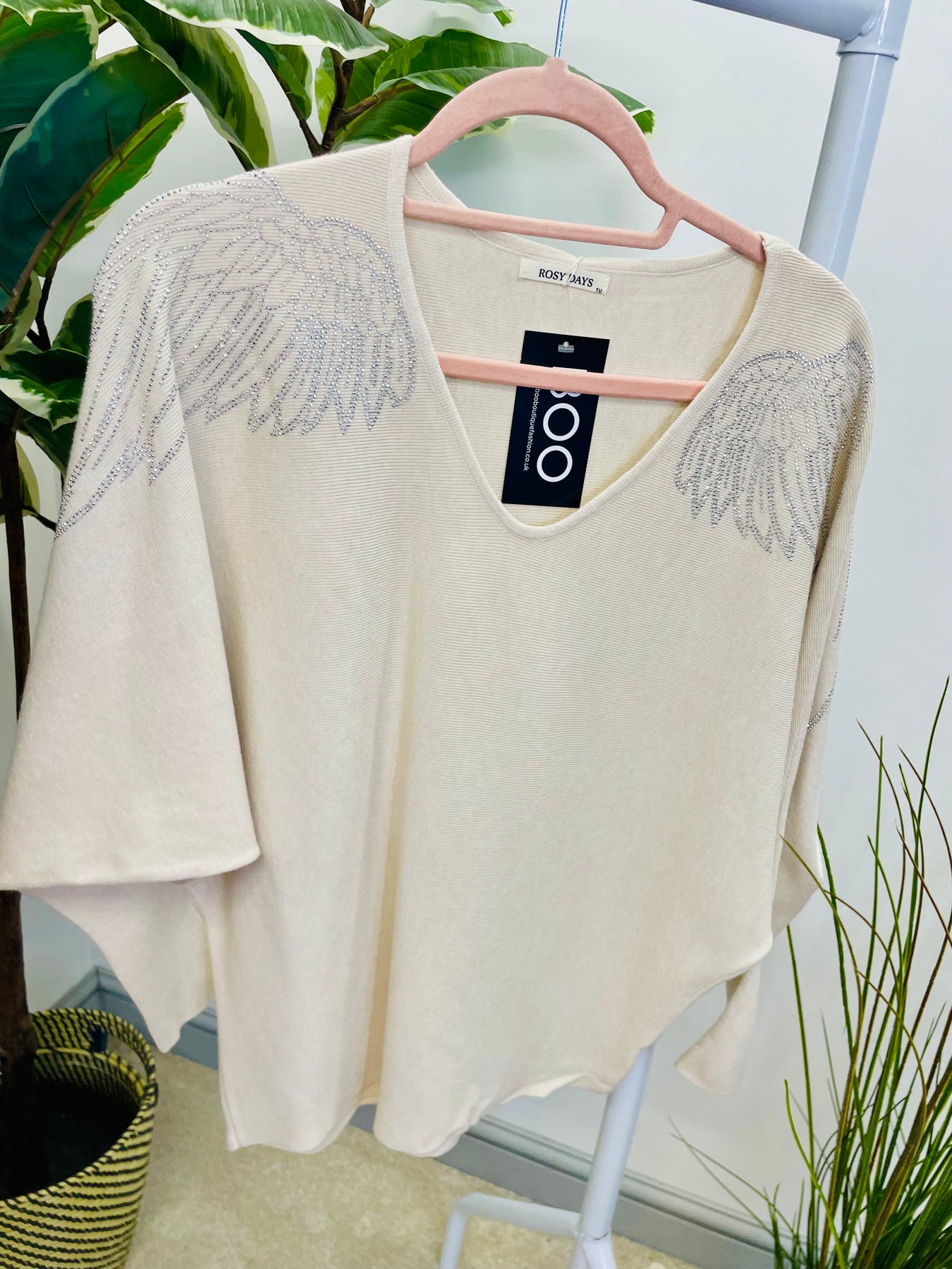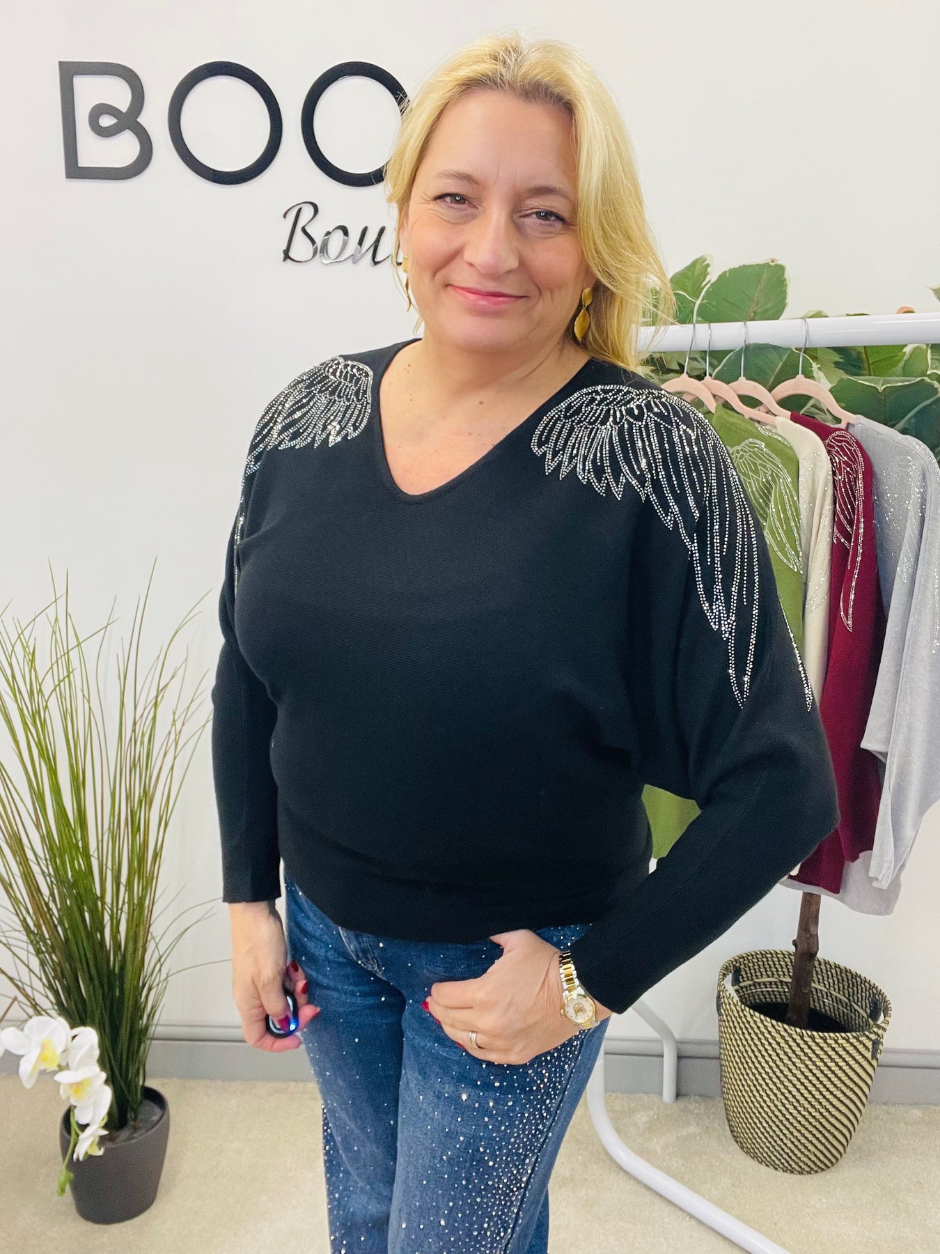 "The CUPID jumper is a must-have for any fashion-forward individual. Made with a soft knit fabric, it boasts batwing sleeves for ultimate comfort and style. The sparkle angel wing shoulder detail adds a touch of glamour to any outfit. This one-size garment fits sizes 8 to 16, making it the perfect versatile piece for any wardrobe."