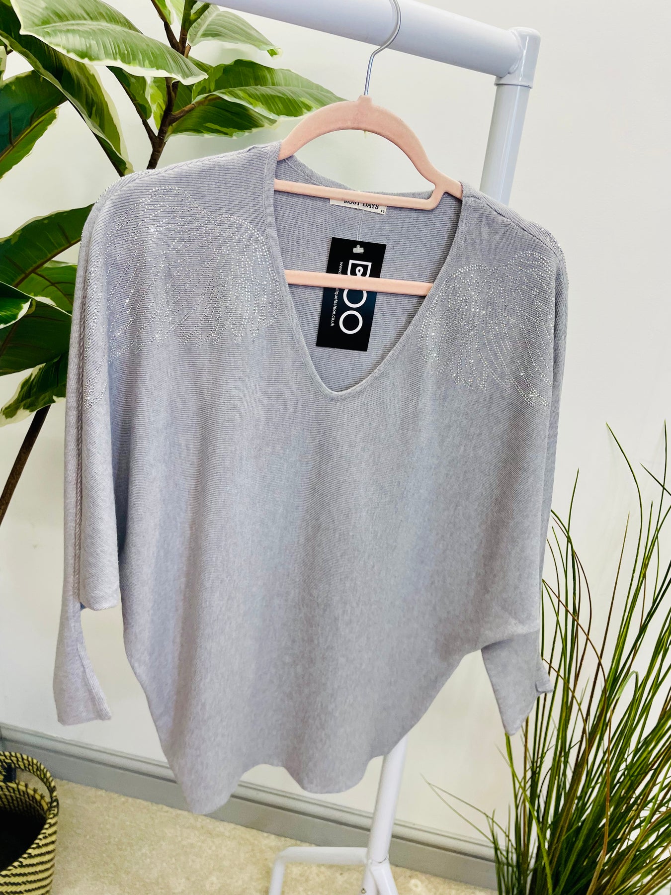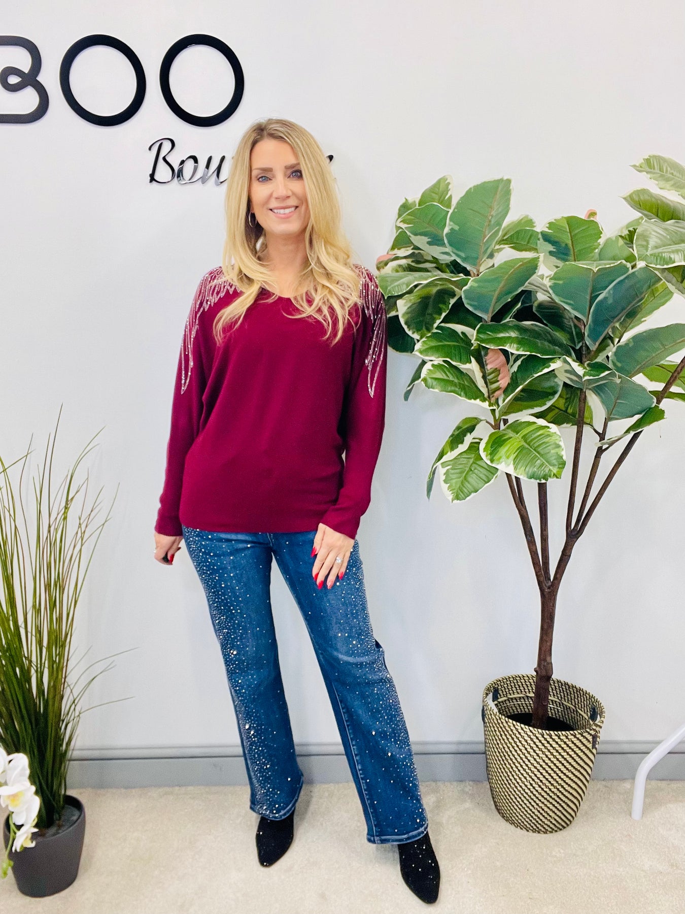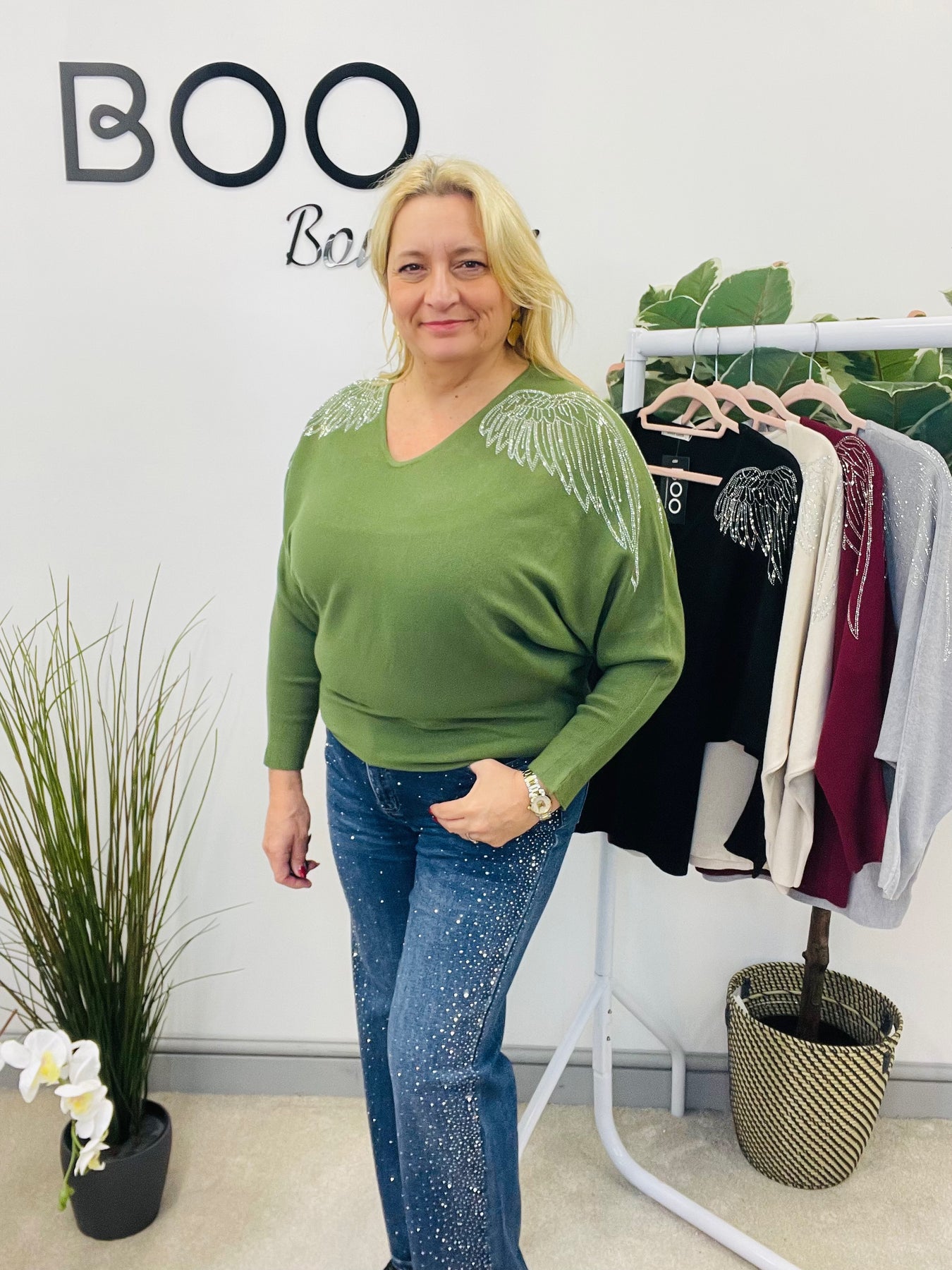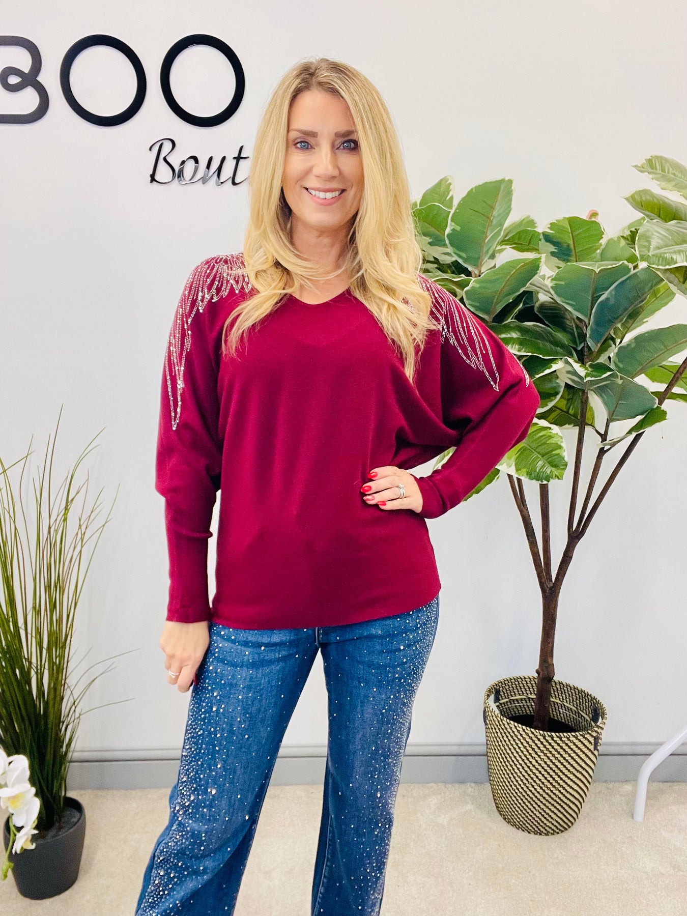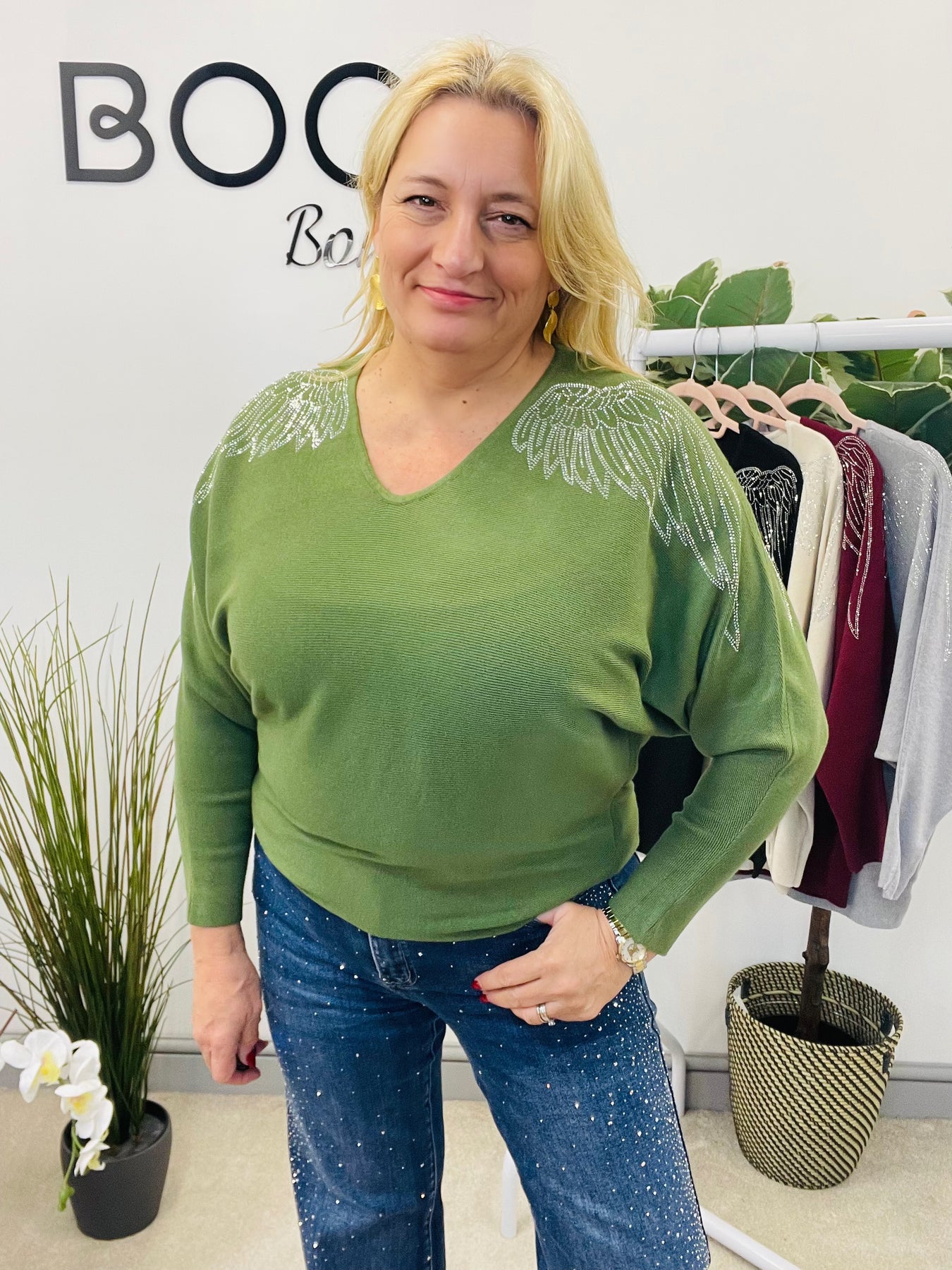 "The CUPID jumper is a must-have for any fashion-forward individual. Made with a soft knit fabric, it boasts batwing sleeves for ultimate comfort and style. The sparkle angel wing shoulder detail adds a touch of glamour to any outfit. This one-size garment fits sizes 8 to 16, making it the perfect versatile piece for any wardrobe."