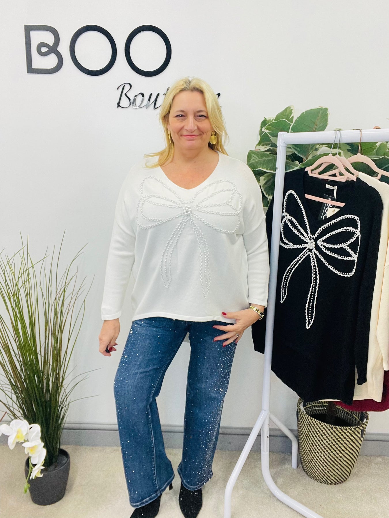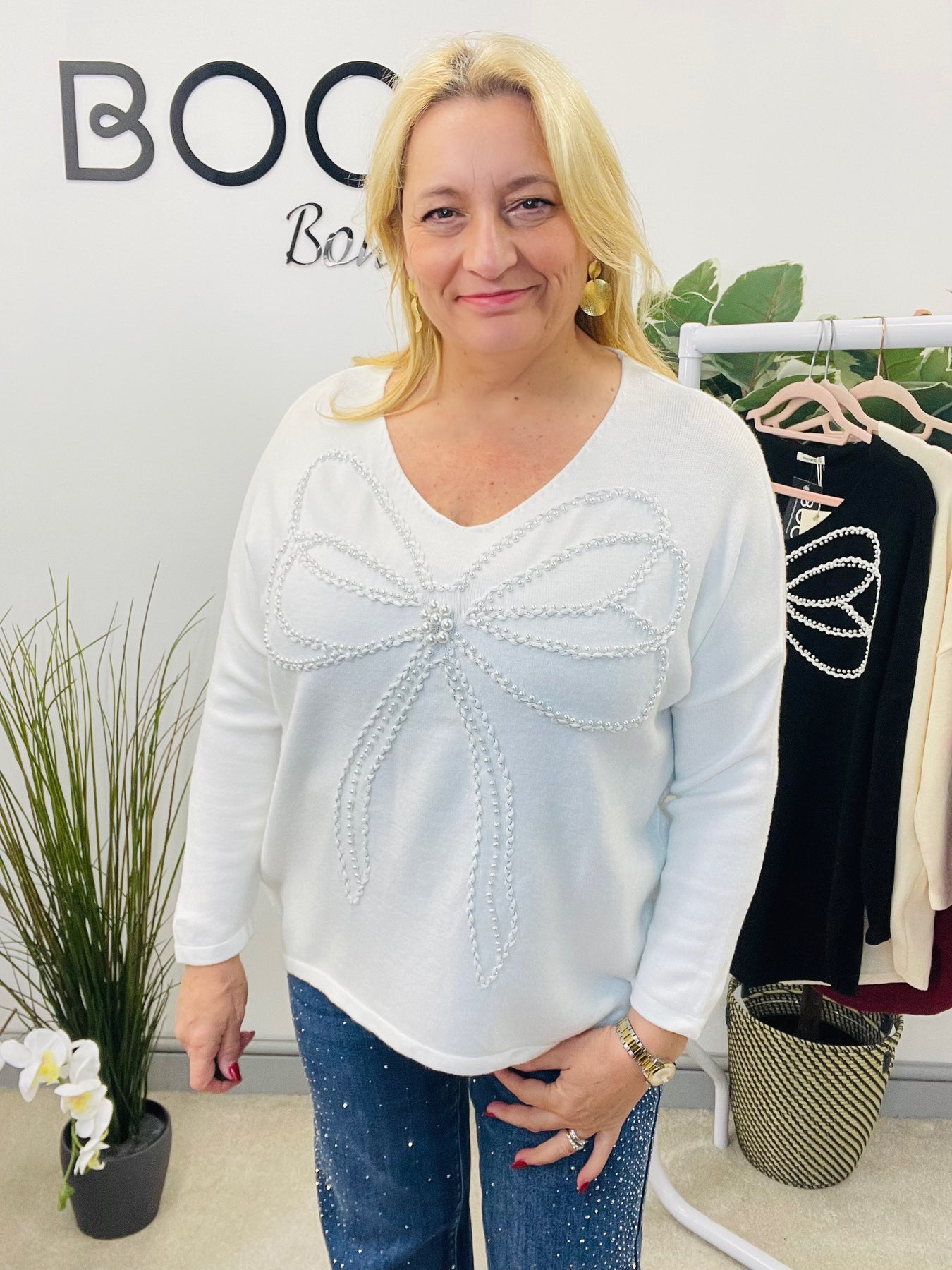 Upgrade your winter wardrobe with our SPECIAL OFFER Snowy Jumper! Made with a soft knit and featuring a loose fit, this jumper is both comfortable and stylish. The pearl bow detail on the front adds a touch of elegance. Available in 4 beautiful colours and one size fits sizes 10 to 20. Stay cozy and chic this season!