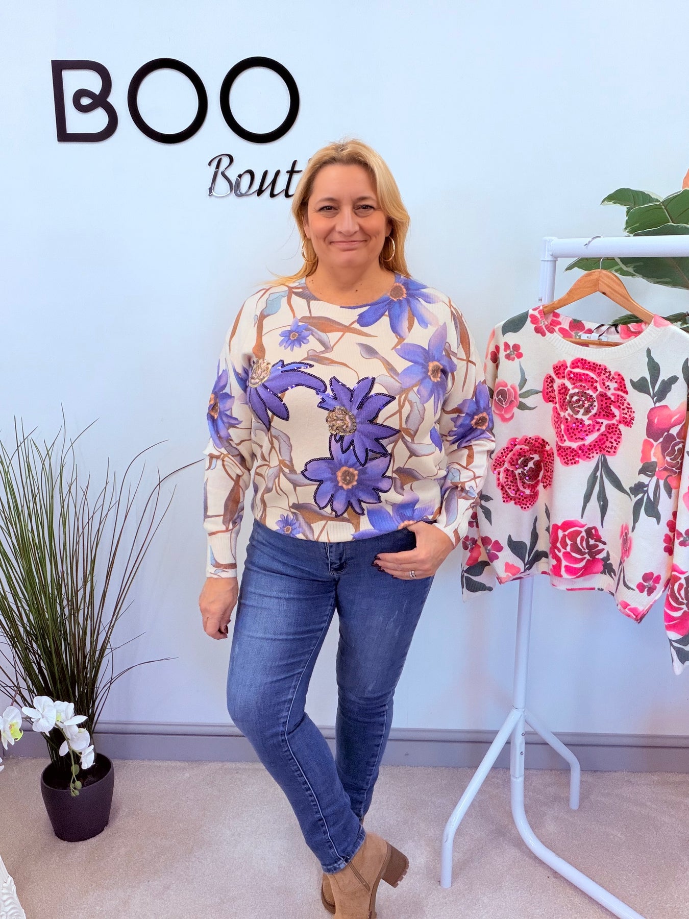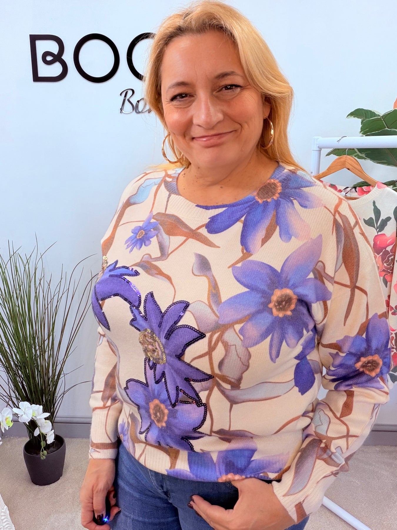 The AMY jumper offers a soft and cozy knit in a cream and purple flower print, accented with delicate sequin detailing. Perfect for staying stylish and comfortable during colder days.
