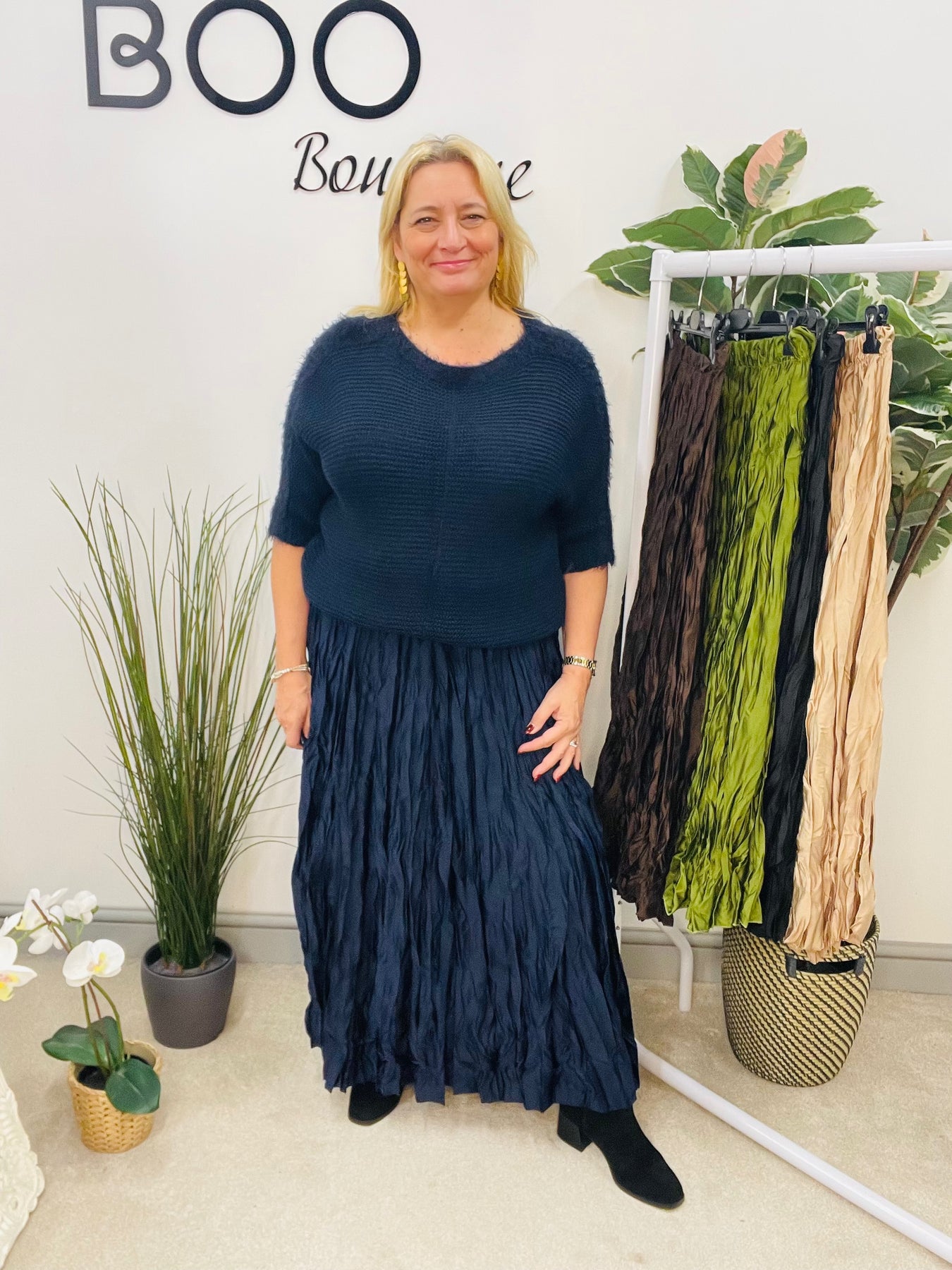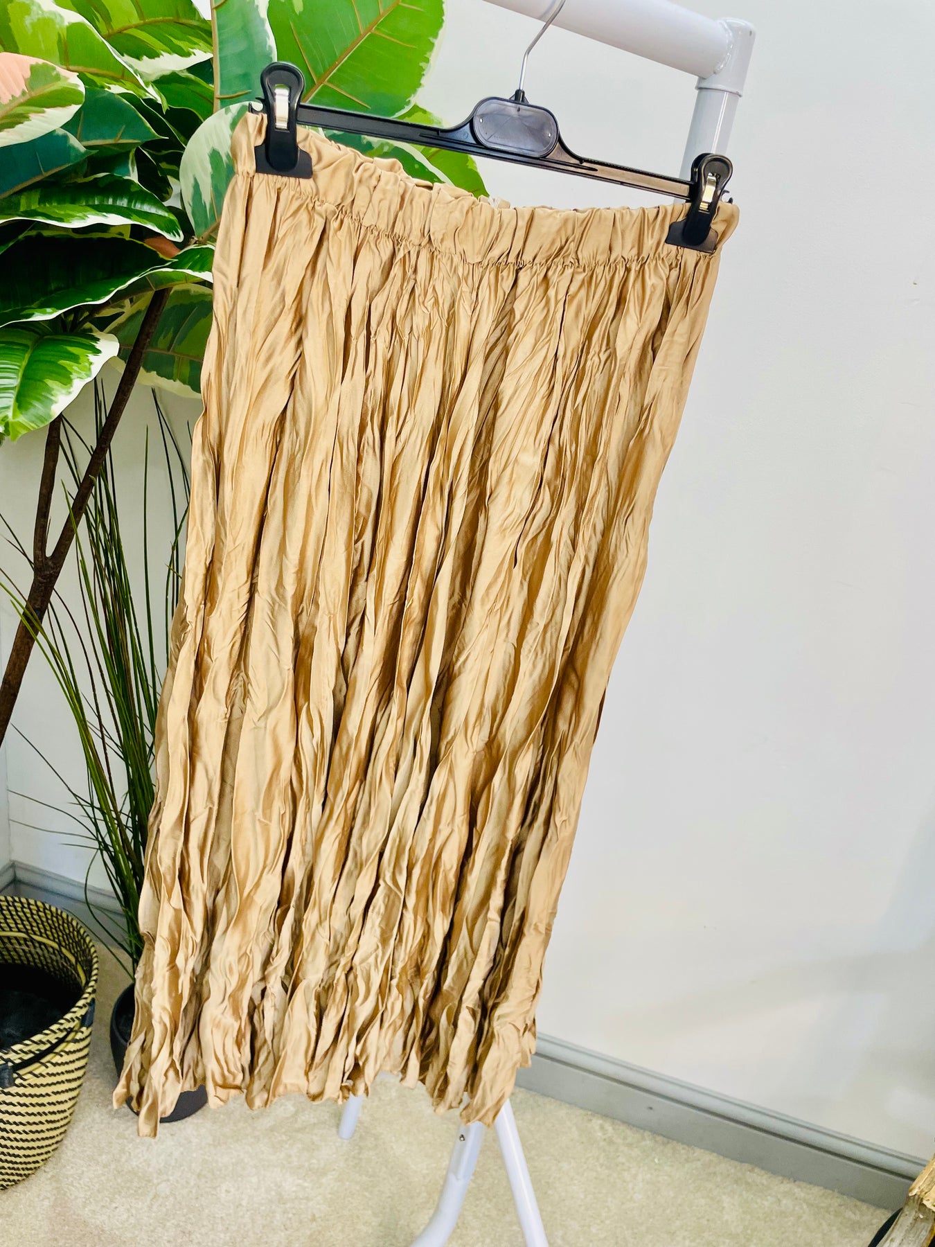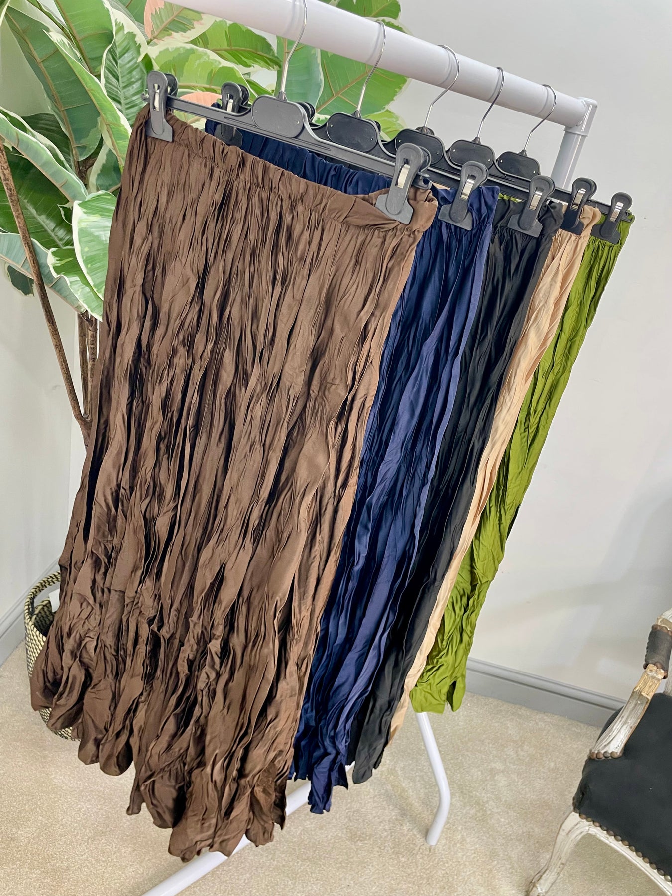 LADIES CRINKLE SATIN MAXI SKIRT - OLIVE, BROWN, NAVY, BLACK, GOLD