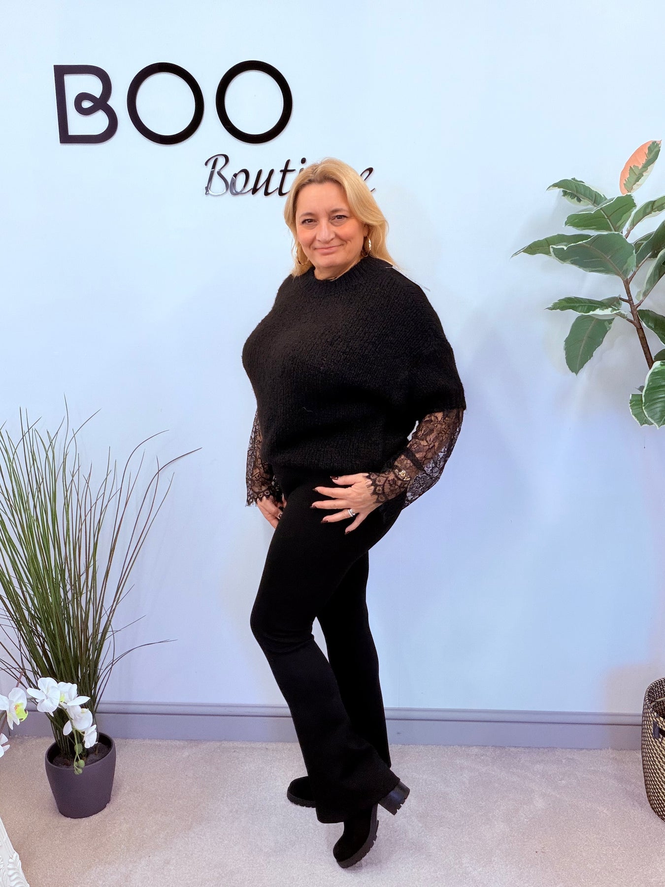 Elevate your winter wardrobe with our CATH black flared trousers. The thick, flared leg design provides both style and warmth, while the wide waistband offers comfort and a flattering fit. A must-have essential for the colder months.