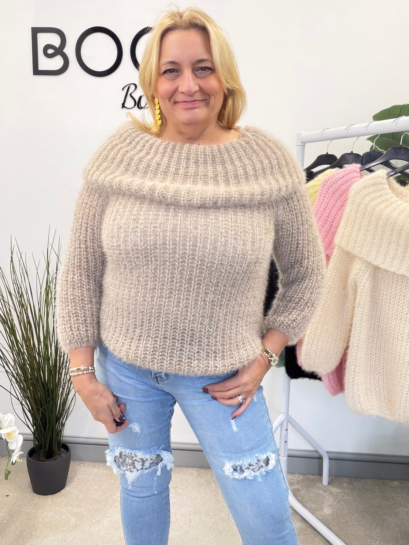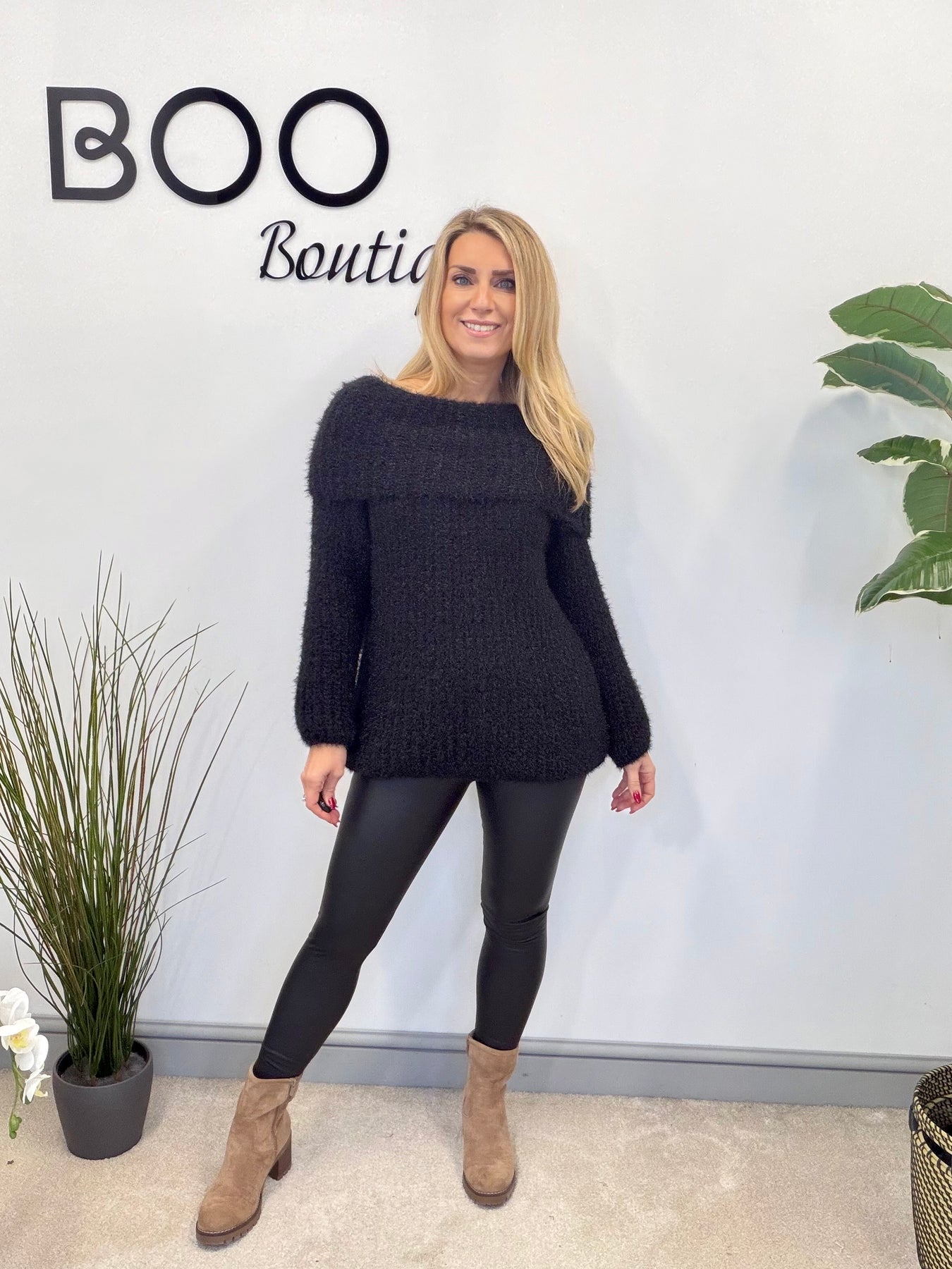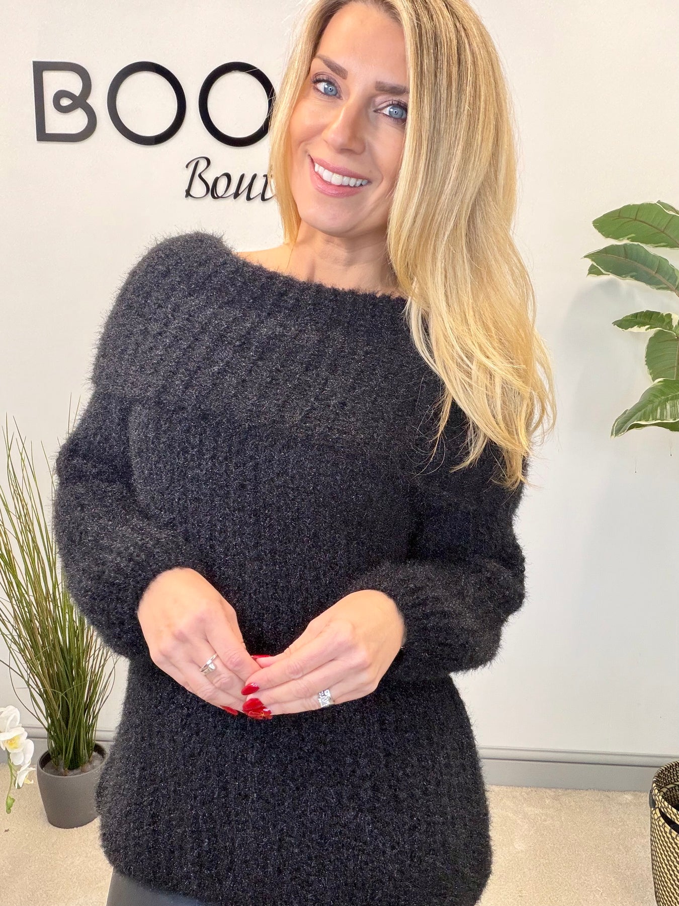 LADIES FLUFFY KNIT BARDOT JUMPER - MINT, BLACK, CREAM, PINK, LEMON & MOCHA