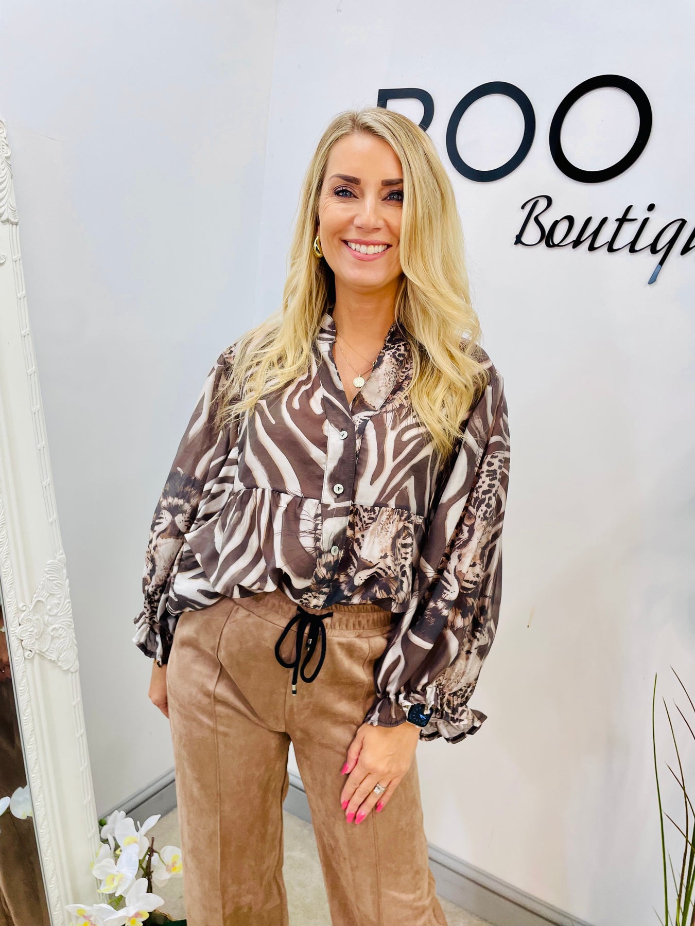 LADIES ZEBRA & LEOPARD PRINT LOOSE FIT BLOUSE TOP - BURGUNDY, BLACK & BEIGE