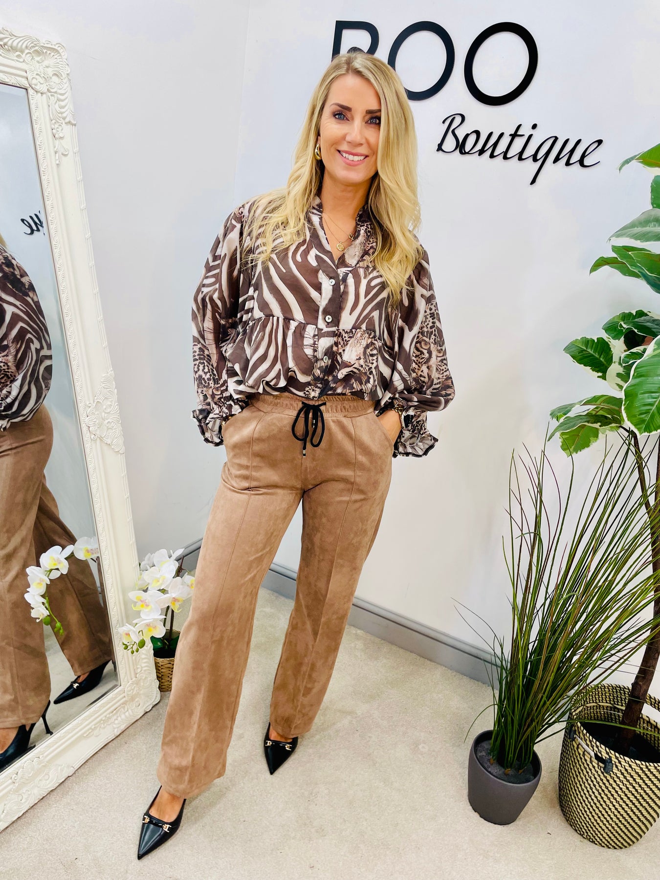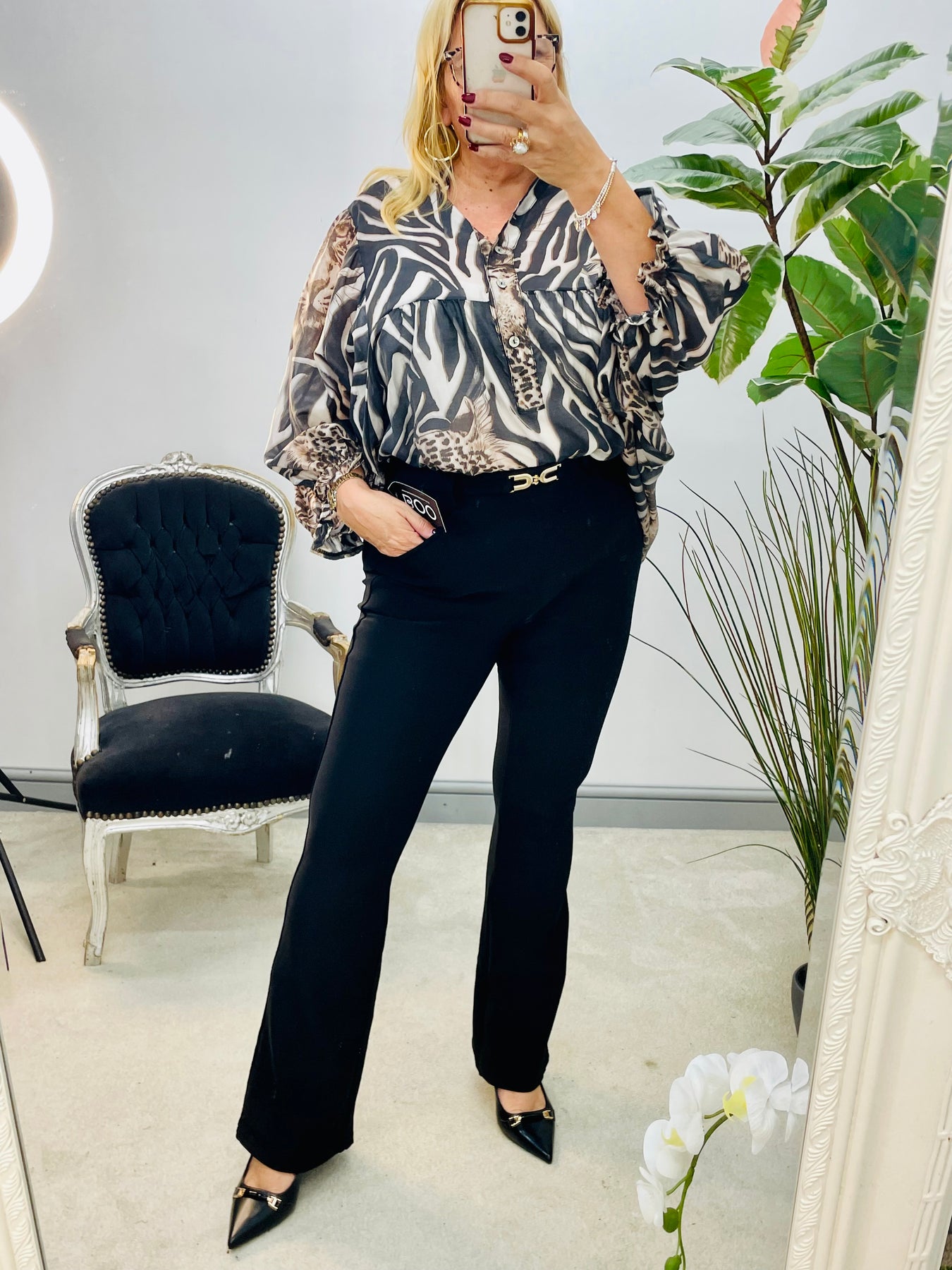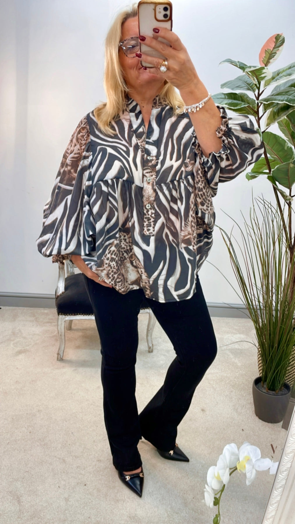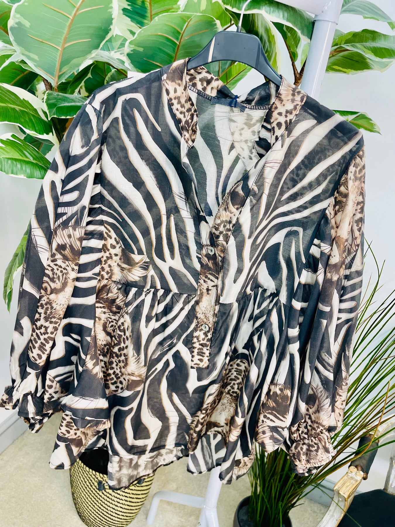 The HANNAH top boasts a bold zebra print with a touch of leopard. Its grandad style collar and button-up front add a sophisticated touch. Available in one size, it's perfect for sizes 8 to 18. Elevate your wardrobe with this stunning blouse.
