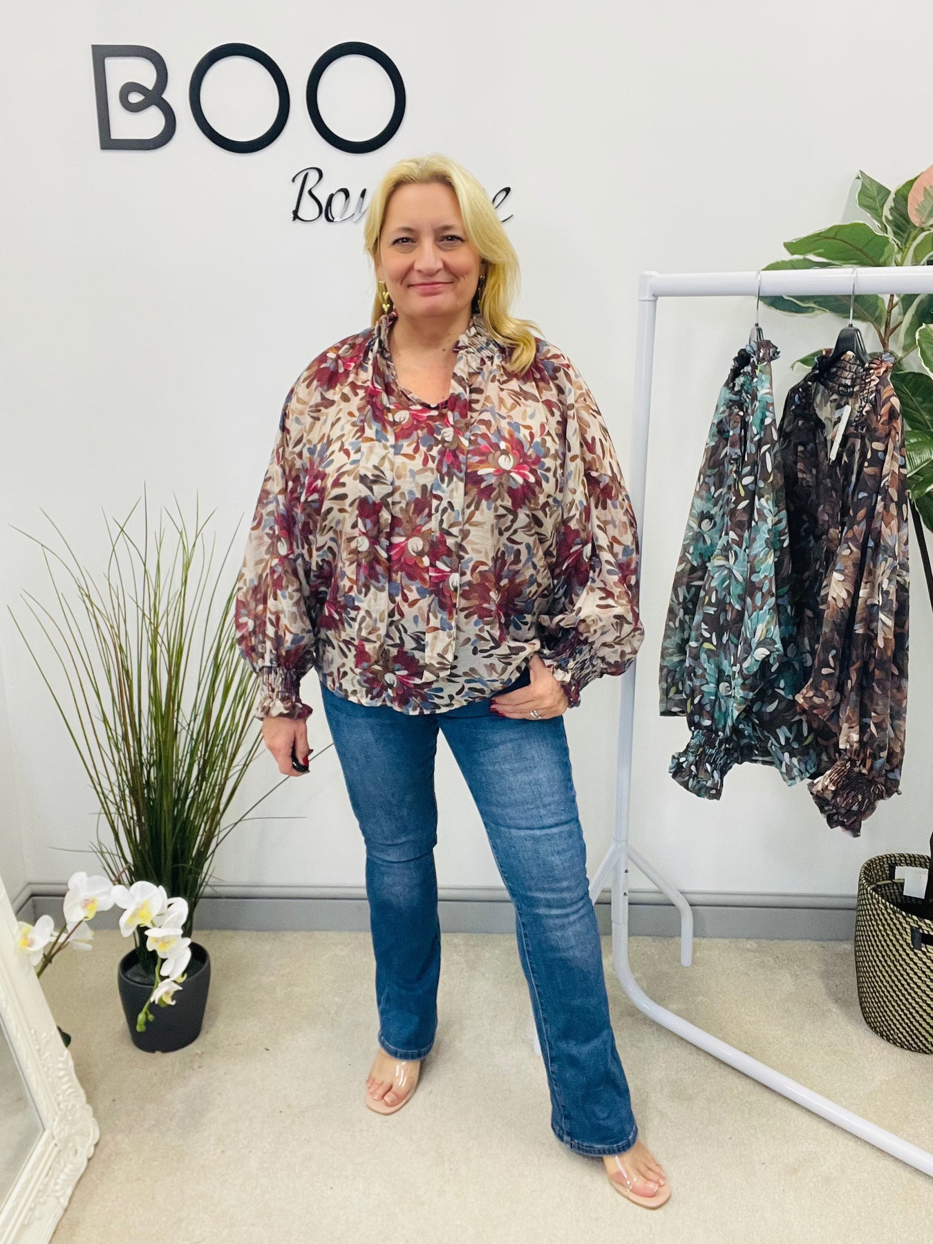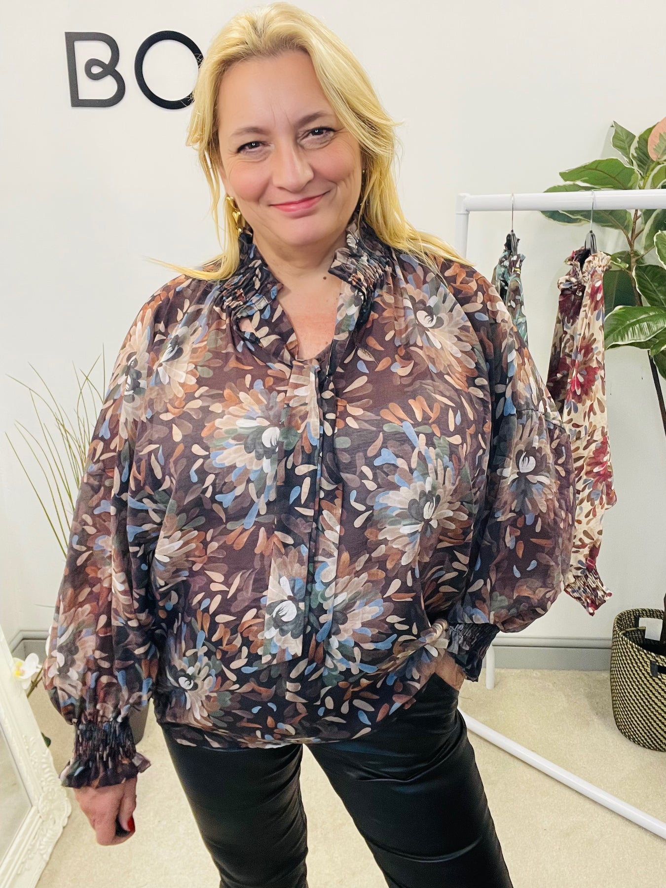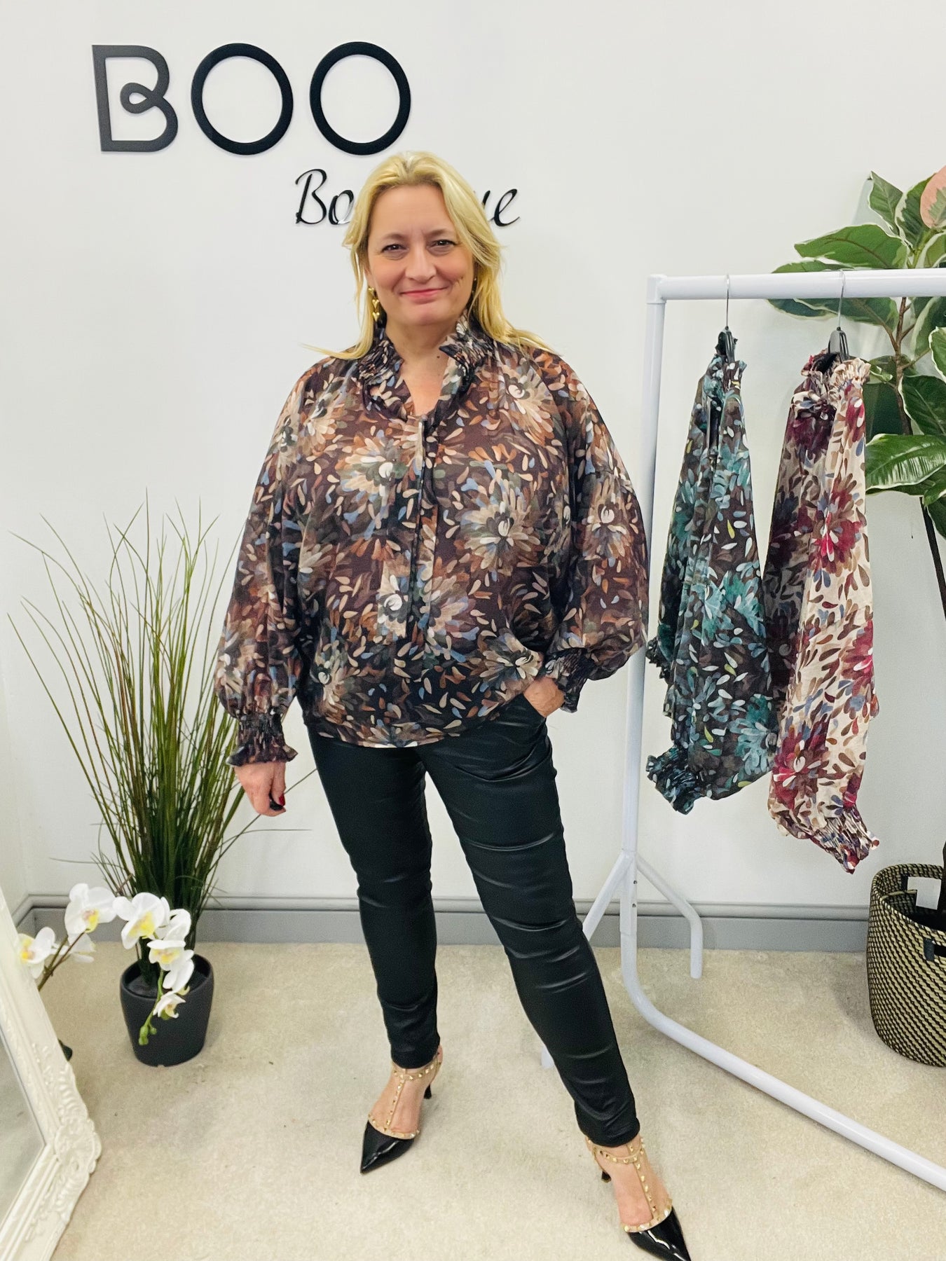 LADIES LEAF PRINT HIGH NECK BLOUSE - BEIGE, BROWN, TEAL