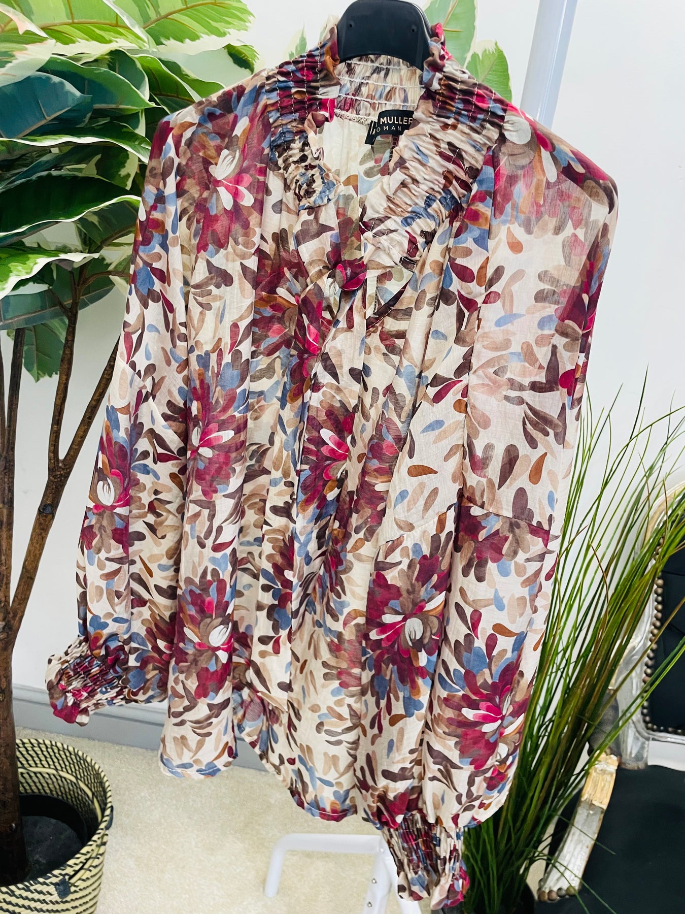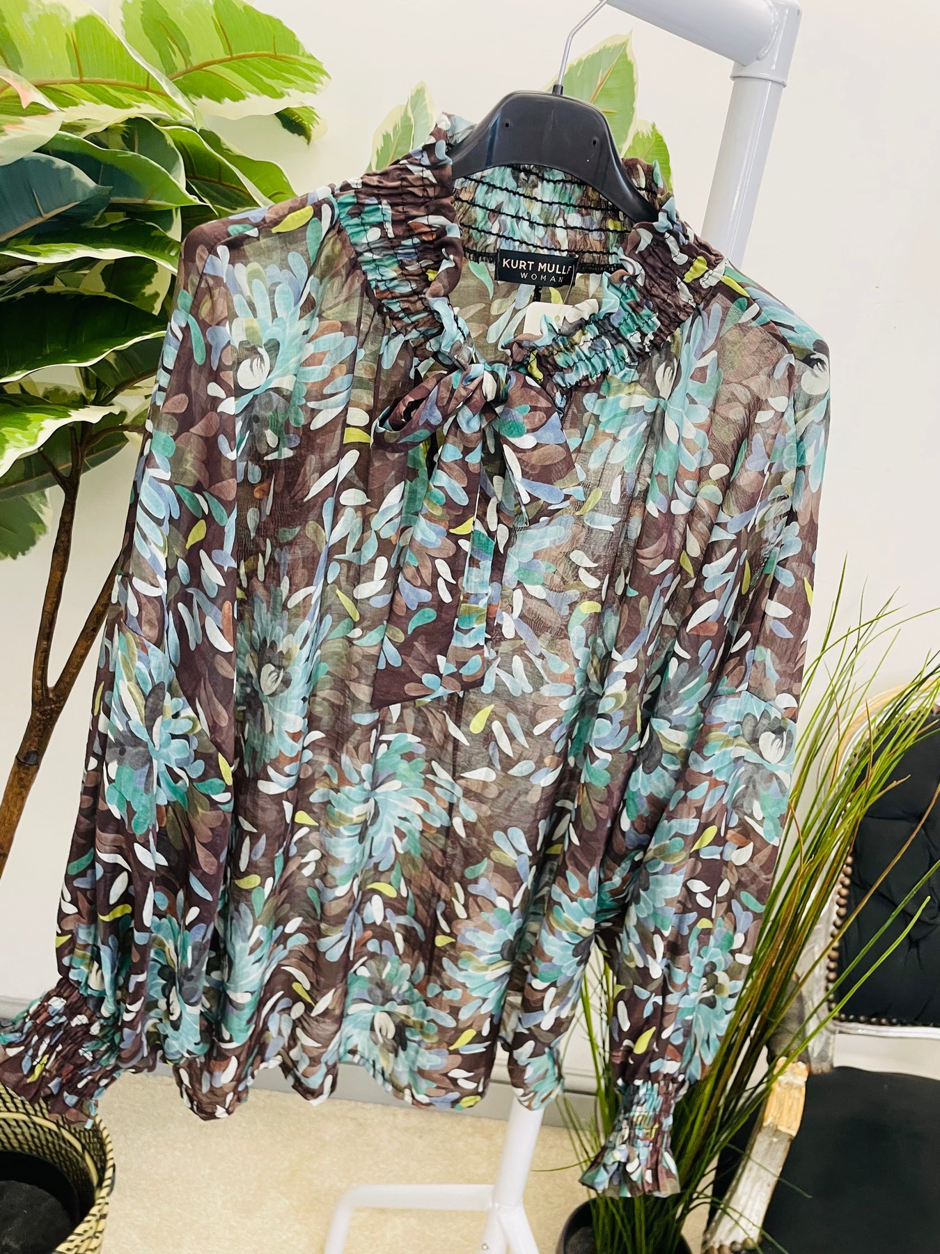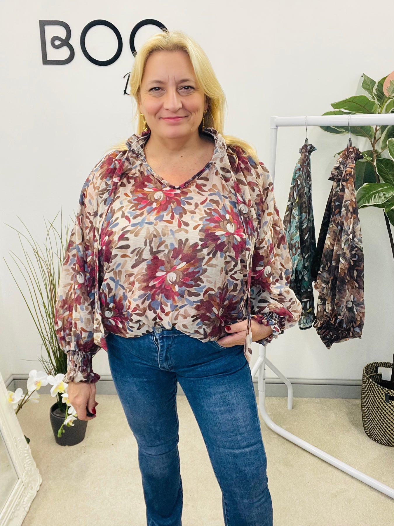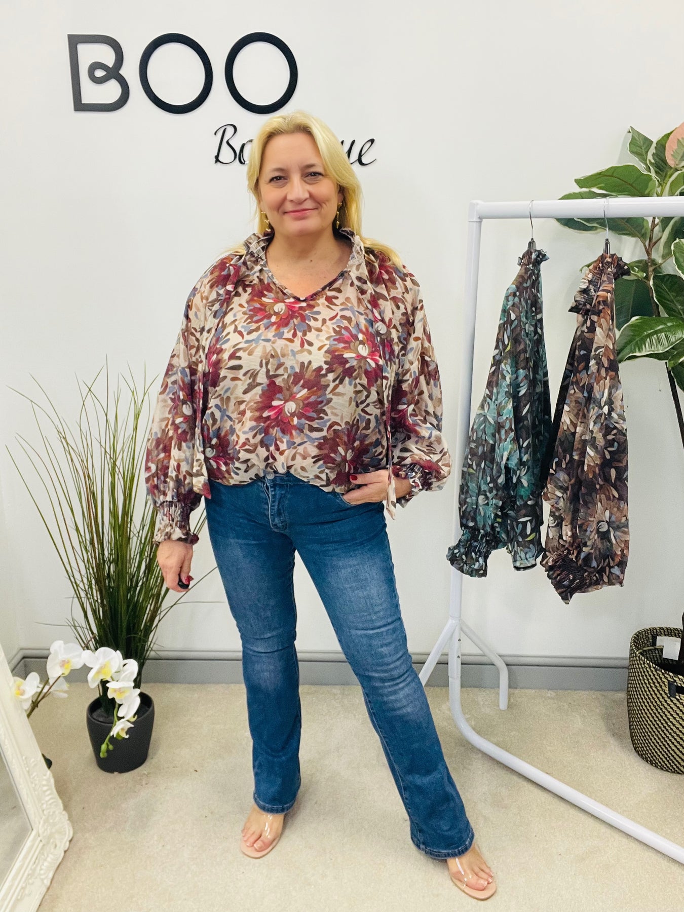 LADIES LEAF PRINT HIGH NECK BLOUSE - BEIGE, BROWN, TEAL